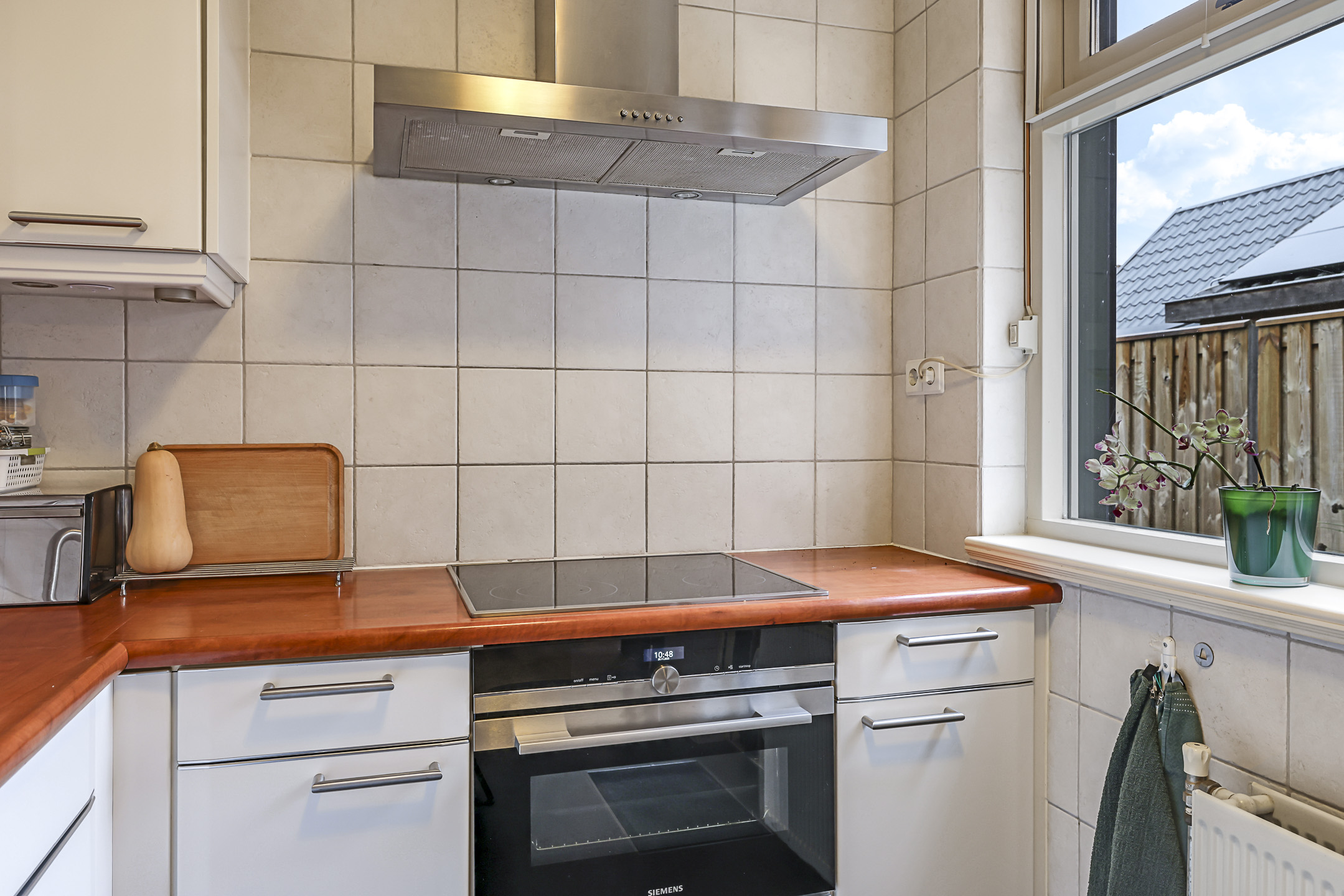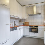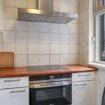 De keuken bevindt zich aan de achterzijde van de woning en is in de ‘uitbouw’ gesitueerd. Het betreft hier een halfopen keuken waardoor deze nog wel in verbinding staat met de woonkamer, maar tevens ook eigen ruimte betreft. De keuken is in een hoekopstelling geplaatst en daarbij voorzien van de wenselijke inbouwapparatuur, zijnde een vaatwasser (defect), een keramische 4-pits kookplaat, een afzuigkap, een oven en een koelkast. De keuken is voorzien van een tuindeur waardoor je direct toegang hebt tot de achtertuin.