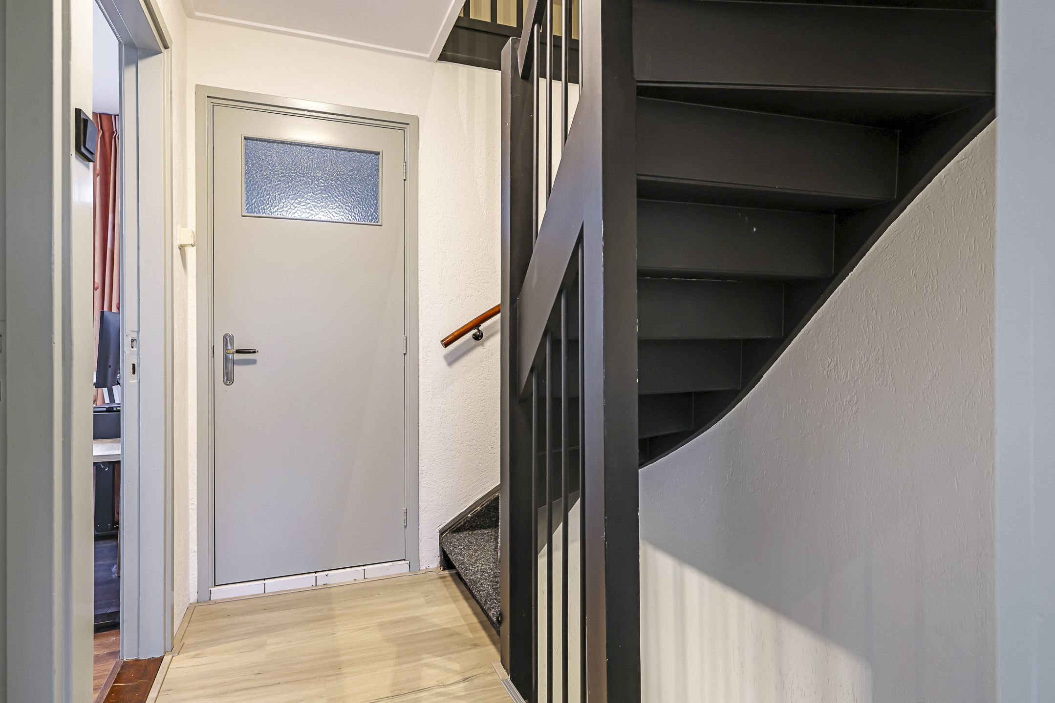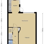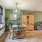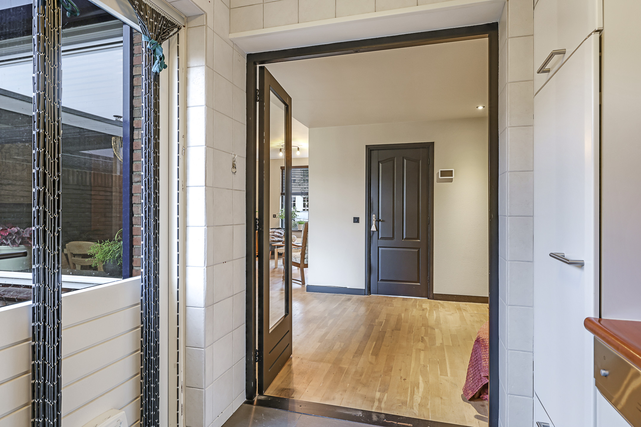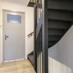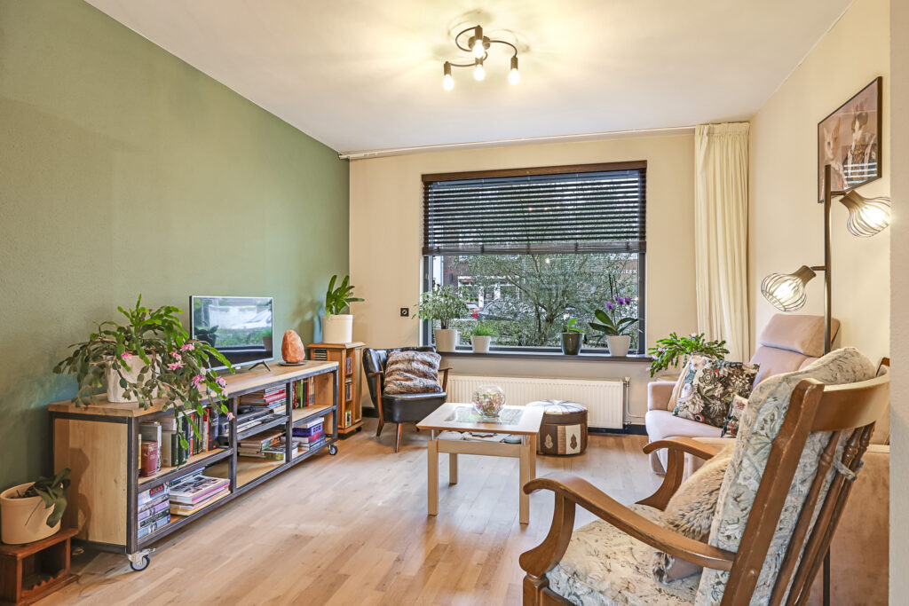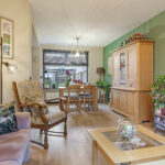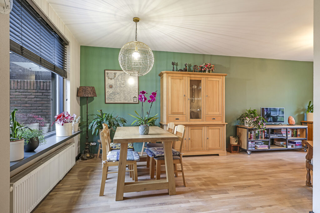 De woonkamer van deze woning betreft een ruime L-vormige woonkamer. Door de praktische indeling kan er gespeeld worden met de inrichting, de eethoek en de zithoek kunnen eenvoudig gewisseld worden waardoor de indeling niet standaard blijft. Doordat de keuken in de ‘uitbouw’ is geplaatst heb je hier meer ruimte dan bij de gemiddelde woning. Op de vloer ligt een houten vloer wat een warme uitstraling geeft. Grote raampartijen maken dit een echte doorzonwoonkamer. In de hal is, naast het toilet en de meterkast, een verdiepte trapkast aanwezig wat veel praktische opbergruimte biedt.