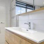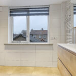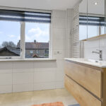 Zoals benoemd heeft de woning van origine een kleinere badkamer. Om meer ruimte te krijgen is bij deze woning de badkamer verplaatst naar een slaapkamer. Hierdoor is er een prettige ruimte beschikbaar gekomen waardoor de badkamer is voorzien van een ruime inloopdouche en een breed wastafelmeubel. Er zijn tevens witgoedaansluitingen geplaatst waardoor je de mogelijkheid hebt om hier de wasmachine te plaatsen. De ruimte is in 2022 gerenoveerd en heeft dan ook een moderne, luxe uitstraling.