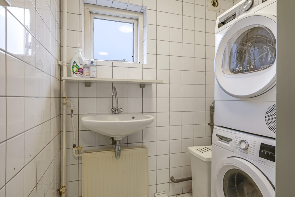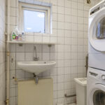 De oorspronkelijke badkamer is nu in gebruik als wasruimte, hier zijn de aansluitingen voor de wasmachine en de wasdroger. Ook is er een wastafel aanwezig.
