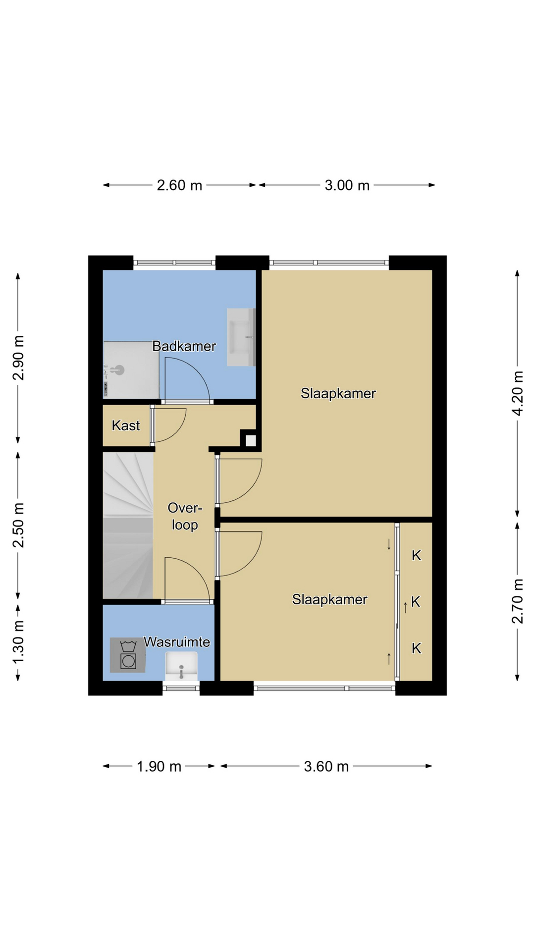 Via de trapopgang in de hal komen we op de 1e verdieping terecht, hier schakelt de overloop 2 slaapkamers, een badkamer en een wasruimte aan elkaar. Op de overloop is een vaste kast aanwezig voor extra opbergruimte. Van oorsprong waren er 3 slaapkamers op deze verdieping, bij deze woning is een van de slaapkamers opgeofferd om een ruime badkamer te creëren. De slaapkamers hebben beiden een goed formaat, ca. 13m2 en 10m2 groot.