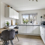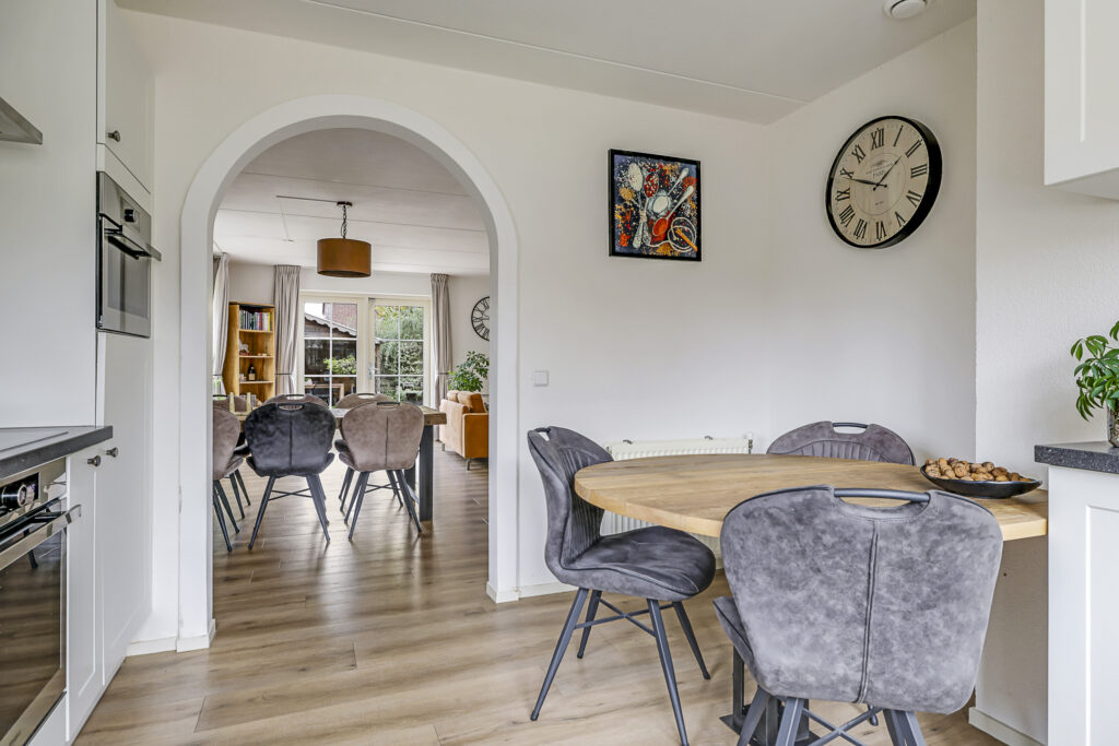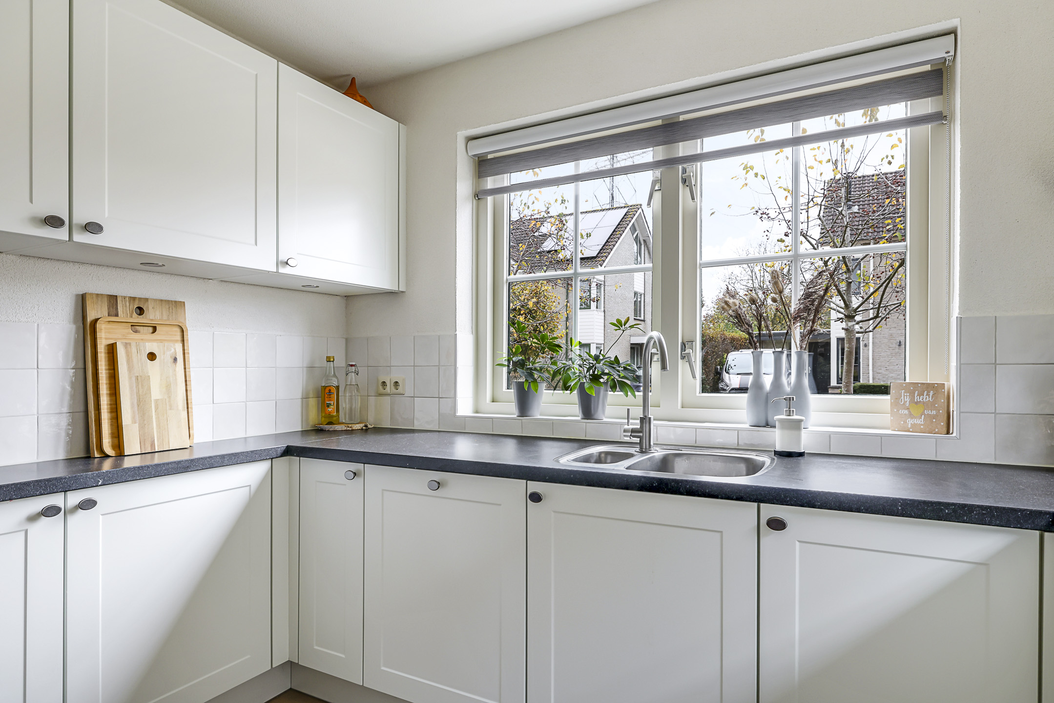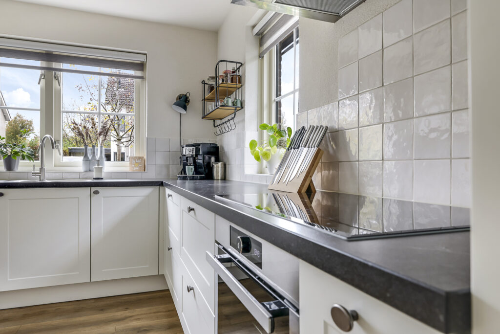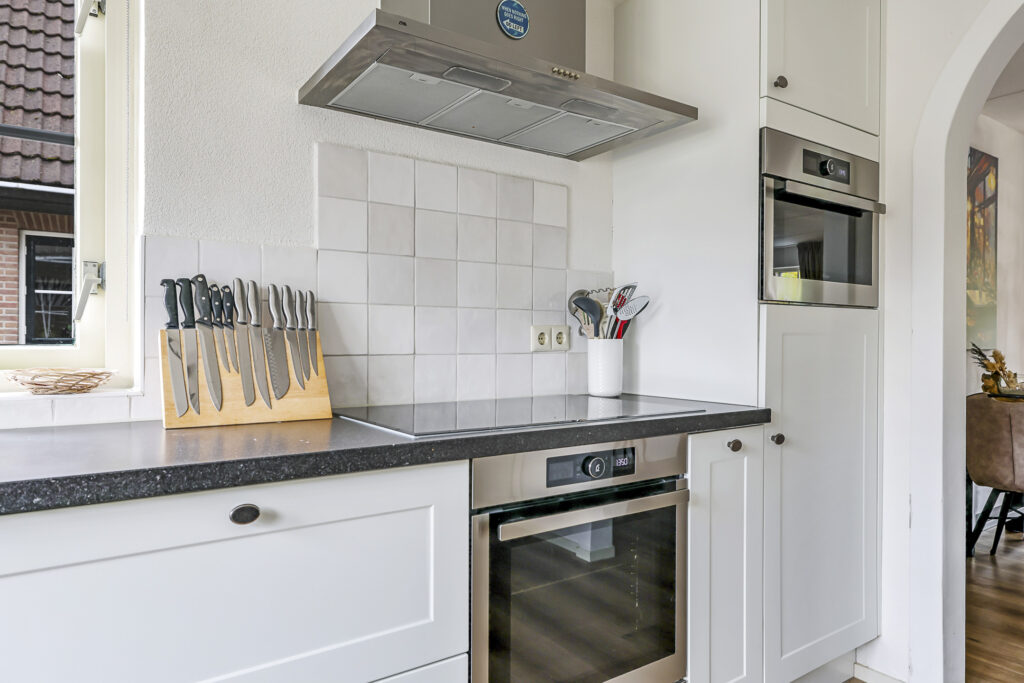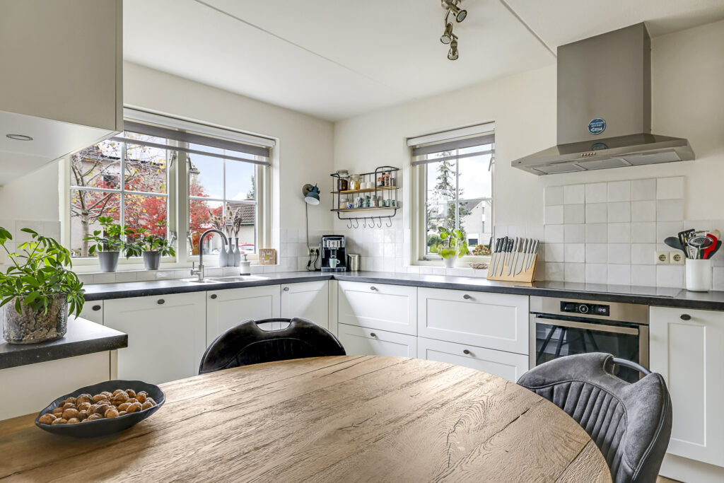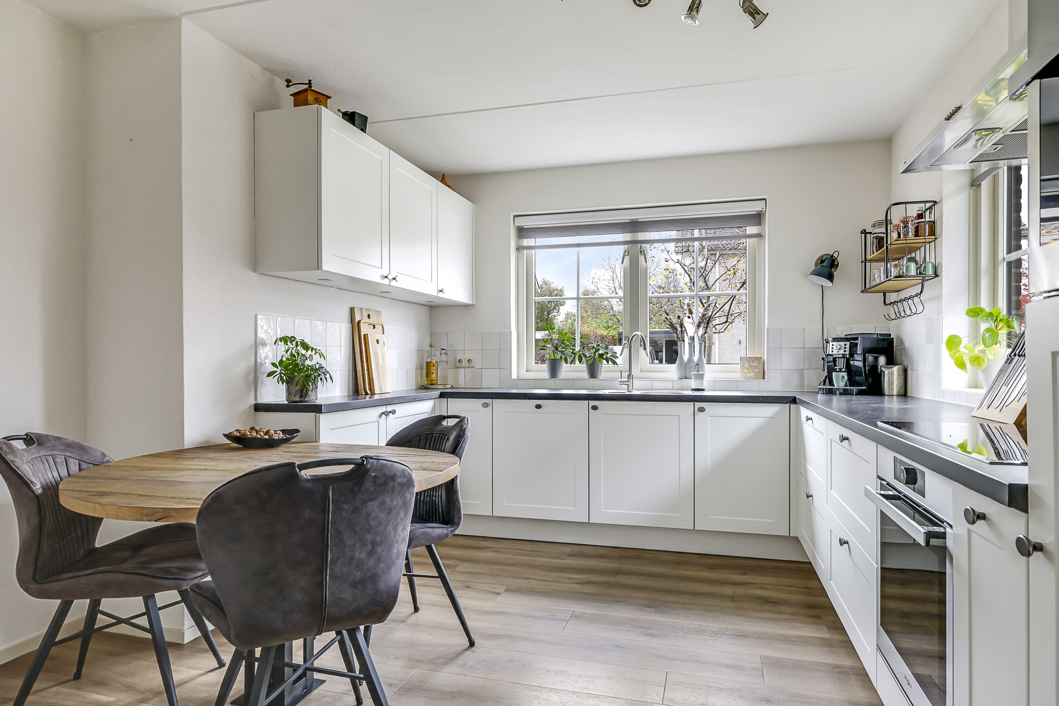 De keuken heeft een ruime U-opstelling en is in 2021 vernieuwd. Het geheel heeft een neutrale, tijdloze uitstraling met strakke fronten en een natuurstenen werkblad van composiet. De indeling is doordacht, met een draaicarrousel, apothekerskast en volop kastruimte.