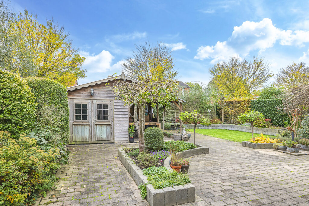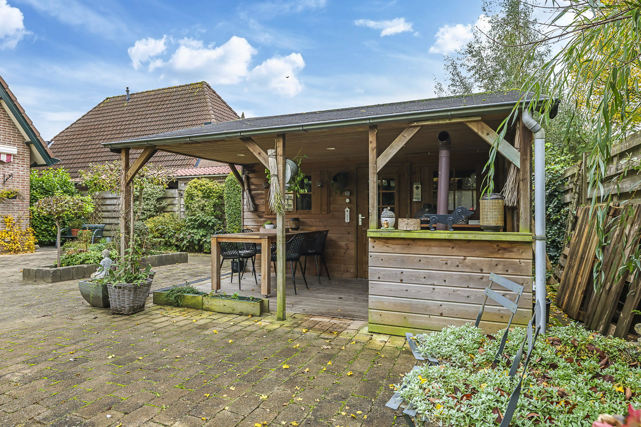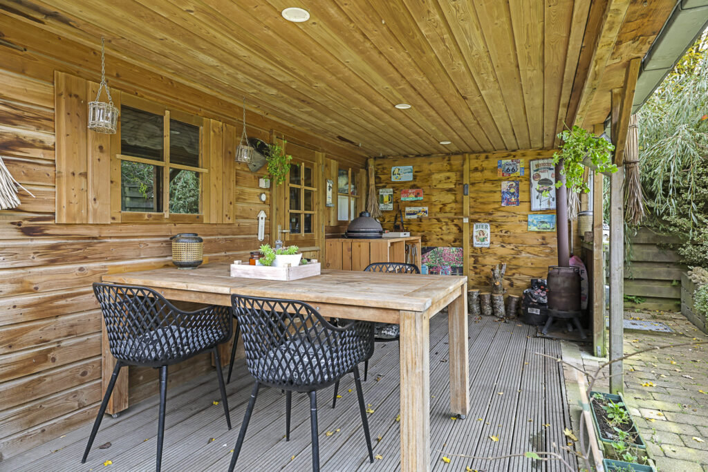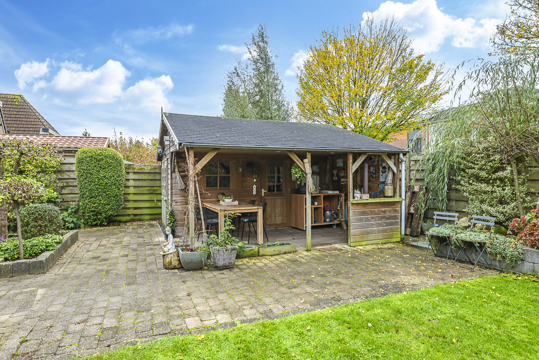 Achter in de tuin staat een tuinhuis met veranda (4,5m x 3m) dat is voorzien van dubbele deuren, elektra, een bergzolder en voldoende ruimte voor hobby of opslag.
