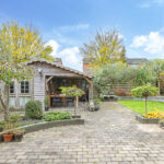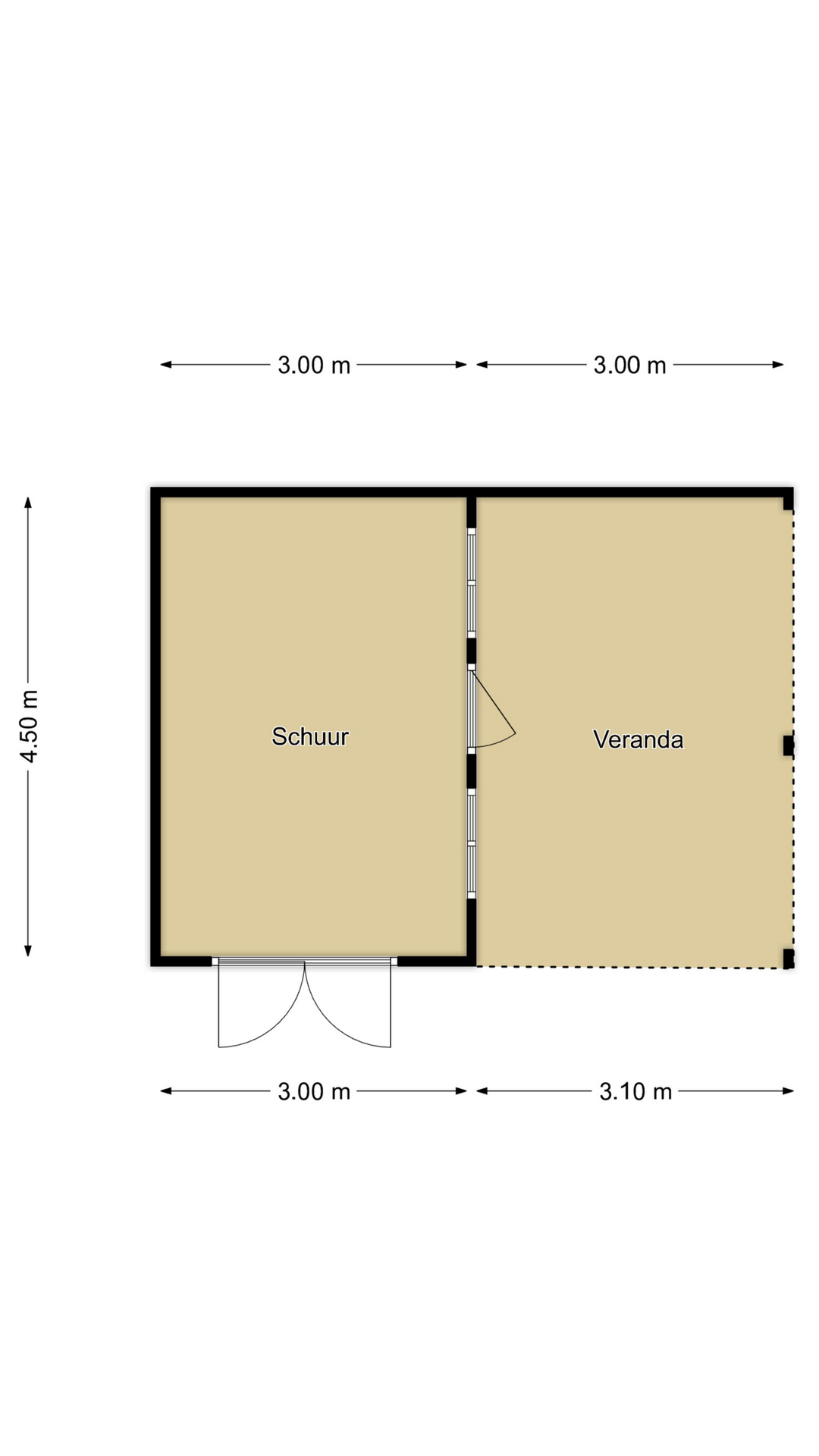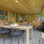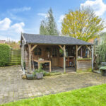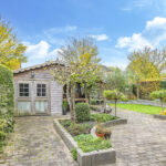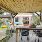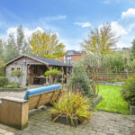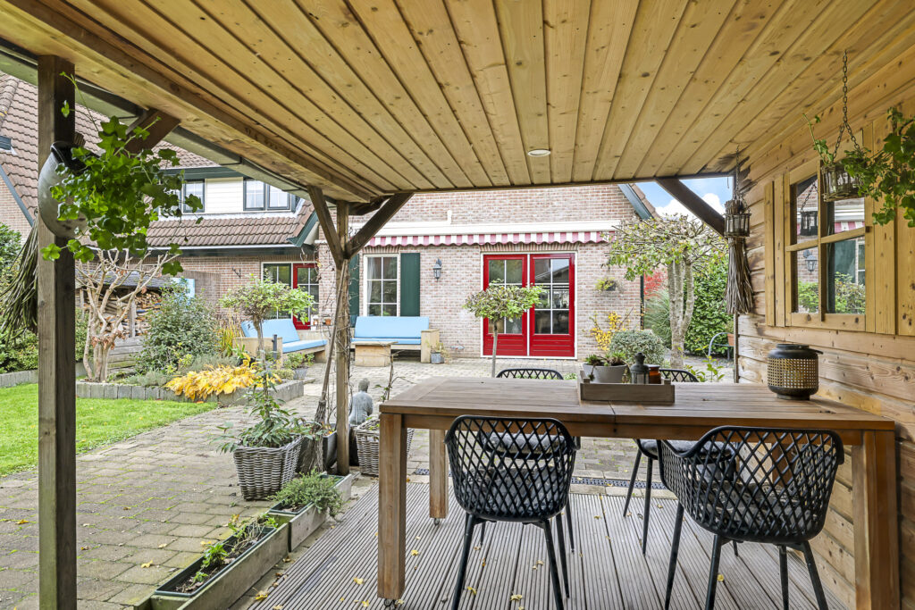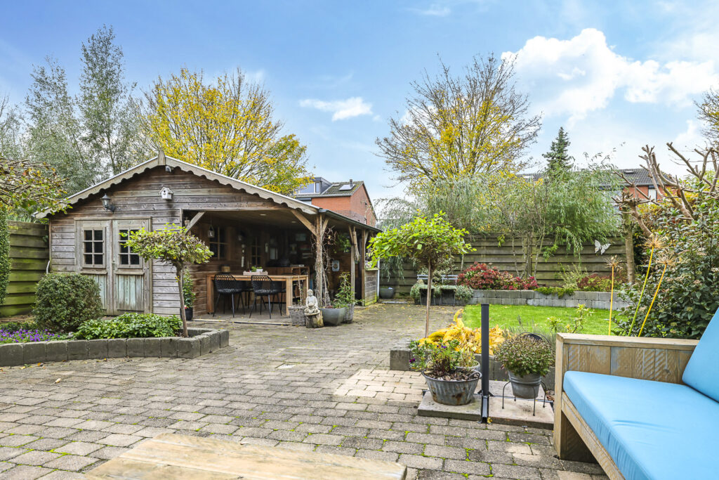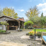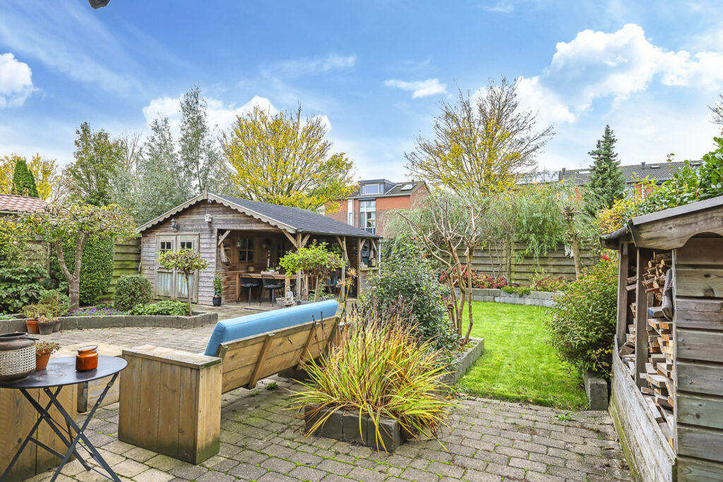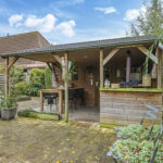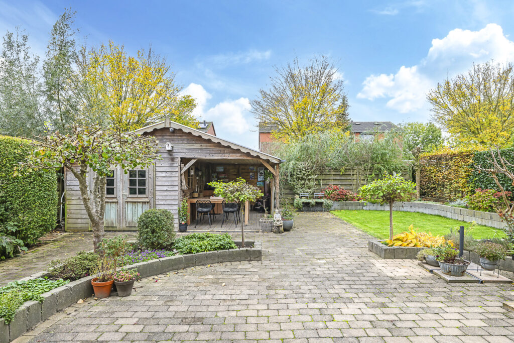 Achter in de tuin staat een tuinhuis met veranda (4,5m x 3m) dat is voorzien van dubbele deuren, elektra, een bergzolder en voldoende ruimte voor hobby of opslag.