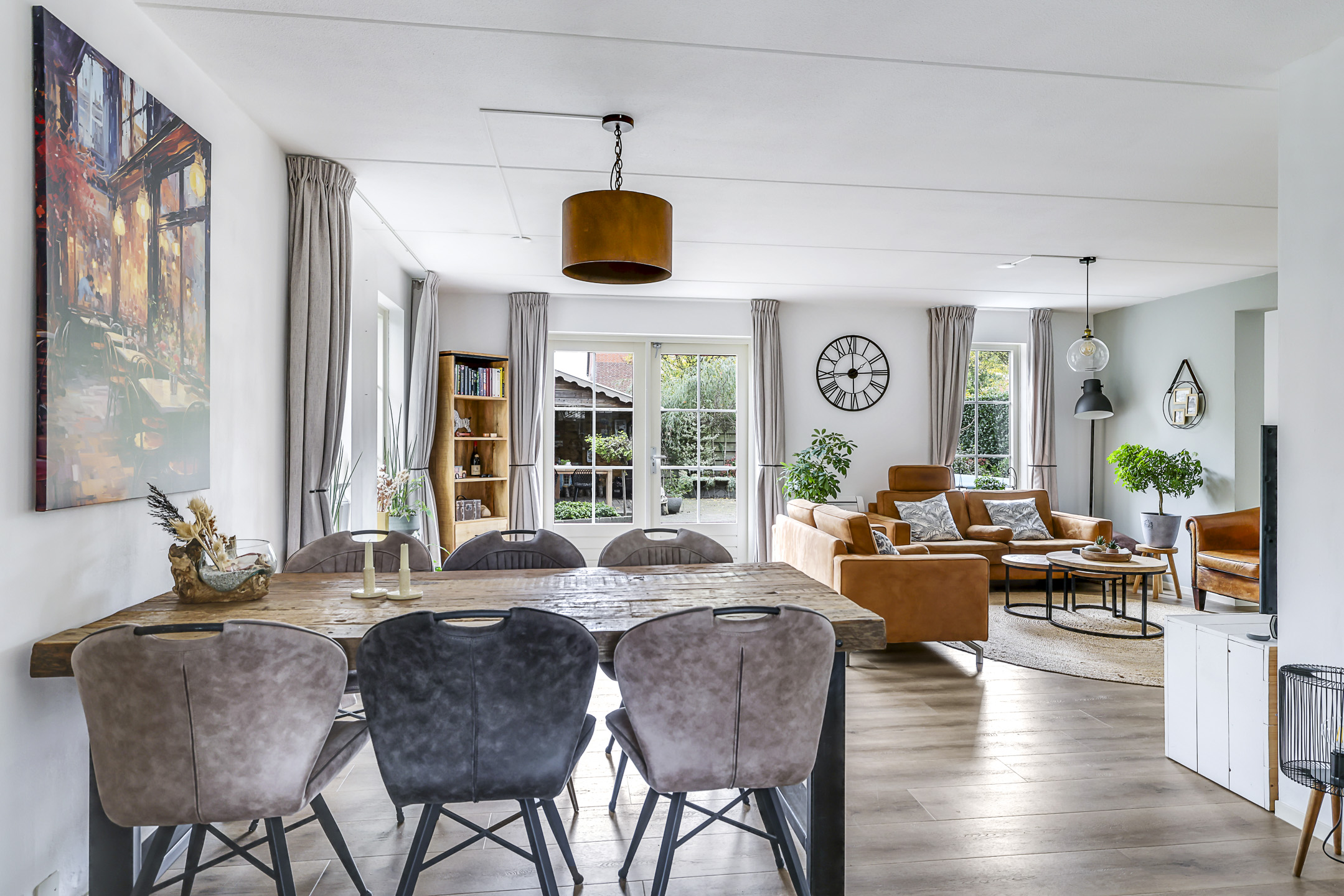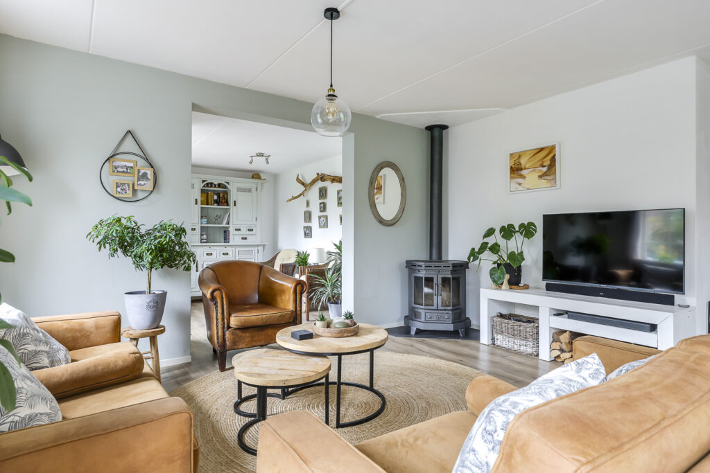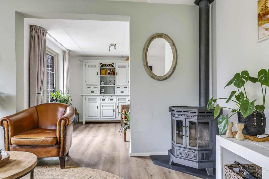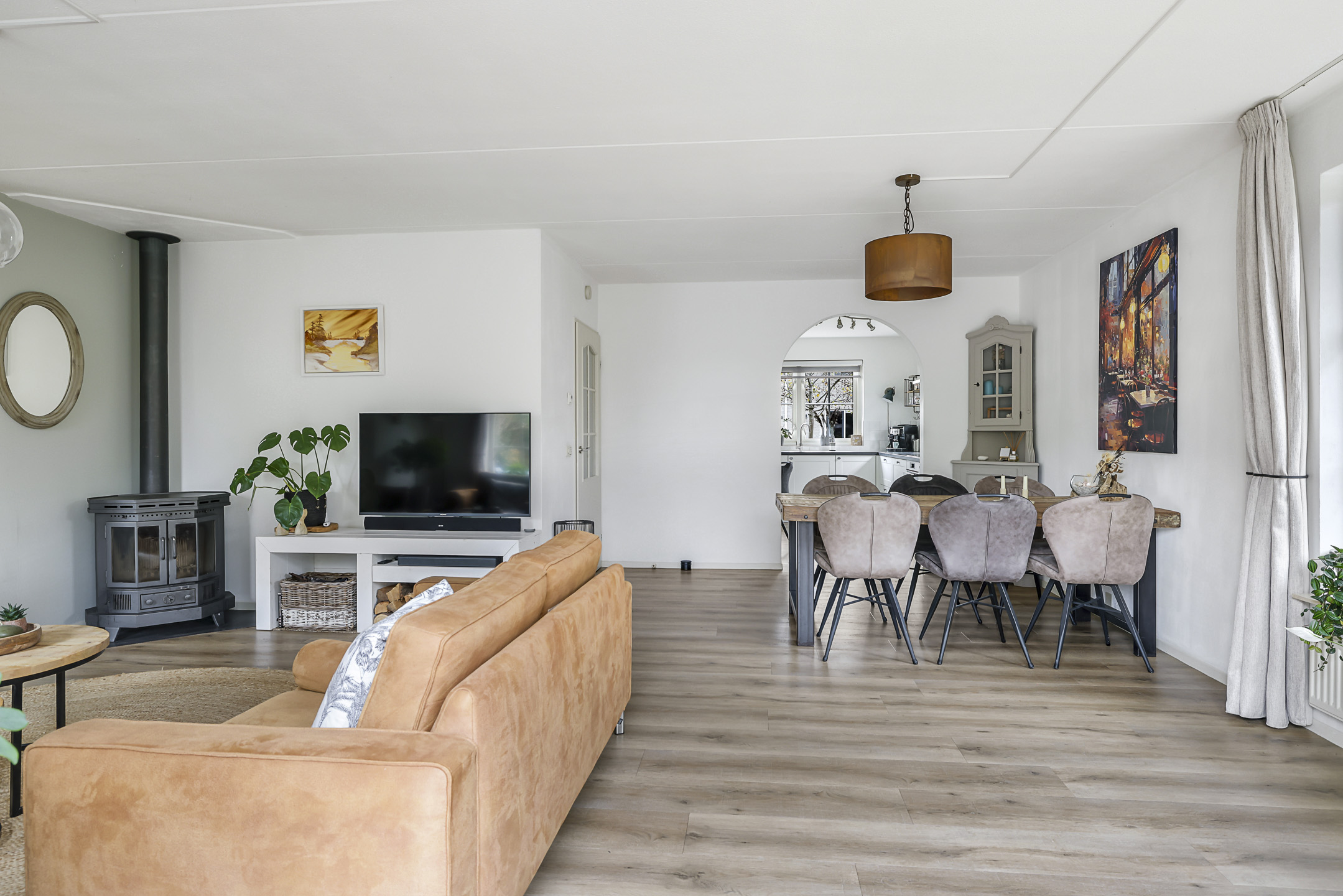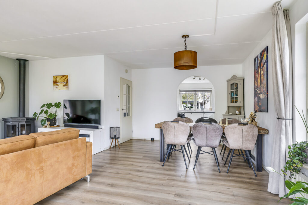 De PVC-vloer met vloerverwarming (door de gehele begane grond, met uitzondering van toilet en garage) zorgt voor een behaaglijk binnenklimaat. Een sfeervolle houtkachel vormt het middelpunt van de zithoek en geeft de ruimte een warme uitstraling. De woonkamer is praktisch in te delen en biedt voldoende plek voor een royale zithoek én een grote eettafel.