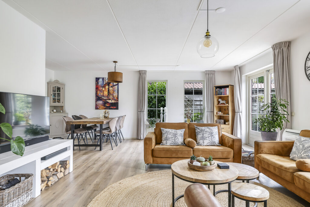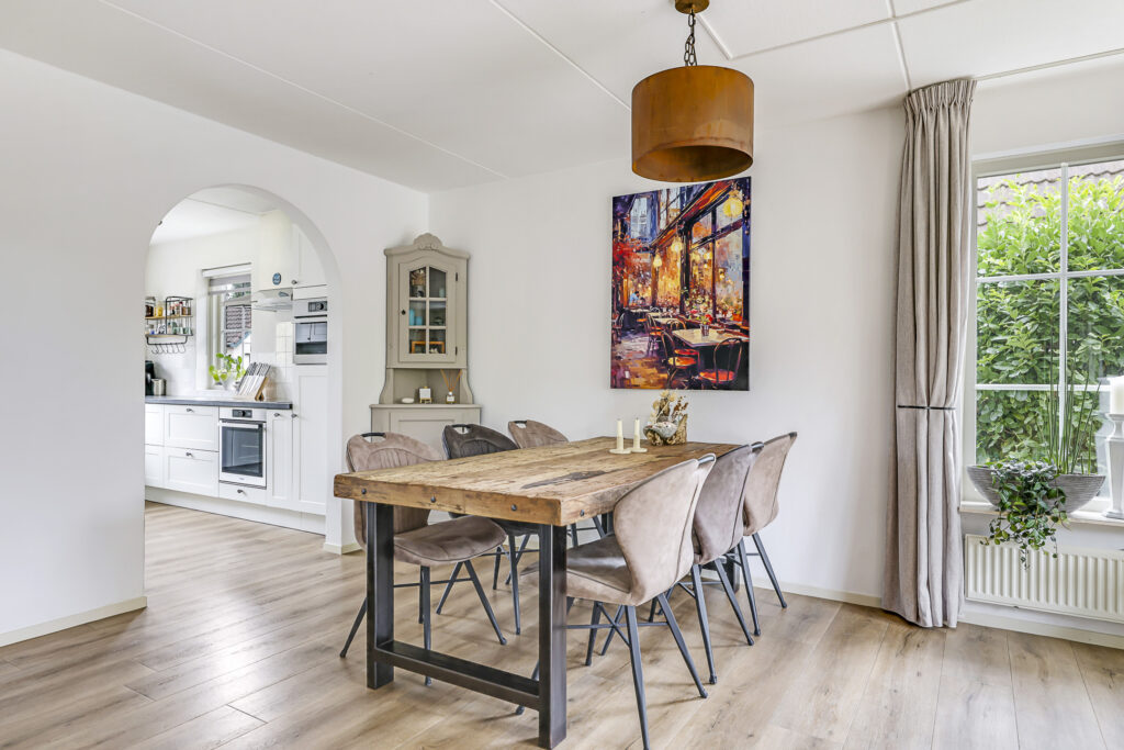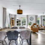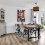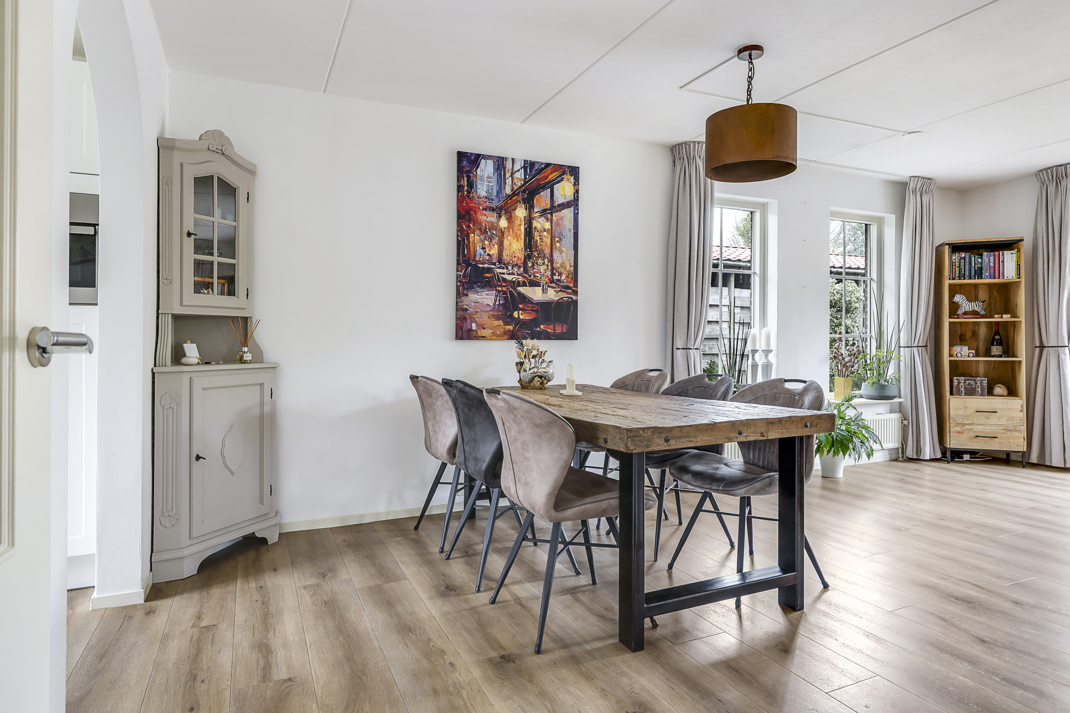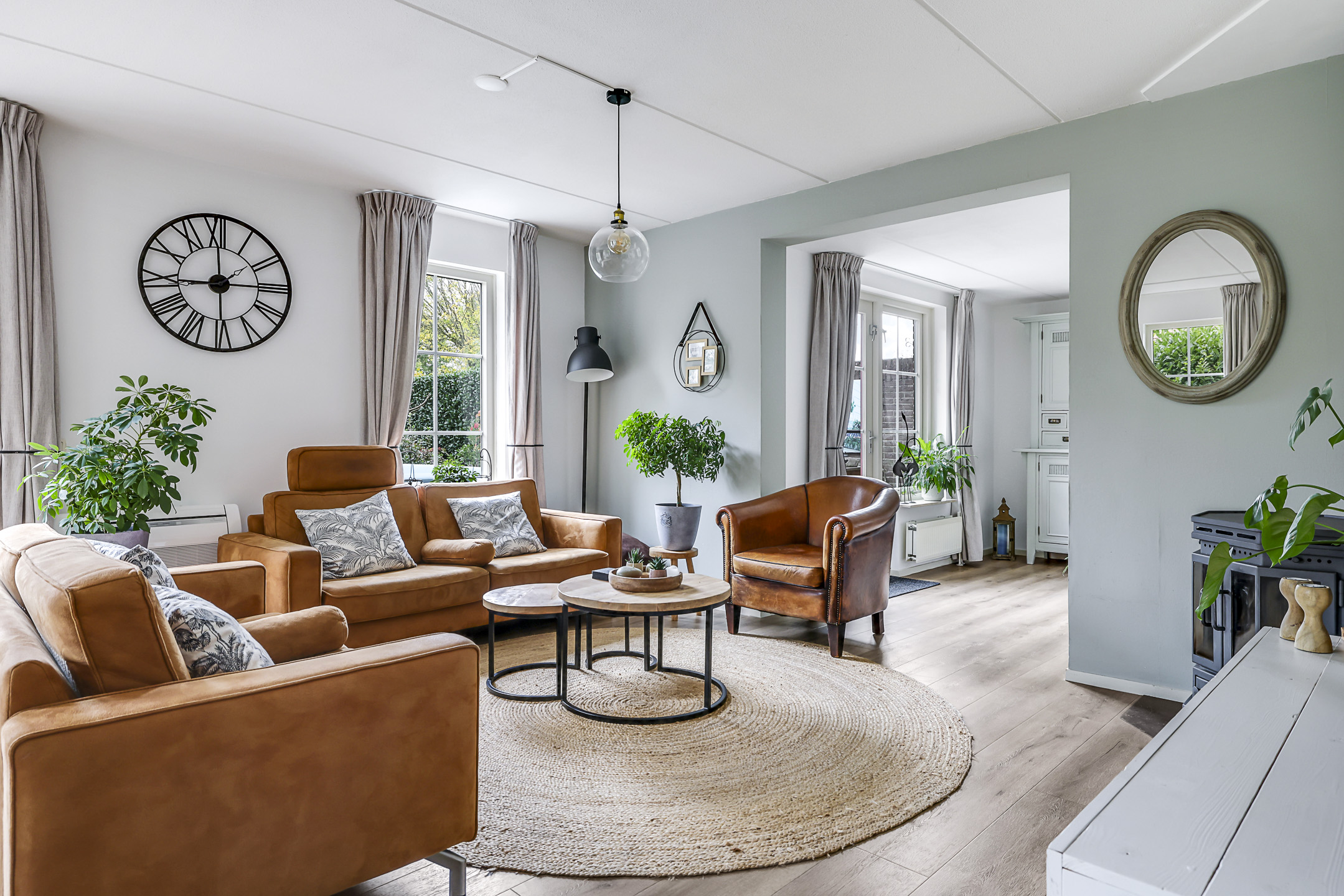 De PVC-vloer met vloerverwarming (door de gehele begane grond, met uitzondering van toilet en garage) zorgt voor een behaaglijk binnenklimaat. Een sfeervolle houtkachel vormt het middelpunt van de zithoek en geeft de ruimte een warme uitstraling. De woonkamer is praktisch in te delen en biedt voldoende plek voor een royale zithoek én een grote eettafel.