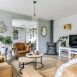 Ruime woonkamer met houtkachel, dubbele terrasdeuren en airconditioning