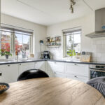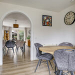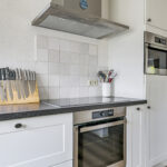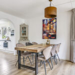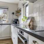 Aan inbouwapparatuur vind je een brede 5-pits inductiekookplaat, een afzuigschouw, een heteluchtoven, een combi/magnetron, een koelkast en een close-in-boiler. De op maat gemaakte, ronde, eiken eettafel blijft achter en vormt samen met de keuken een sfeervol geheel dat uitnodigt om samen te koken en te tafelen.