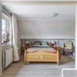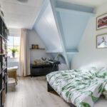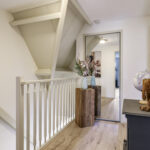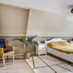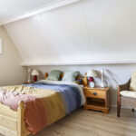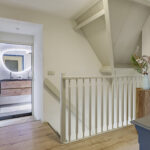 Via de ruime hal en comfortabele trapopgang bereiken we de 1e verdieping. Hier bevinden zich 4 volwaardige slaapkamers waarbij je de mogelijkheid hebt om een 5e slaapkamer te creëren. Dit is een kwestie van een tussenwand terug plaatsen. Elke slaapkamer heeft zo wel zijn eigen beleving. De grootste (ouder)slaapkamer telt maar liefst ca. 20m2 en biedt plaats aan een groot 2-persoonsbed. Er is al een kastenwand ingebouwd. De aanwezige airconditioning zorgt op een warme zomerdag voor verkoeling. Eén van de andere slaapkamers is bijzonder te noemen omdat het een ‘slaapvide’ heeft. Dit geeft deze kamer een speels karakter.