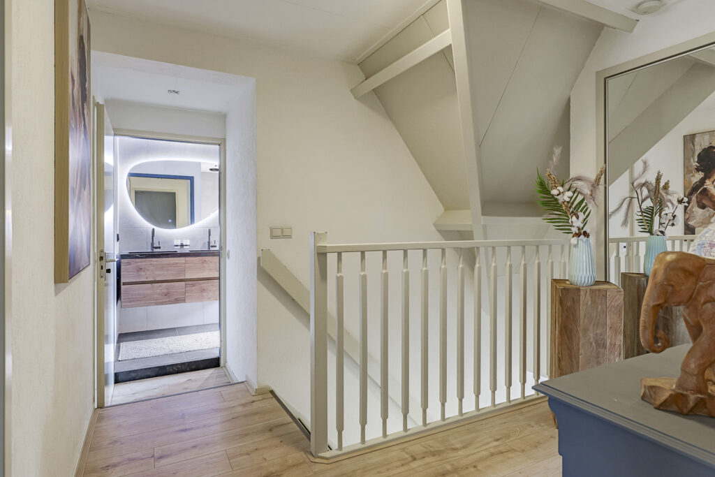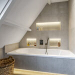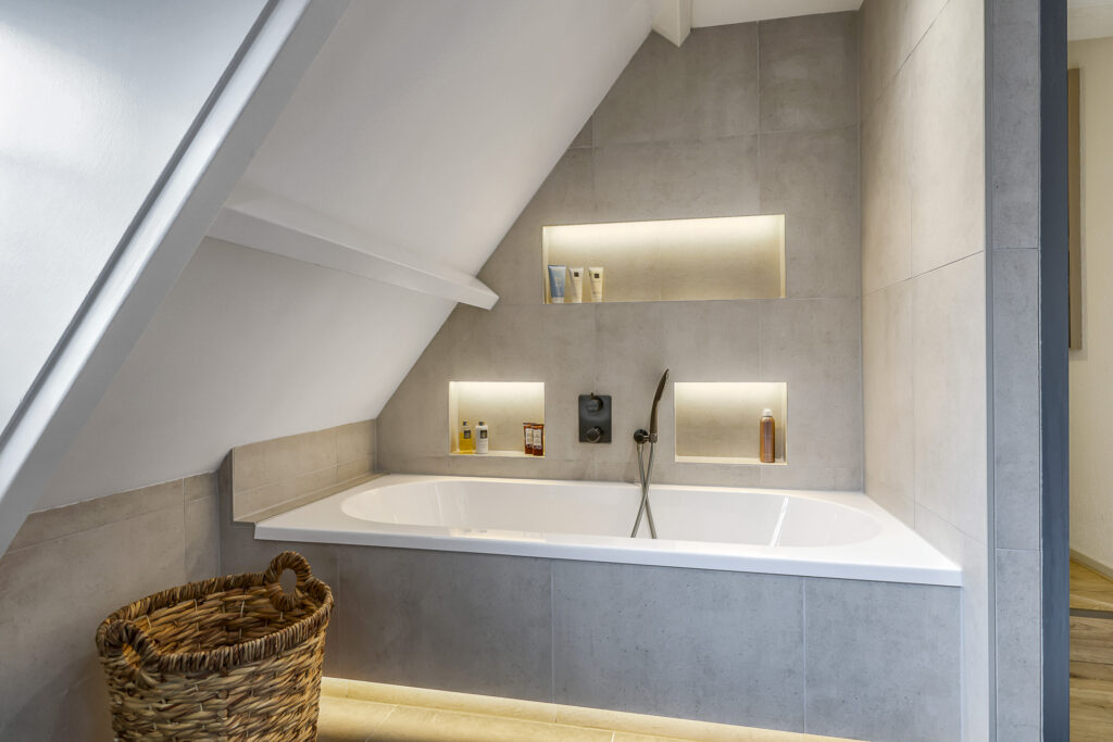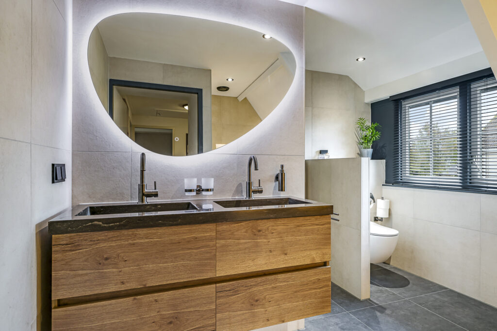 De badkamer is zeer recent (september 2025) volledig vernieuwd en straalt luxe uit. Hier is werkelijk nergens op bezuinigd: alles is hoogwaardig uitgevoerd met oog voor detail en design. Het ligbad lijkt te zweven door de subtiele verlichting onder het bad, en het dubbele wastafelmeubel met verwarmde spiegel en schaduwverlichting zorgt voor een moderne, hotelachtige sfeer. De inloopdouche heeft een rainshower met handdouche en een drainafvoer terwijl een nisje in de wand ruimte biedt voor douchegel. En net als het toilet beneden in de hal, is ook hier het toilet als een wandcloset geplaatst.