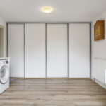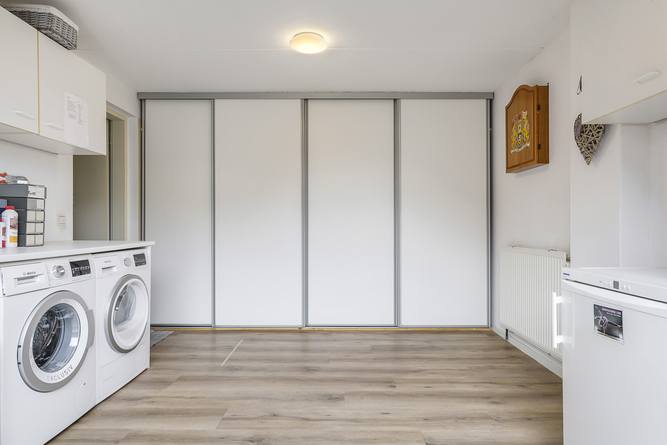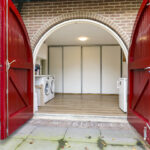 Inpandige garage/stallingsruimte met vaste schuifkastenwand en witgoedaansluitingen.