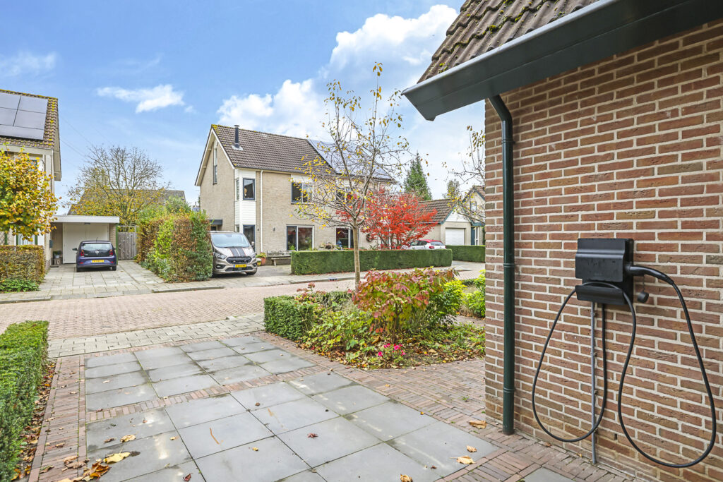 De voortuin is eveneens verzorgd aangelegd met klinkerbestrating (2018) en twee opritten, zodat je elkaar niet in de weg hoeft te staan. Er is zeker plaats voor drie auto’s op eigen terrein, waarvan één oprit voorzien is van een laadpaal.