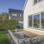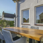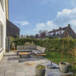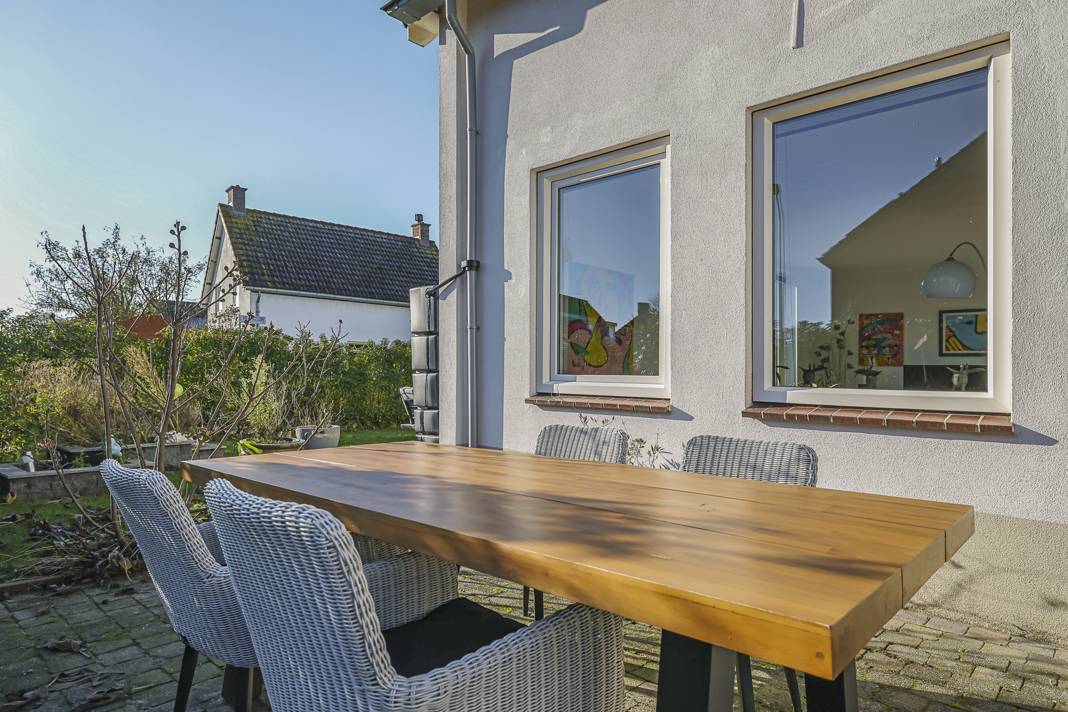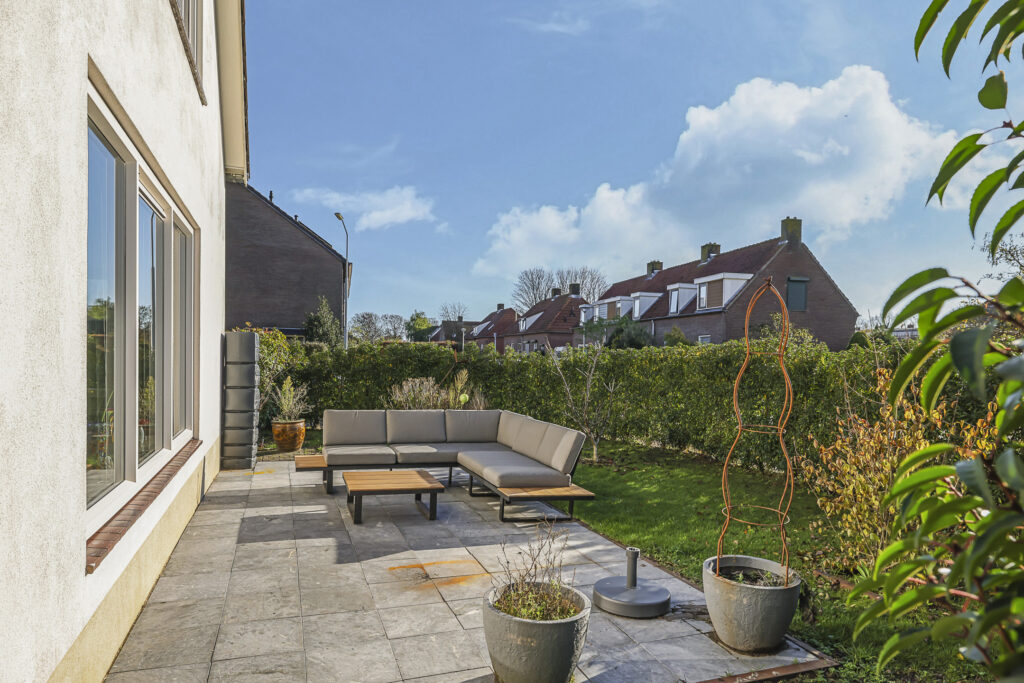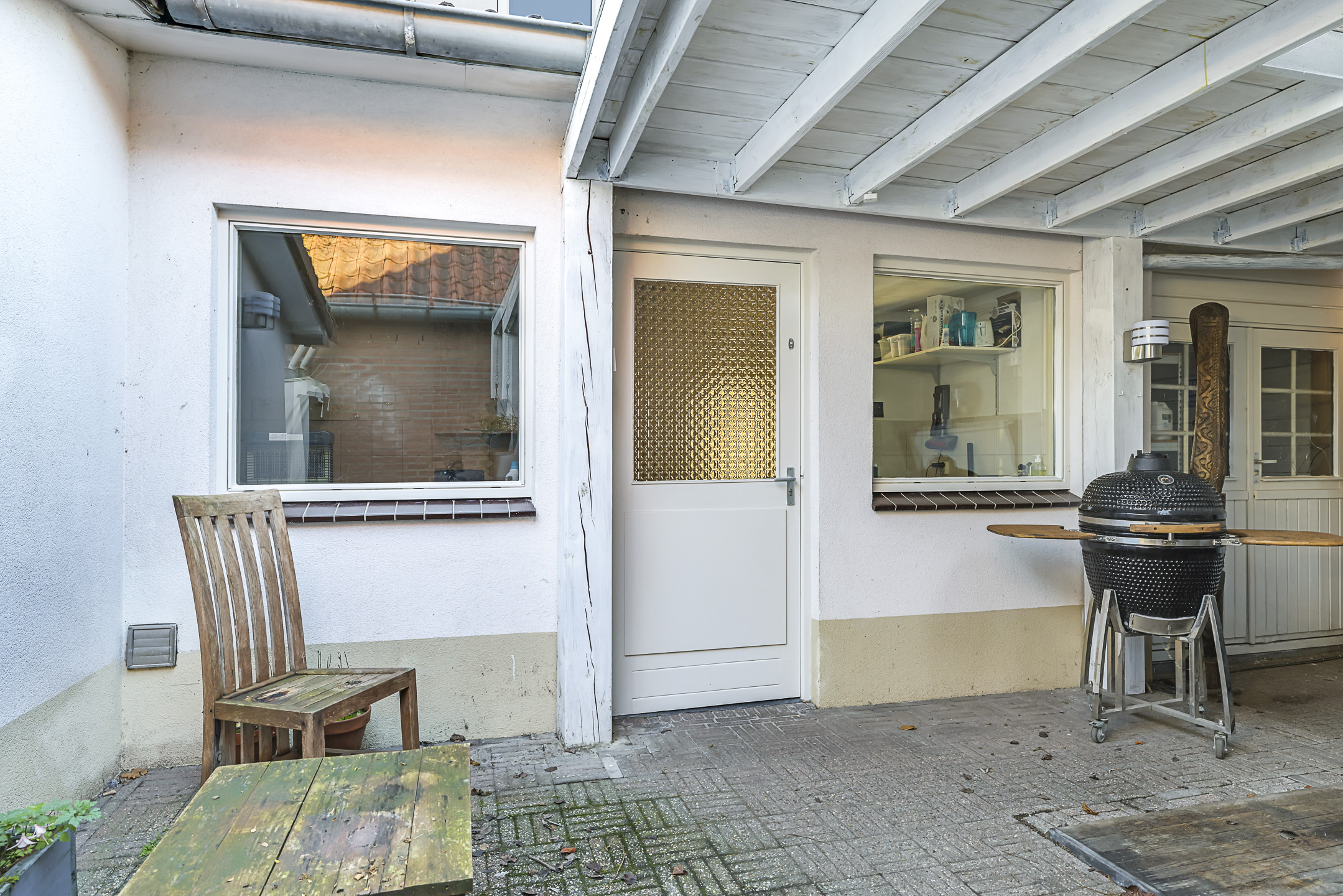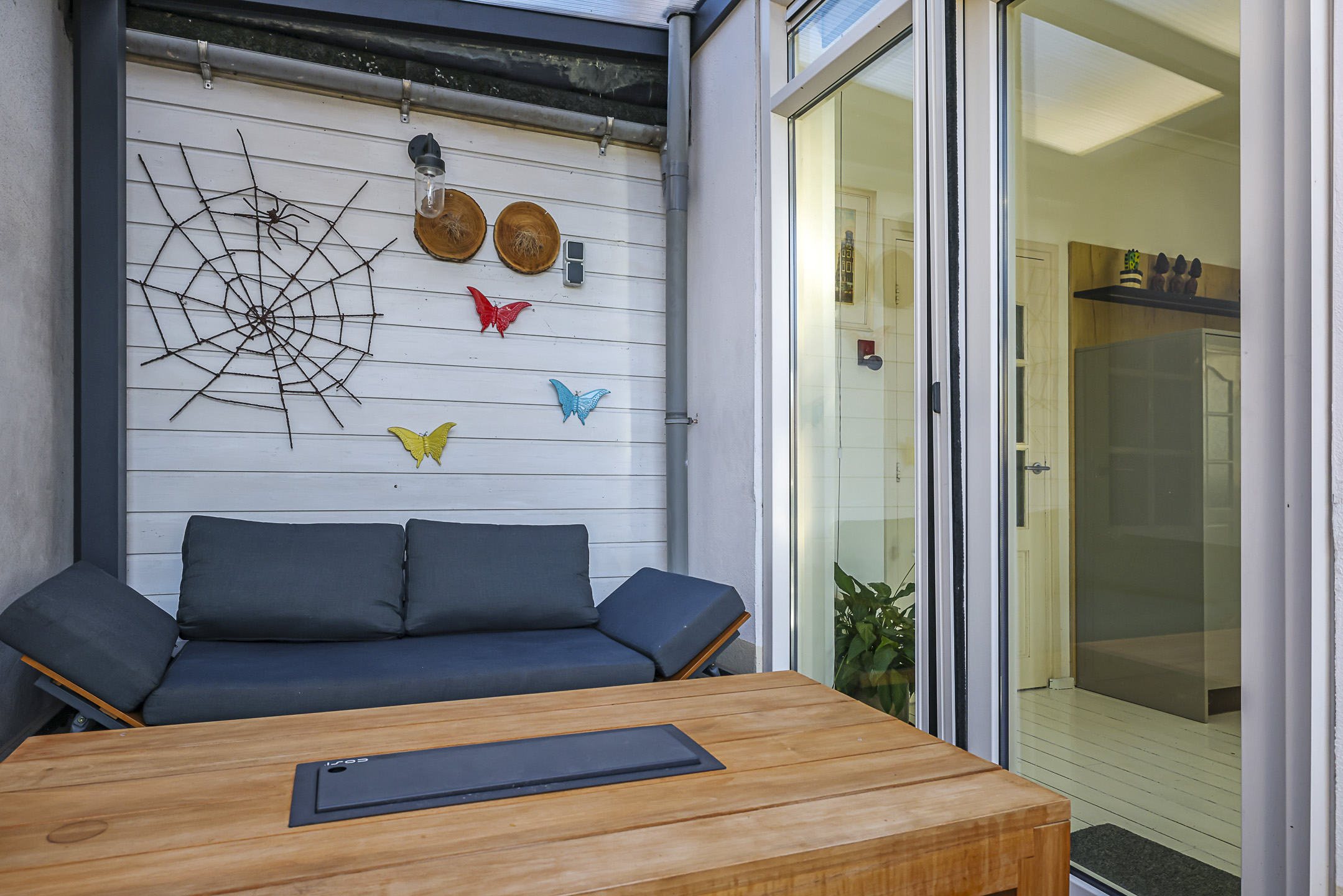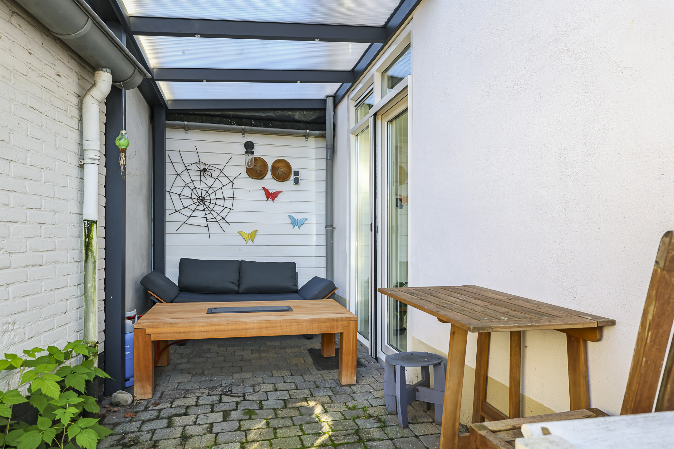 Een ander pluspunt is de nieuw geplaatste schuifpui naar de terrasoverkapping aan de zijkant van het huis. Hier is een knuss, overdekte zithoek gecreëerd waar je met name in de avonduren lekker van de zon kunt genieten. De schuifpui is overigens voorzien van een plisséhor waardoor insecten geen kans krijgen.