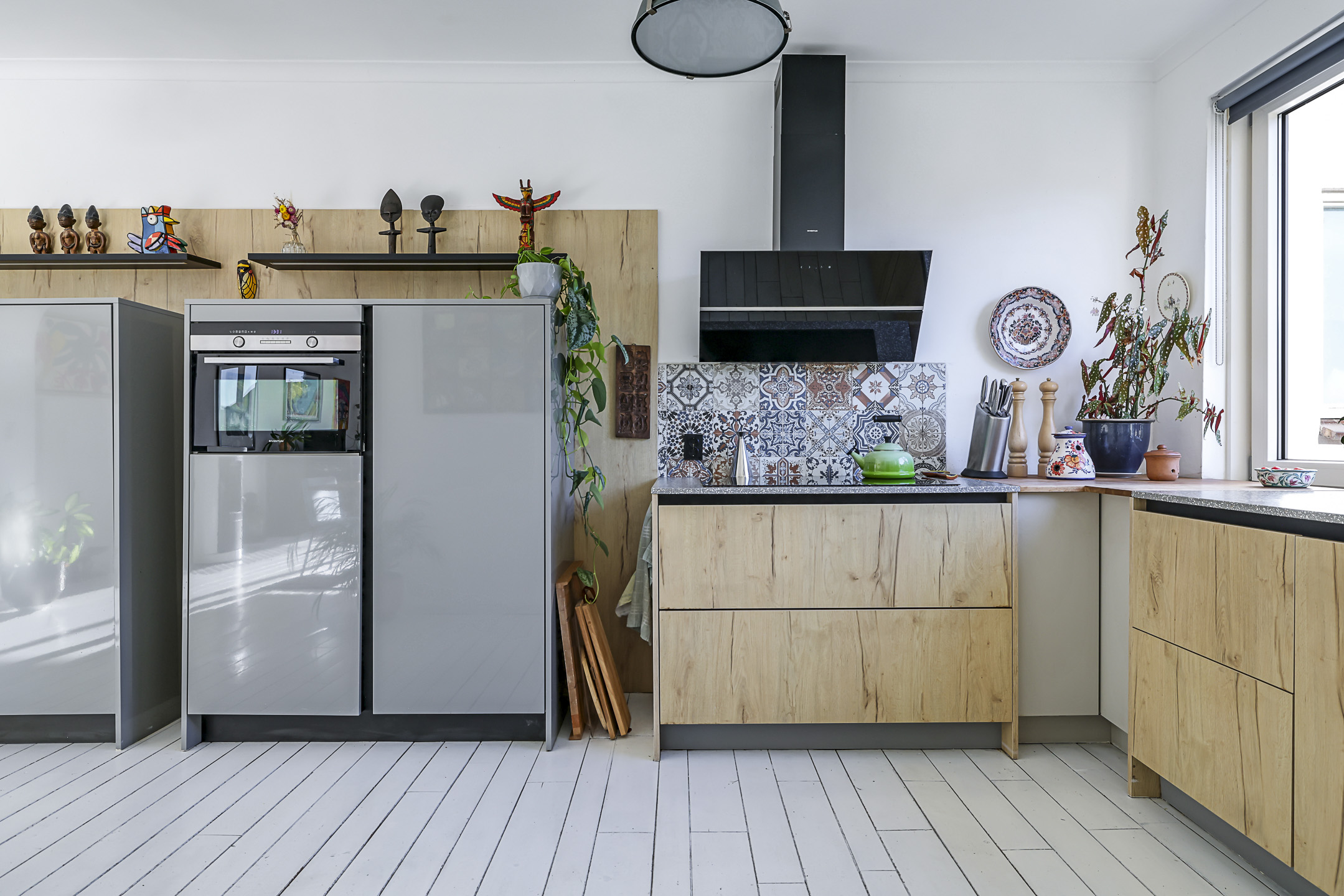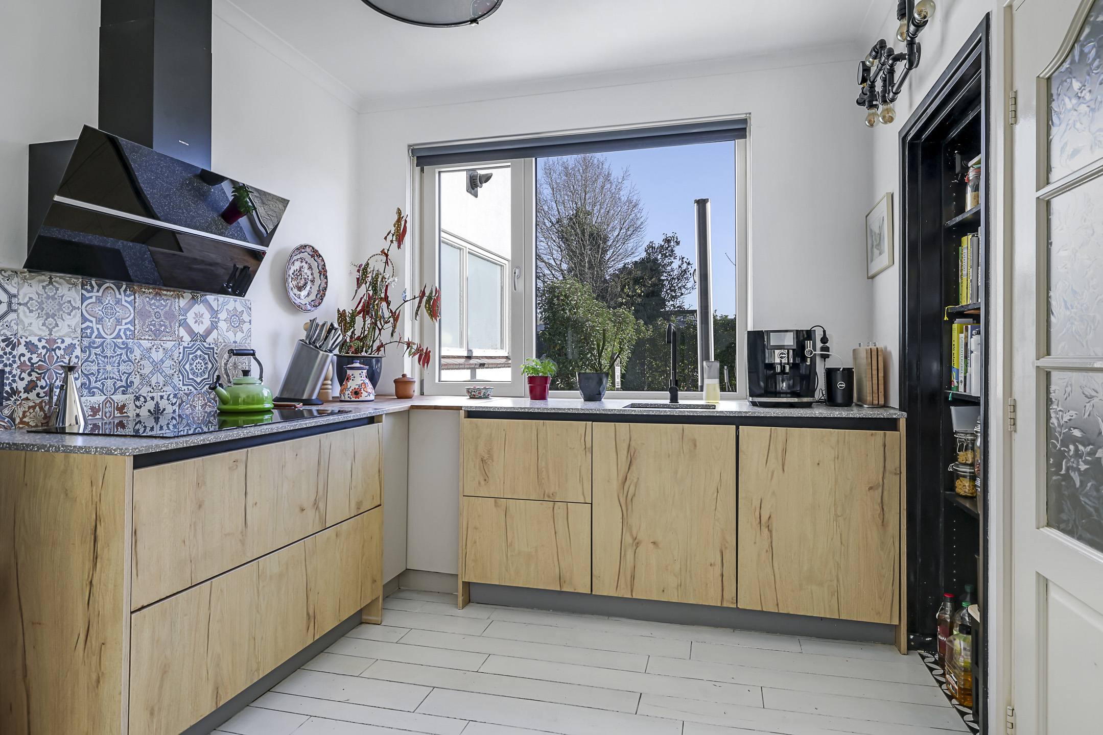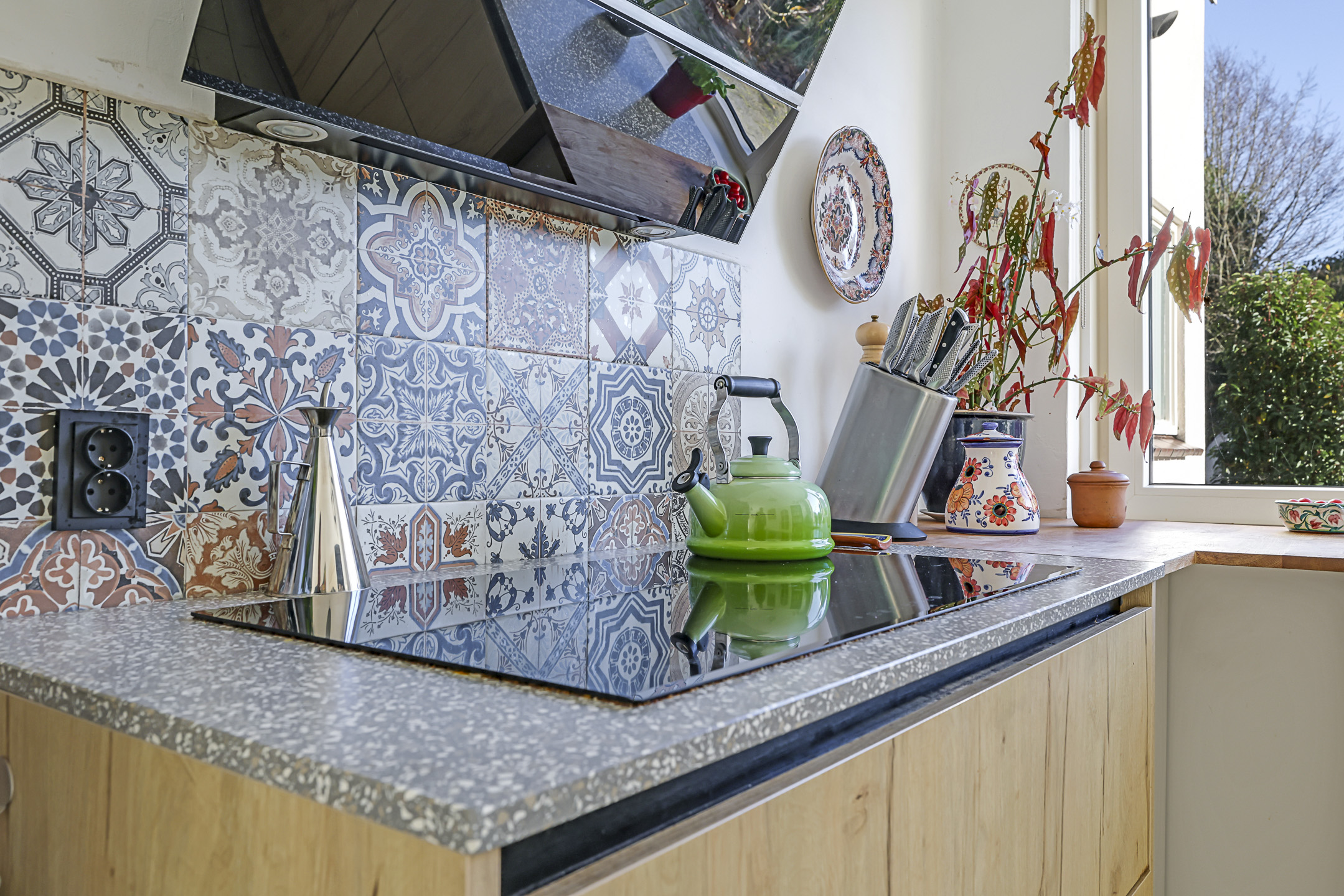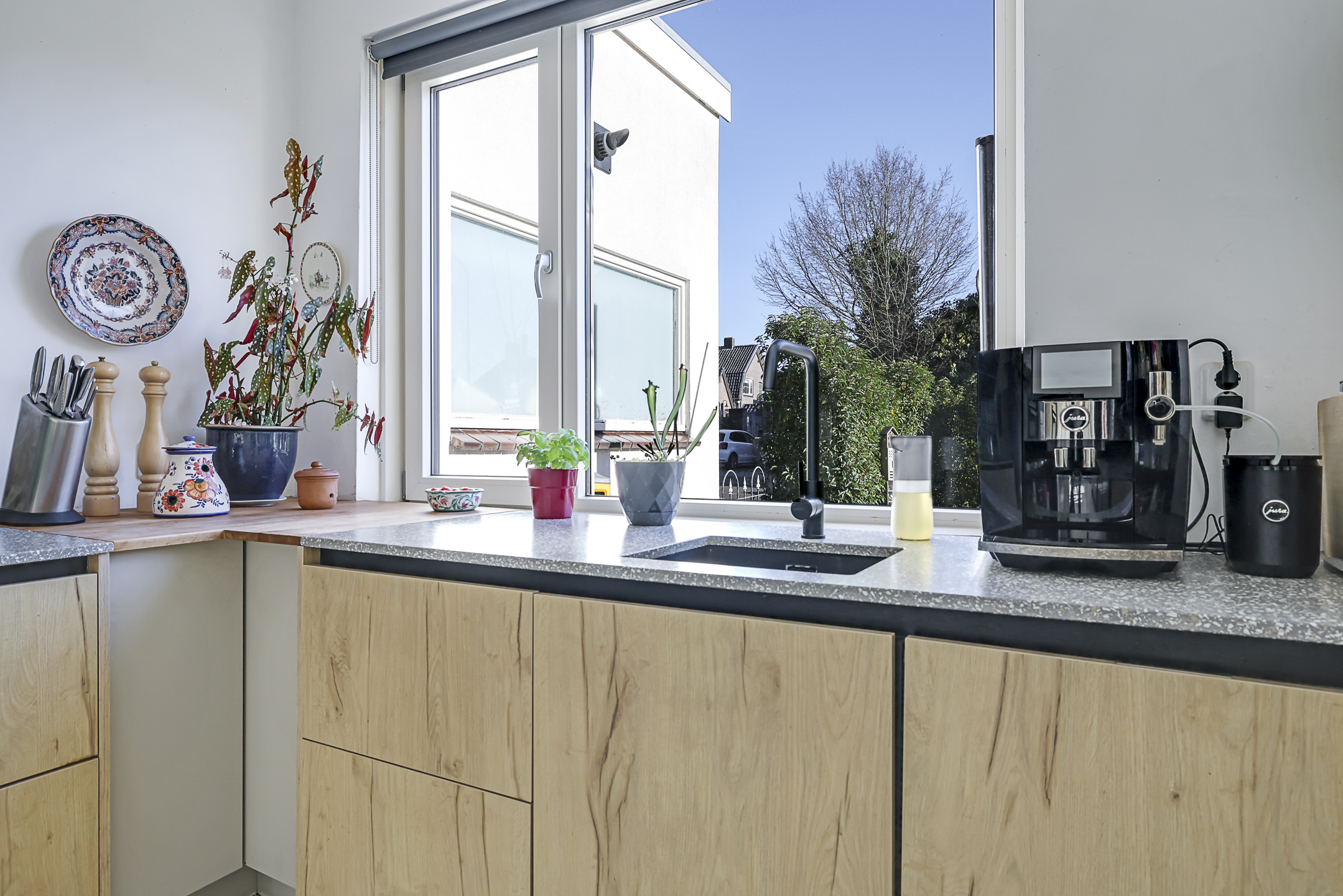 De woning is al niet standaard, de keuken ook zeker niet. Er is gekozen voor een royale hoekopstelling waarbij de hoge kasten los van elkaar zijn geplaatst. Zit zorgt voor een speels karakter waarbij de kleurstellingen voor een trendy uitstraling zorgen. Denk daarbij aan antracietkleurige, hoogglans fronten, afgewisseld met ‘houtlook’ en frisse Portugese wandtegels. Het aanrechtblad is in natuursteen (terrazzo) uitgevoerd waarbij het blad ook dieper is uitgevoerd.