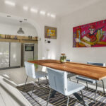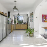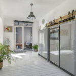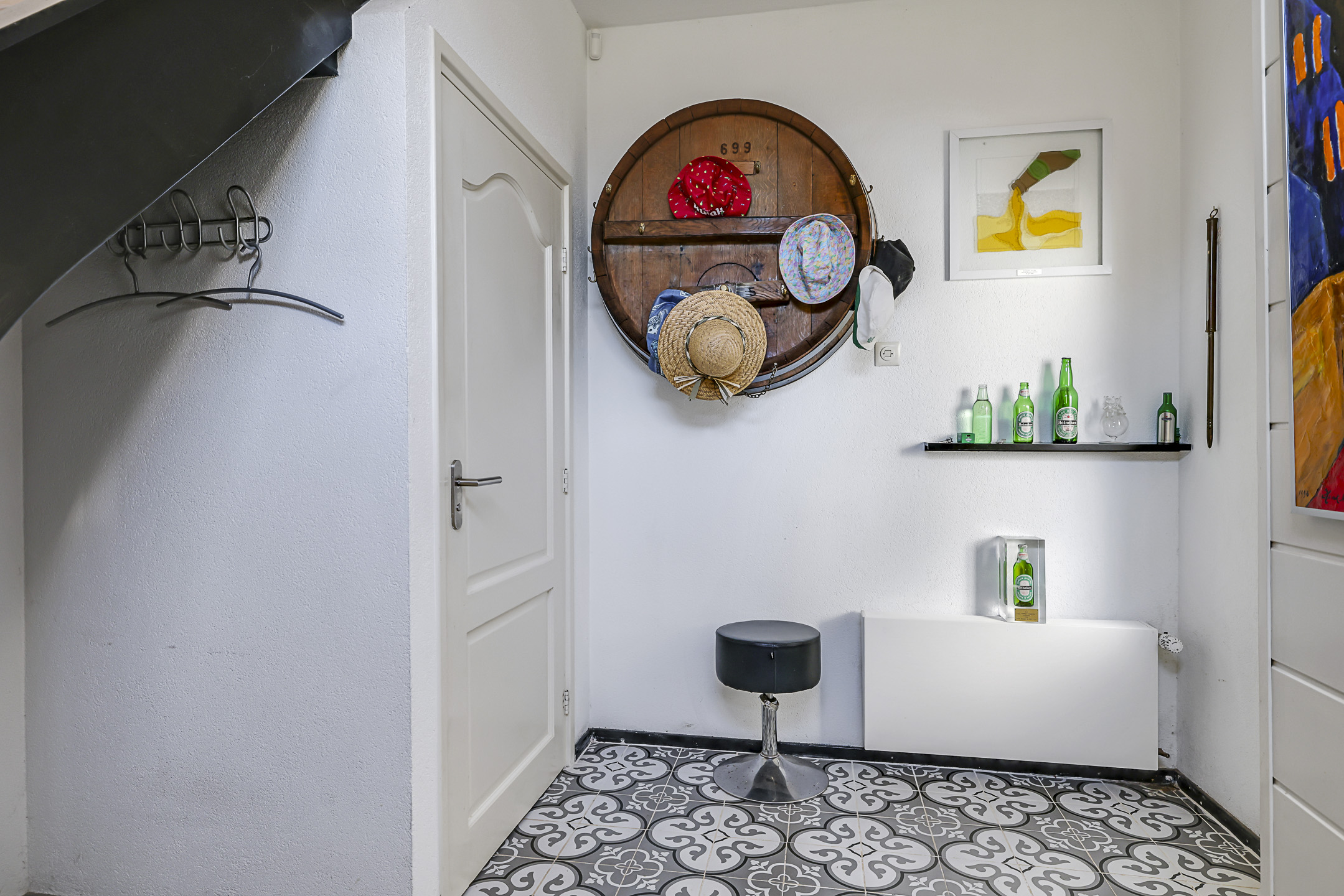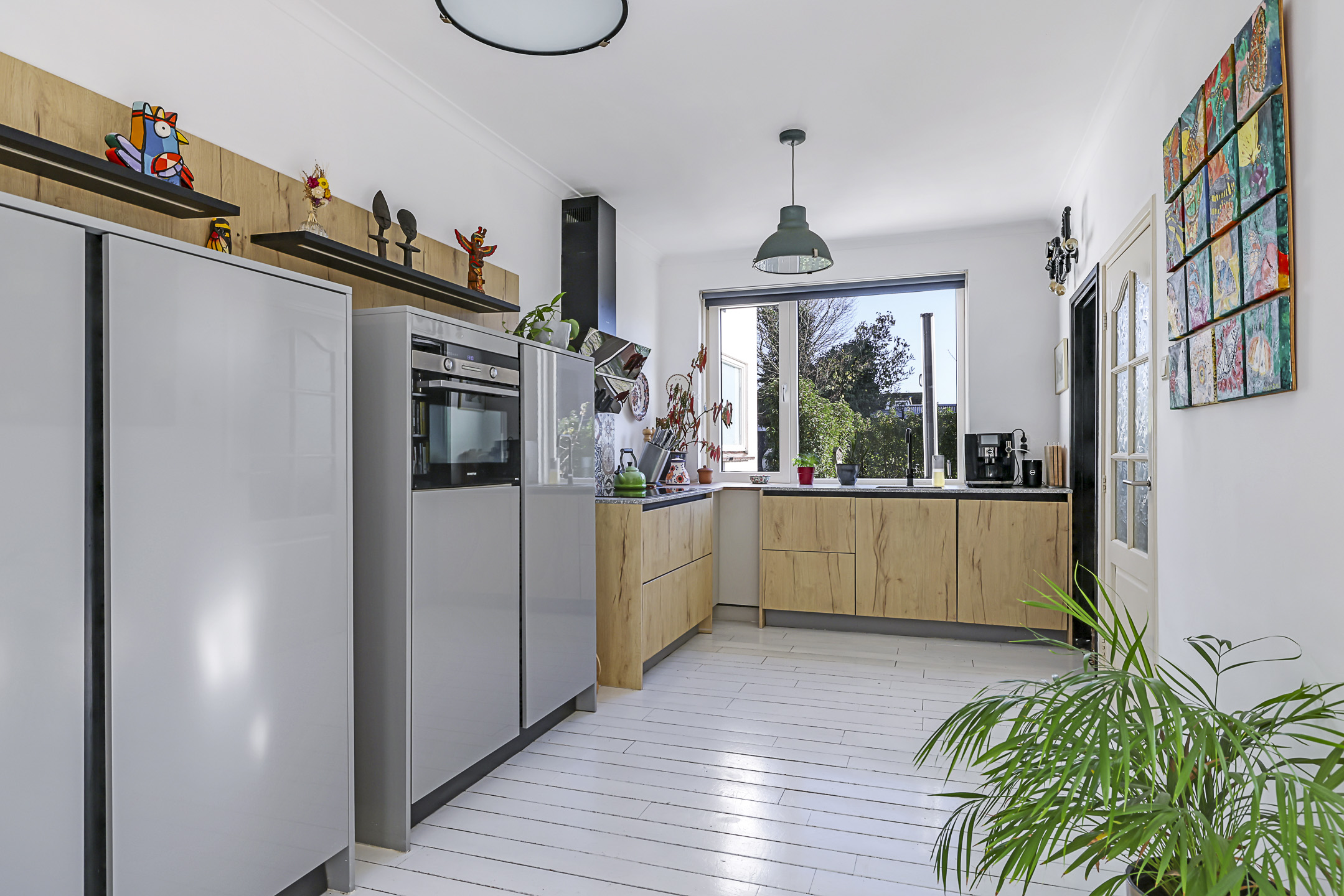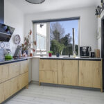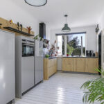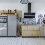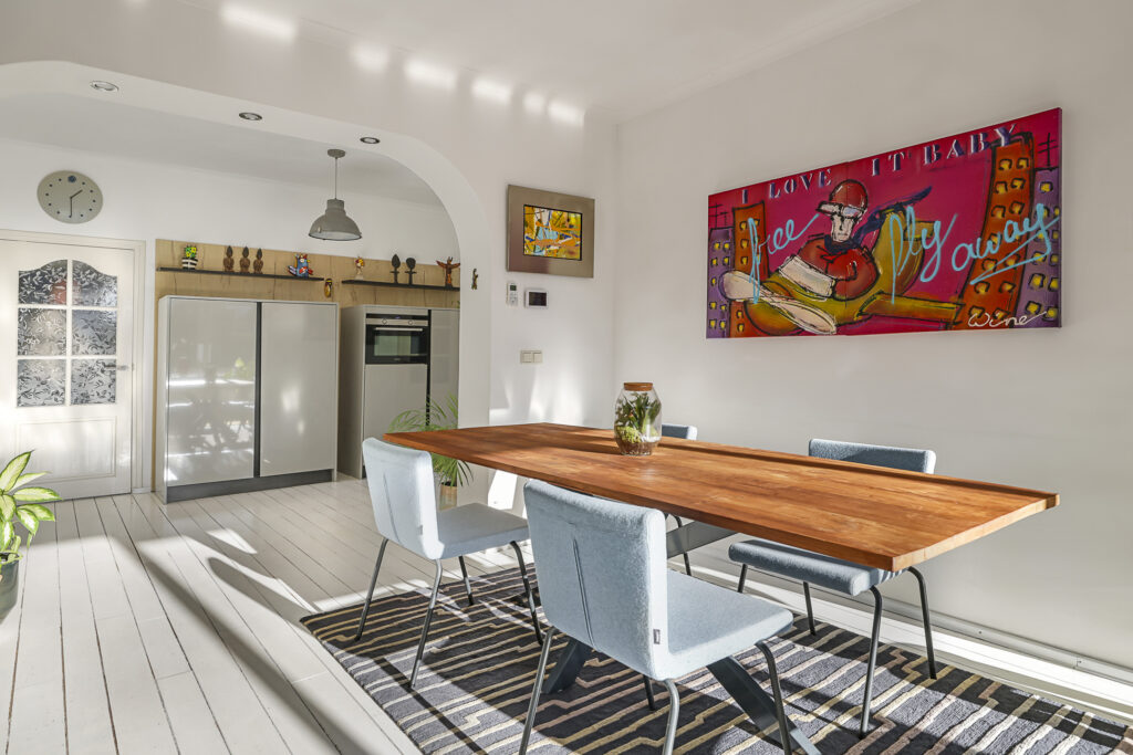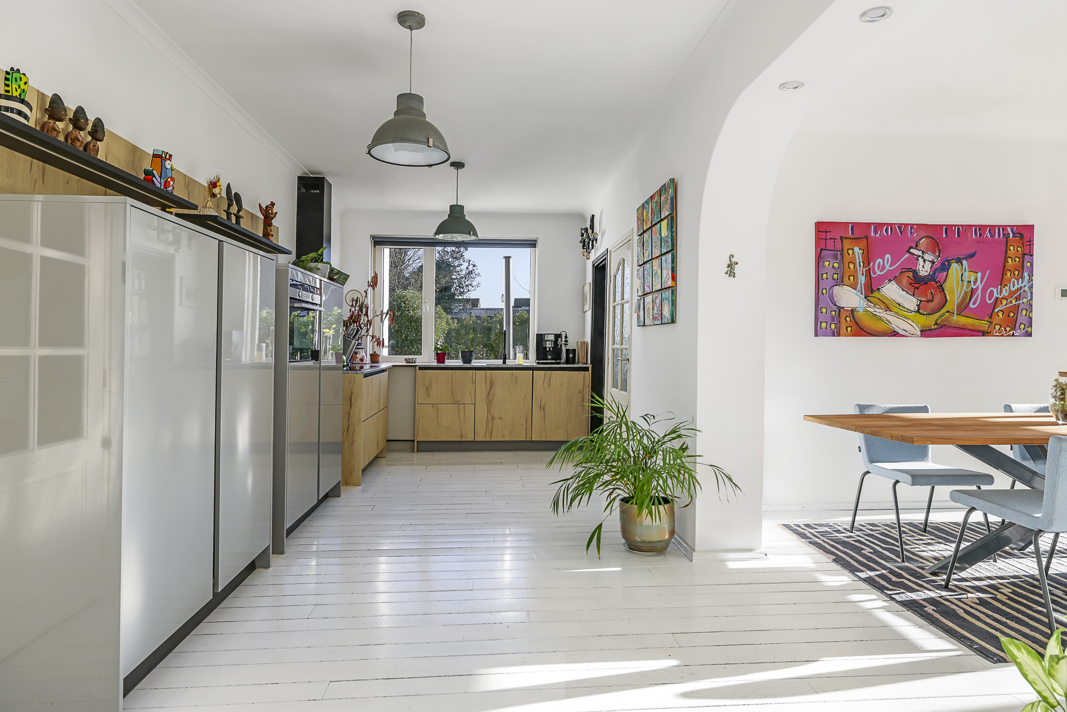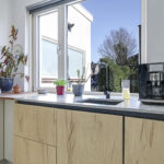 De woning is al niet standaard, de keuken ook zeker niet. Er is gekozen voor een royale hoekopstelling waarbij de hoge kasten los van elkaar zijn geplaatst. Zit zorgt voor een speels karakter waarbij de kleurstellingen voor een trendy uitstraling zorgen. Denk daarbij aan antracietkleurige, hoogglans fronten, afgewisseld met ‘houtlook’ en frisse Portugese wandtegels. Het aanrechtblad is in natuursteen (terrazzo) uitgevoerd waarbij het blad ook dieper is uitgevoerd.