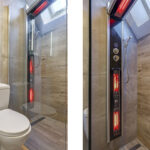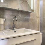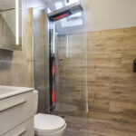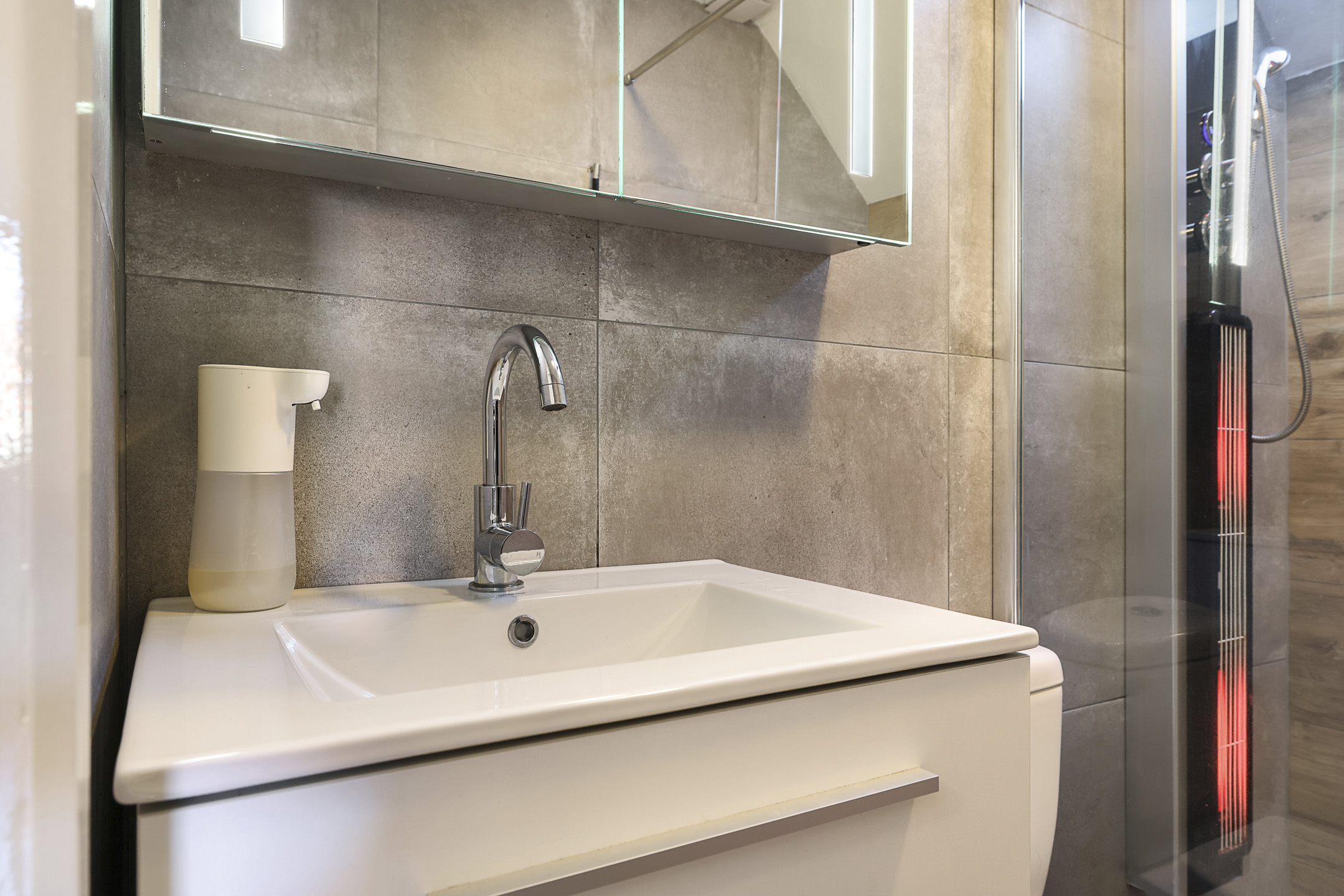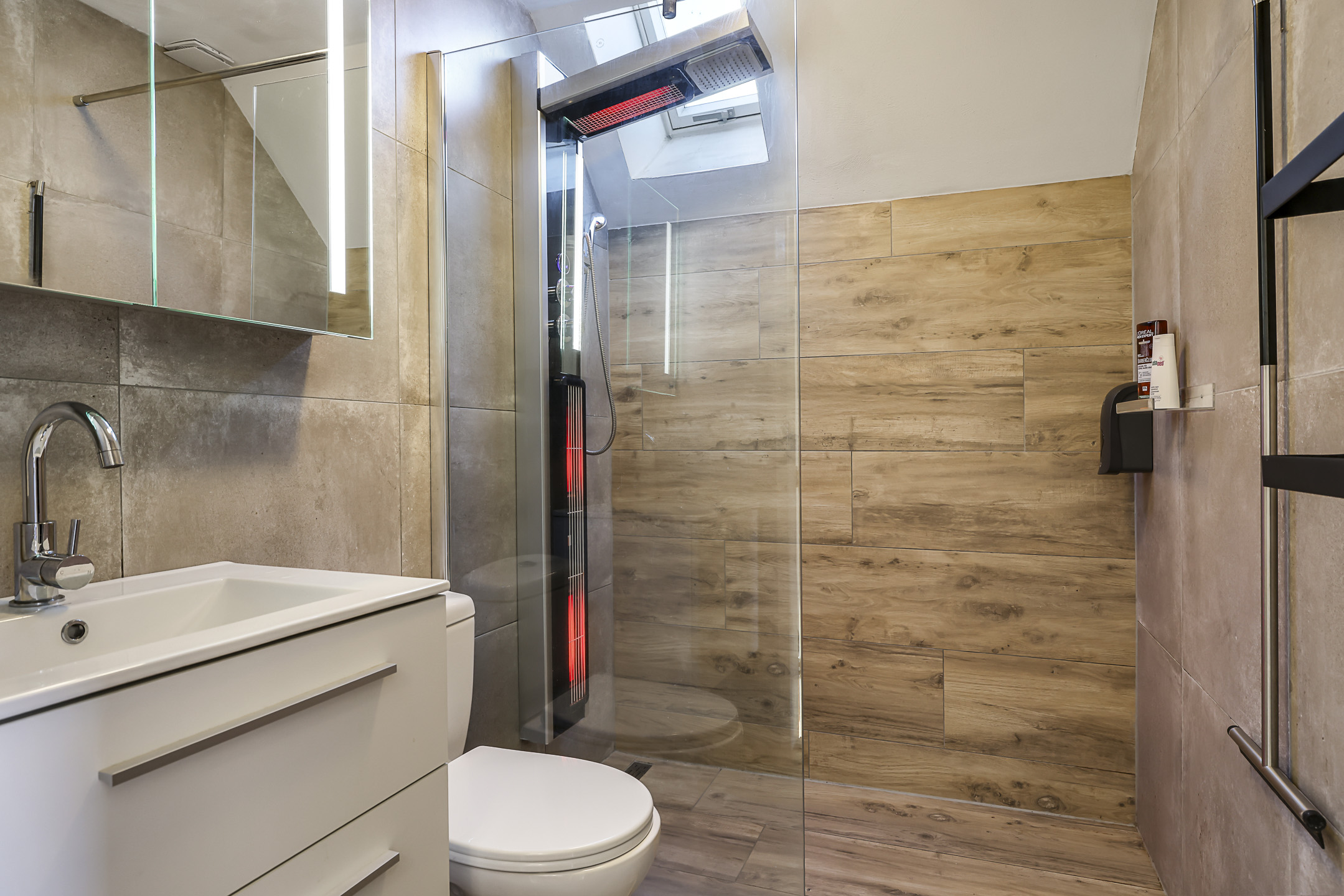 In 2019 is de badkamer gemoderniseerd. Er is gekozen voor groot formaat tegels in aardetinten die de badkamer een frisse en trendy uitstraling geven. Het sanitair bestaat uit een wasmeubel met 2 ladekorven met daarboven een spiegelkast met verwarmbare spiegel, een 2e toilet en een inloopdouche. Deze douche heeft niet alleen een drainafvoer, een rainshower en een handdouche maar ook een infraroodelement. Om het af te maken is er nog een elektrische handdoekradiator (infrarood) geplaatst. Erg praktisch is het aanwezige dakvenster. Deze zorgt niet alleen voor een fijne lichtinval, maar ook voor een ideale ventilatiemogelijkheid.