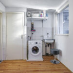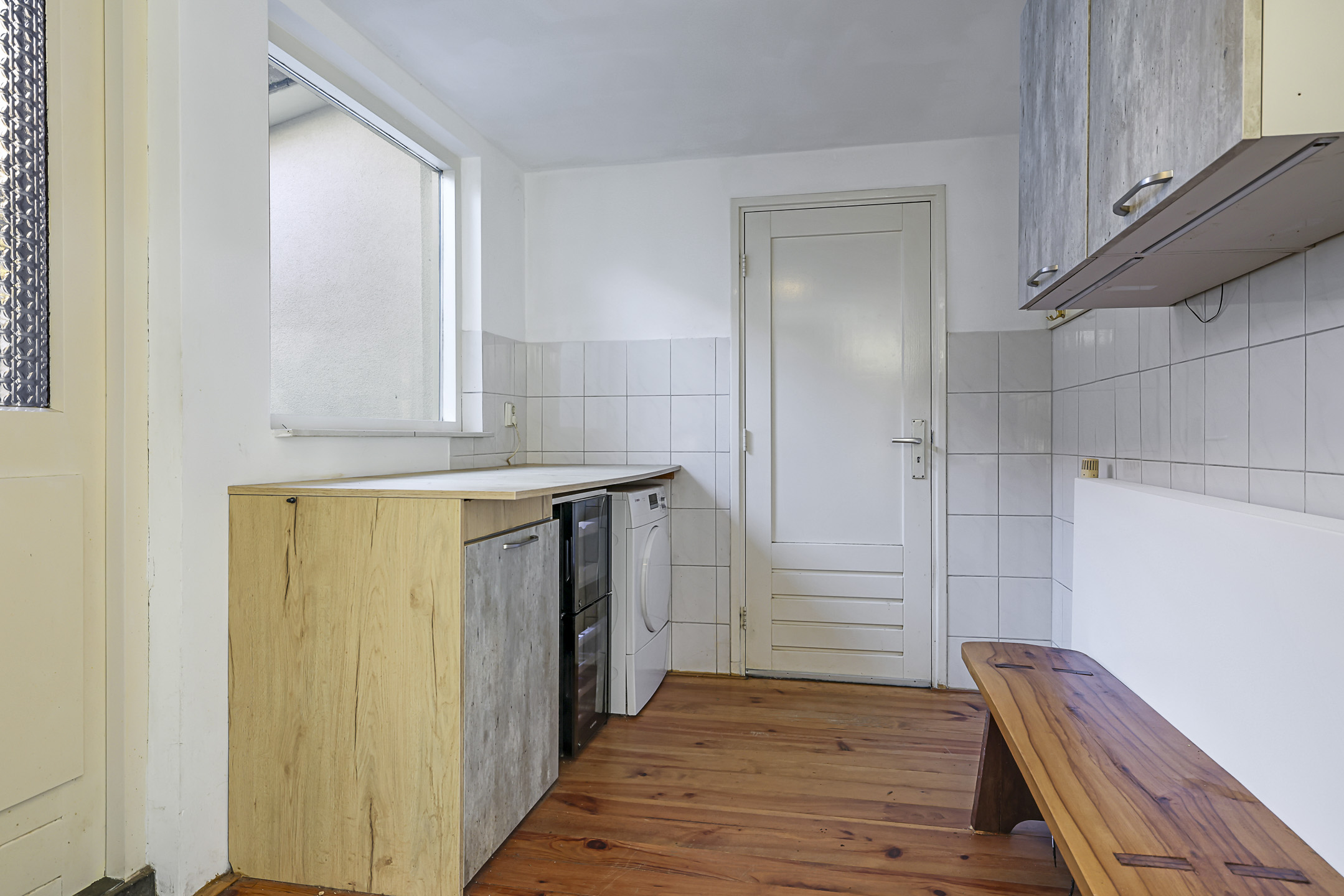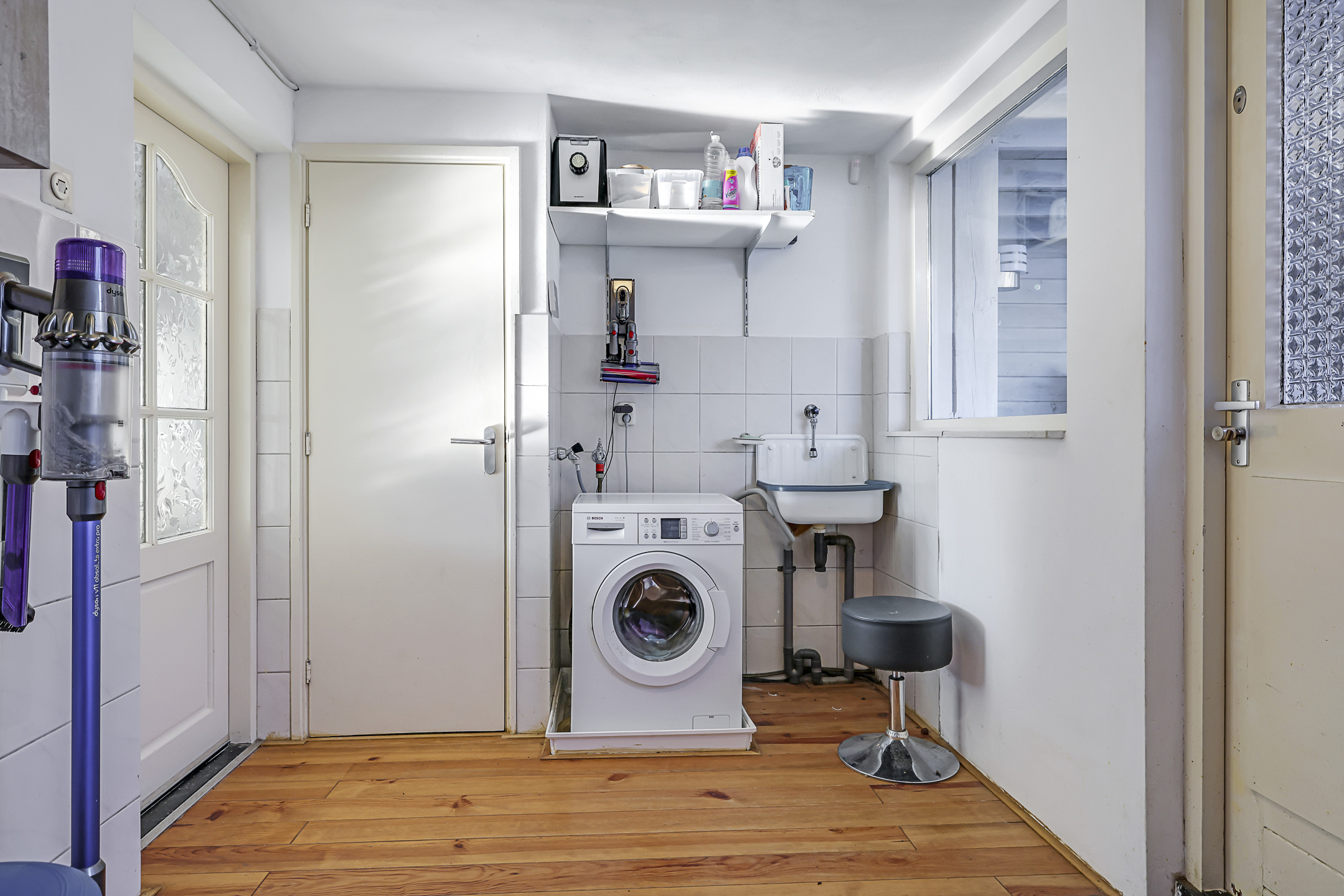 Vanuit de keuken loop je direct de bijkeuken in. In deze woning zijn geen kleine ruimtes te vinden, zo ook niet de bijkeuken. Deze is in verhouding met de overige leefruimtes waardoor het lekker ruim is opgezet. In de bijkeuken vinden we de wasmachine- en wasdrogeraansluiting. Wanneer je de was buiten wil laten drogen, dan loop je middels de tuindeur zo de tuin in. Ook is er een gootsteen aanwezig. Vanuit de bijkeuken loop je rechtstreeks de dubbele garage in.