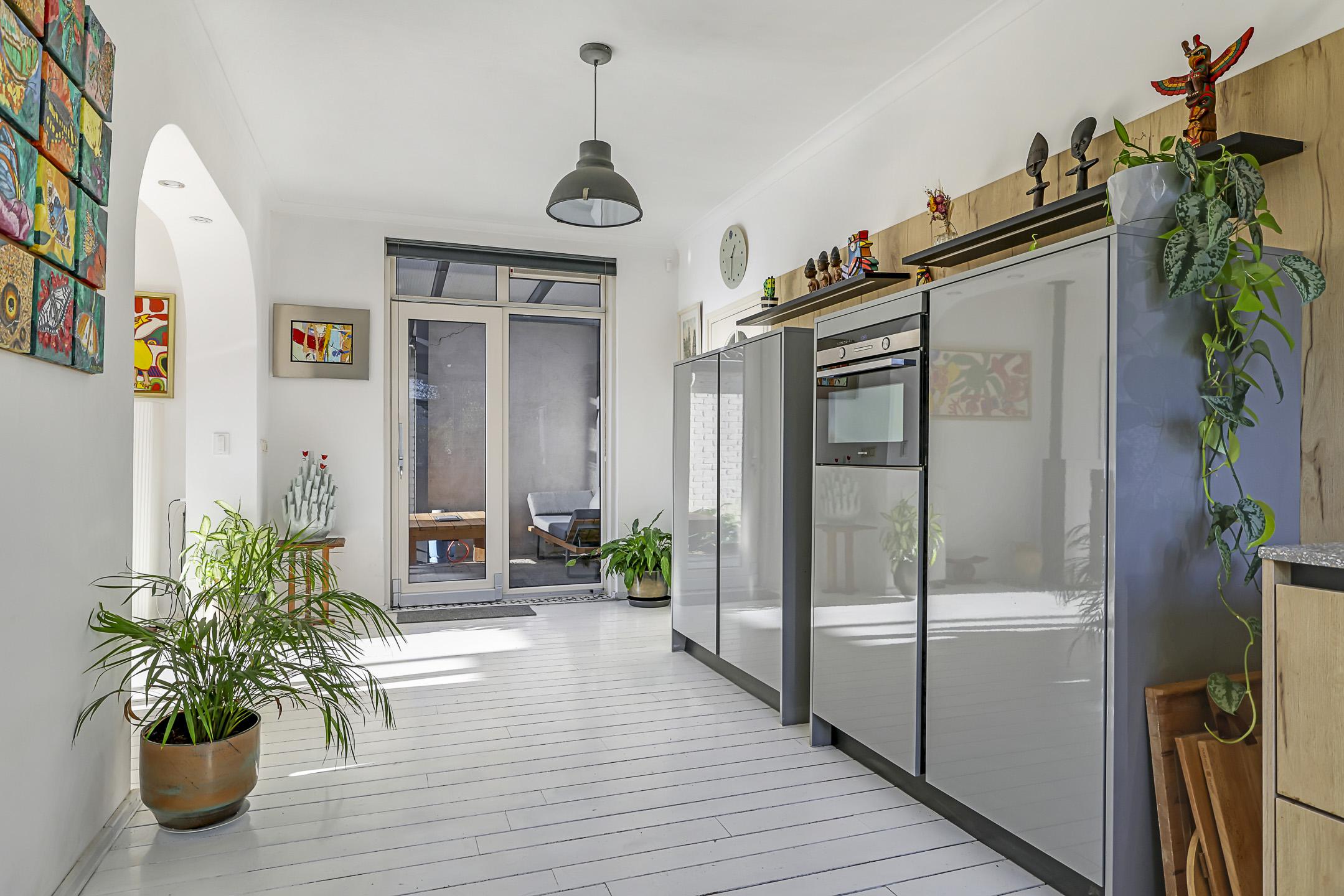 Leefkeuken met inbouwapparatuur en een inbouwkast