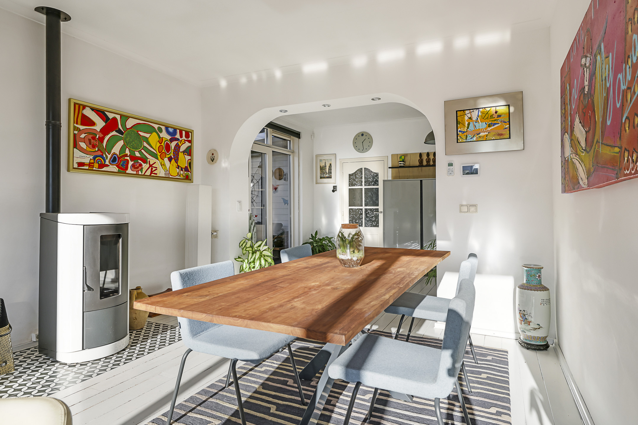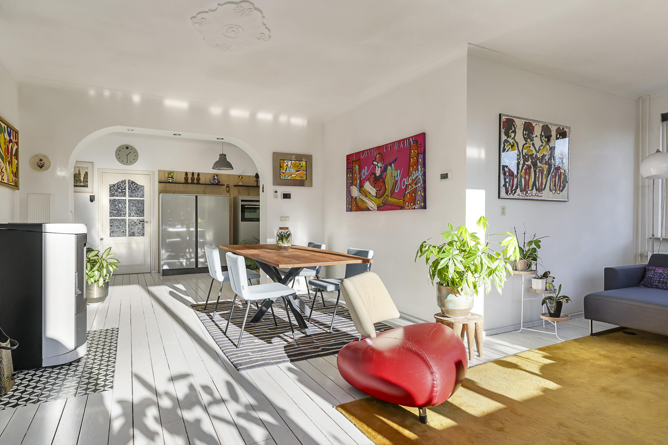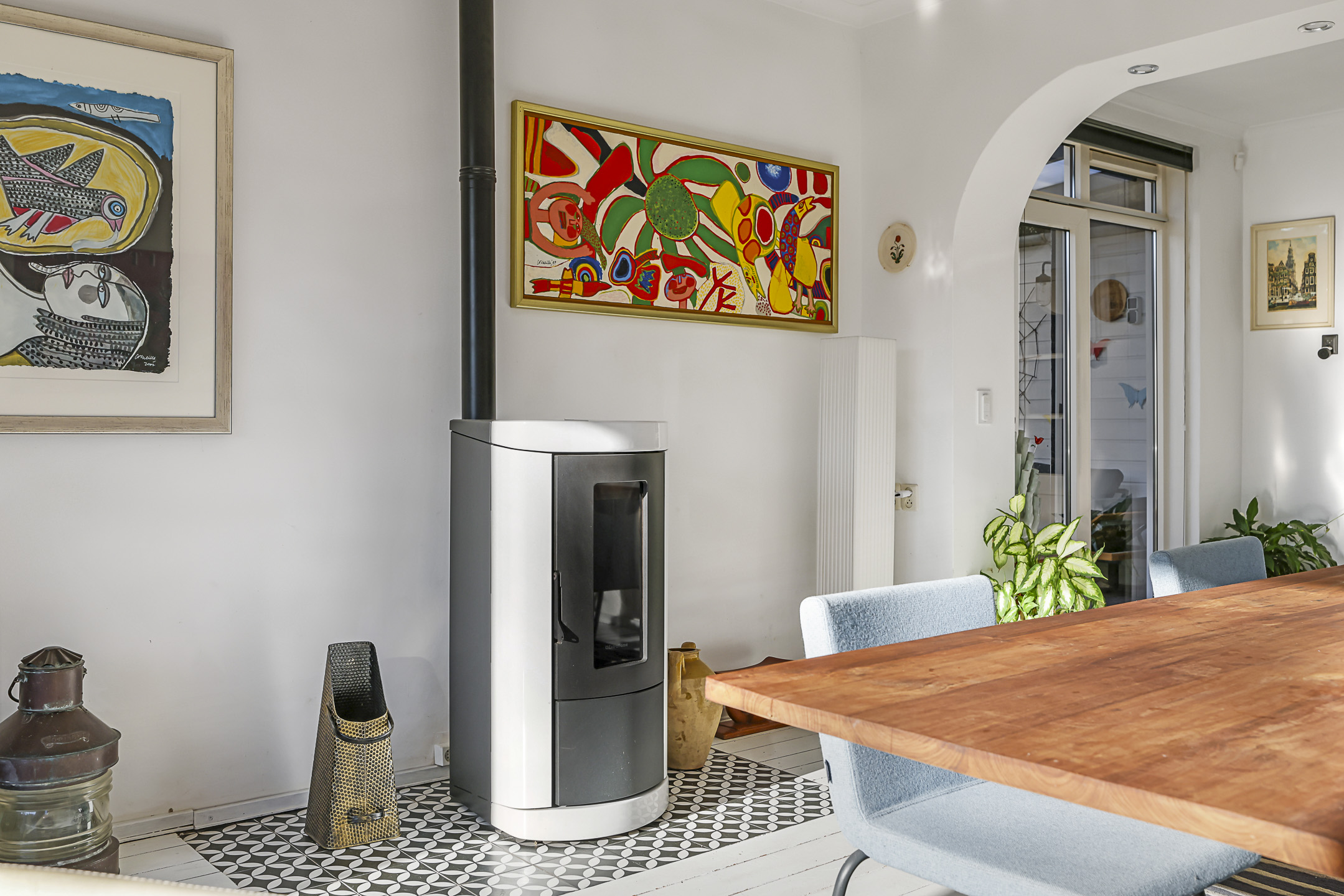 De woonkamer is aan de voorzijde gelegen en heeft een L-indeling. De woning is maar liefst 7 meter breed (inpandig) wat bijdraagt aan een ruimtelijk gevoel. Dit ruimtelijke gevoel wordt nog eens extra versterkt door de hoge stucplafonds (2,66m hoog). De grote ramen zorgen tevens voor veel lichtinval. De vloer is bekleed met massief eikenhout wat voor een warme woonsfeer zorgt. De wanden en het plafond zijn gestuct waarbij er langs de randen een stijlvolle plint is meegestuct. Leuk detail zijn de Portugese vloertegels waarop de pelletkachel is geplaatst. Dit zorgt voor gezelligheid en een heerlijke warmte.