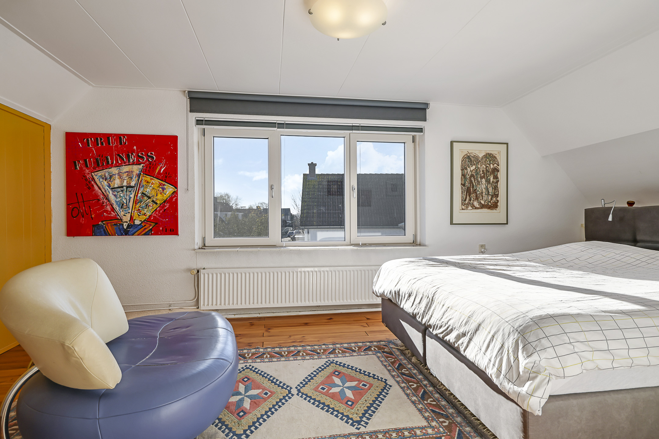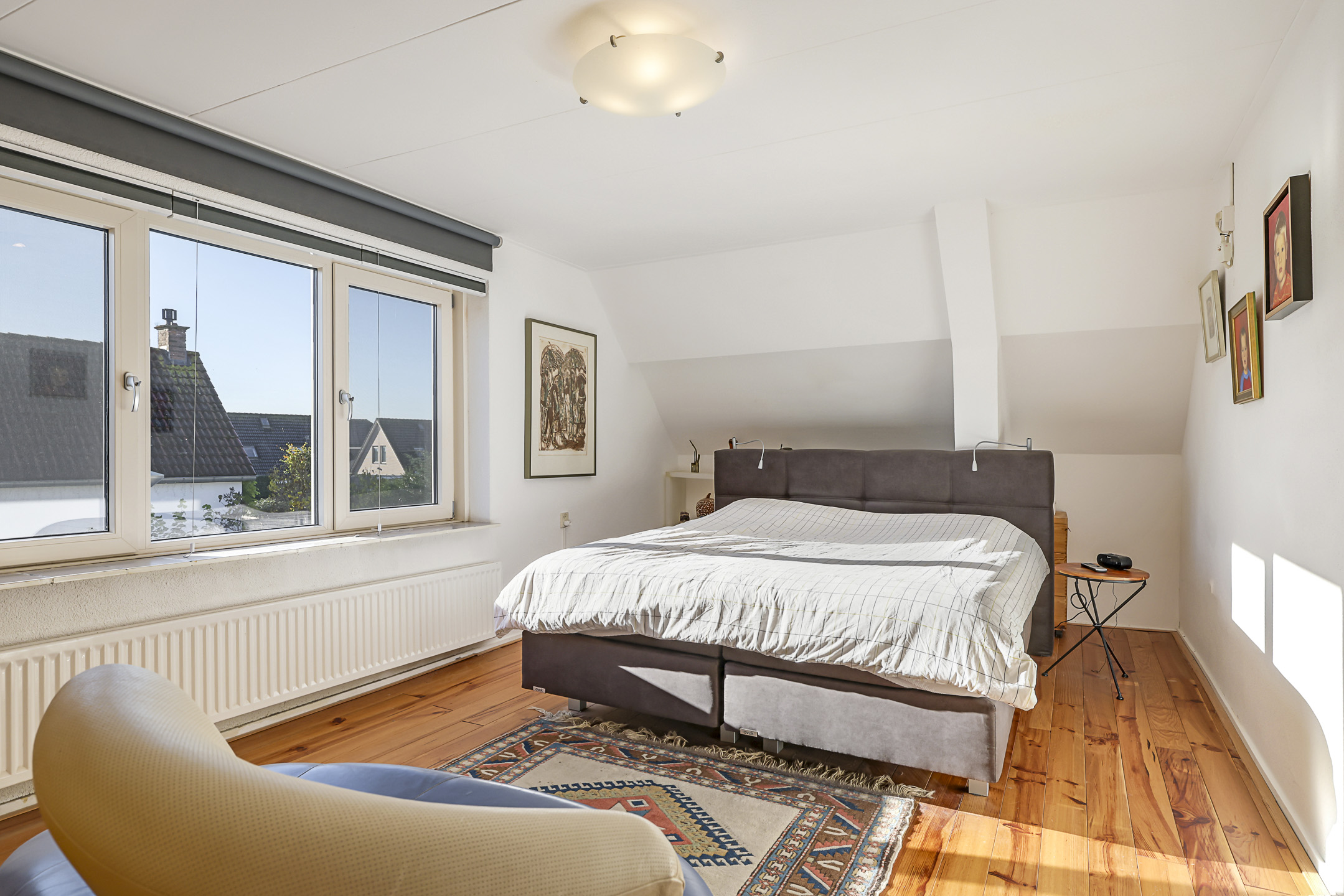 Via een prettige hal/entree en stijlvolle eikenhouten trapopgang (traprenovatie) komen we op de 1e verdieping terecht. De overloop schakelt 3 zeer volwaardige slaapkamers van respectievelijk 23m2, 11m2 en 10m2 groot aan elkaar. De grootste is een heuse masterbedroom en is veel groter dan gemiddeld. Je zou deze zelfs kunnen opdelen in 2 afzonderlijke slaapkamers. In de huidige setting vind je op deze kamer een vaste kastenwand waardoor je geen linnenkast hoeft mee te nemen. Ook de overige 2 slaapkamers zijn verrassend groot. Doordat het schuine dak pas op circa 1 meter hoogte vanaf de verdiepingsvloer begint, is er nauwelijks ruimteverlies. Noemenswaardig zijn de nieuwe kozijnen met draai/kiepramen en inzethorren.