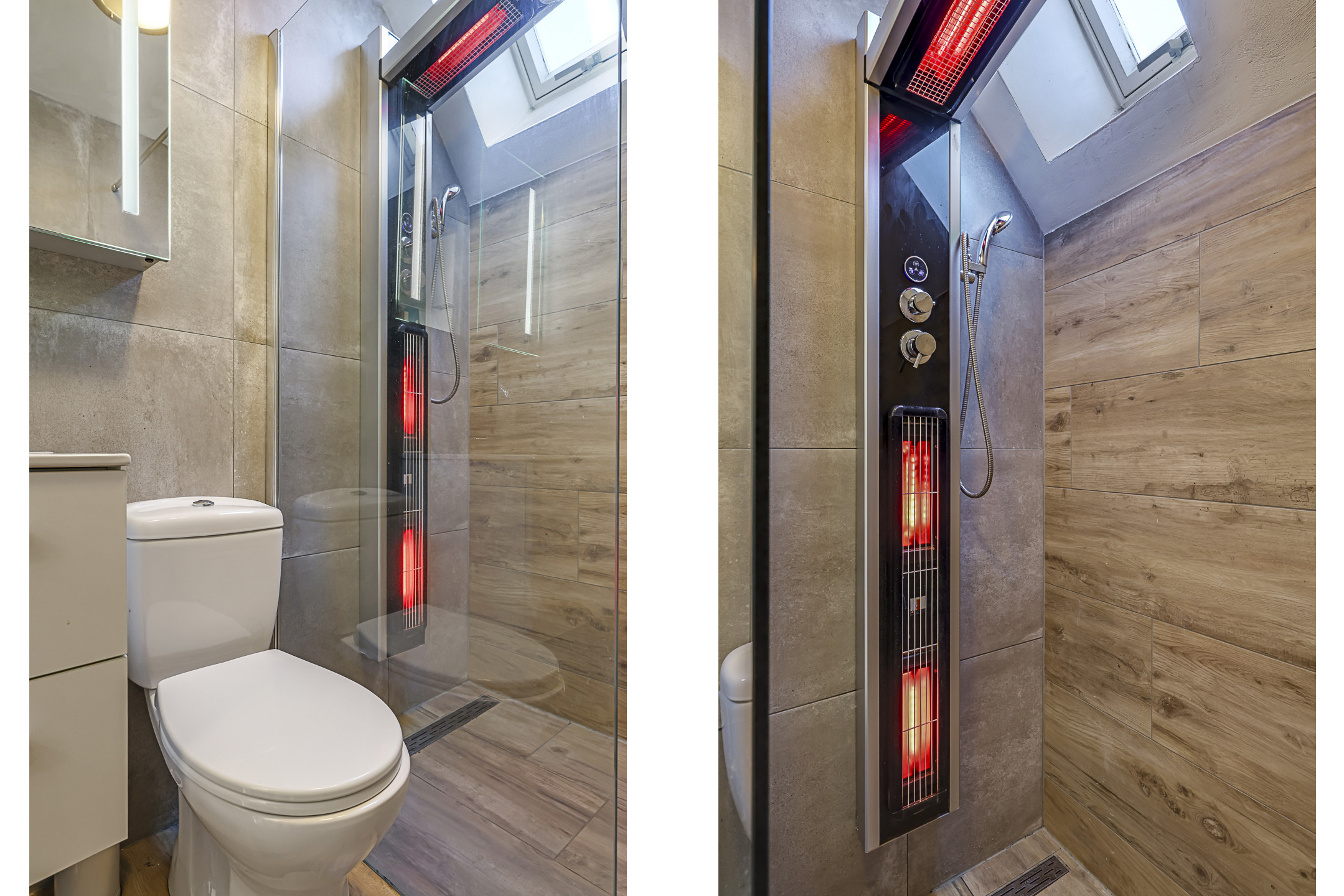 Badkamer met inloopdouche (infrarood), wasmeubel, 2e toilet en designradiator.