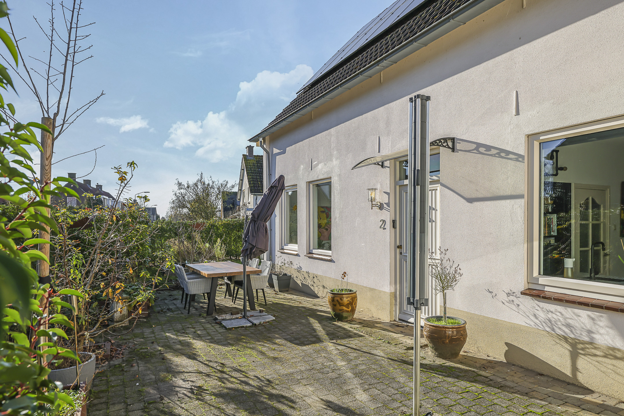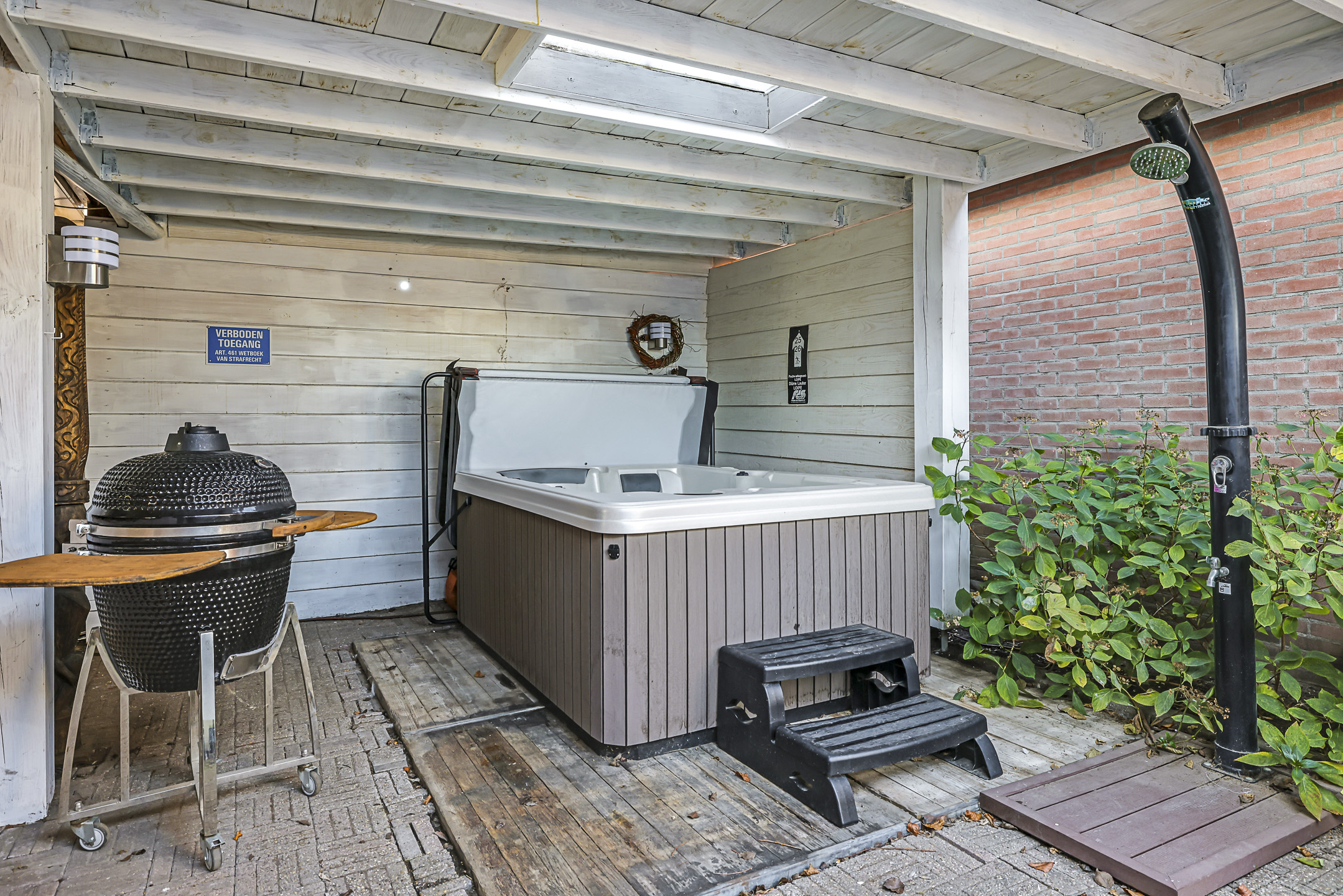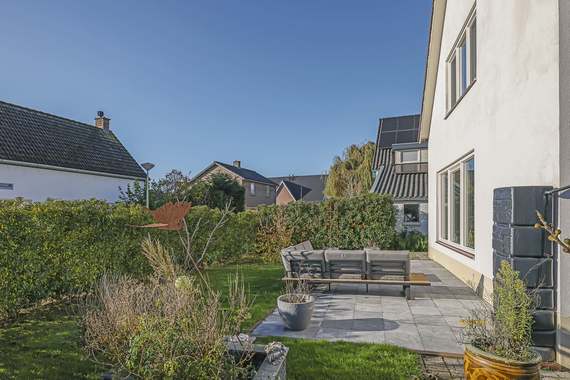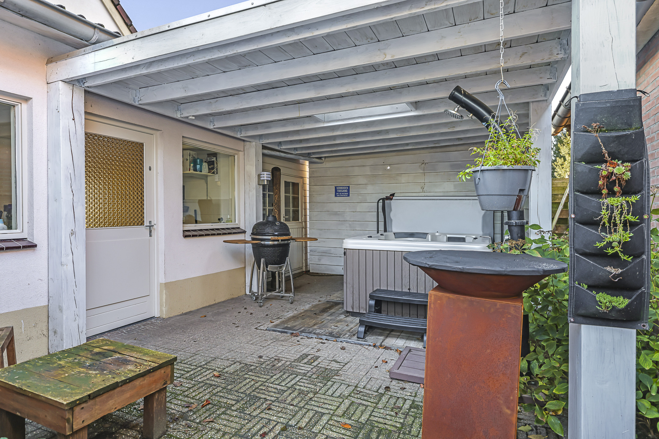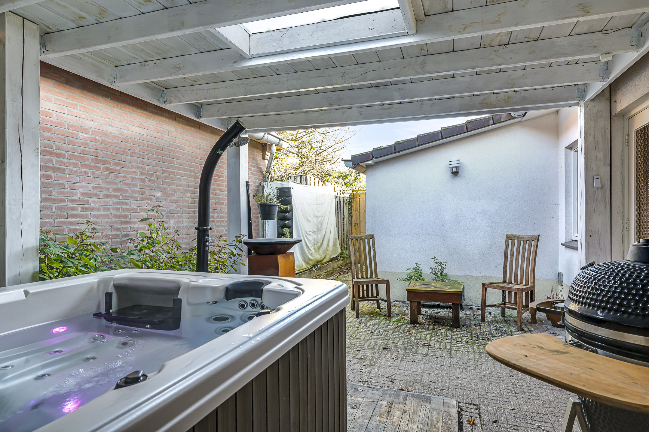 Deze woning staat op een perceel grond van 405m2 groot. De meeste tuin is aan de voor- en zijkant gelegen, maar ook aan de achterzijde vind je nog een heerlijke buitenruimte waar een flinke veranda van 20m2 is geplaatst. Wanneer het in de zomer te warm is om in de zon te zitten, dan duik je lekker onder de koele veranda. In de huidige setting is er een buitendouche en een jacuzzi onder de veranda geplaatst die beiden overigens met de verkoper mee gaan. En ook aan de zijkant van de woning, grenzend aan de schuifpui van de keuken is nog een lekker plekje onder een terrasoverkapping gecreëerd. Na een dag werken kun je hier in de avonduren alsnog heerlijk van de zon genieten terwijl je veel privacy geniet.