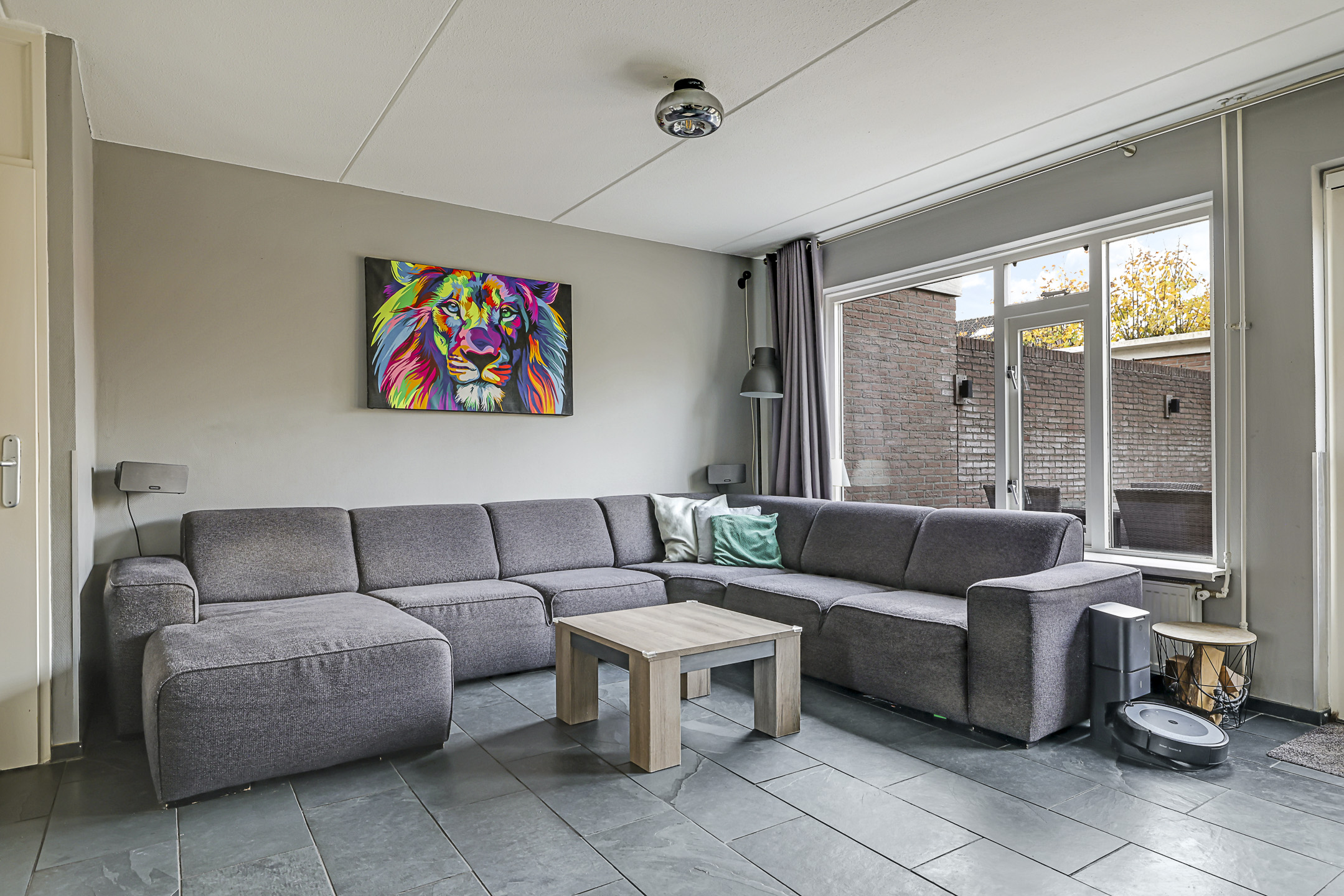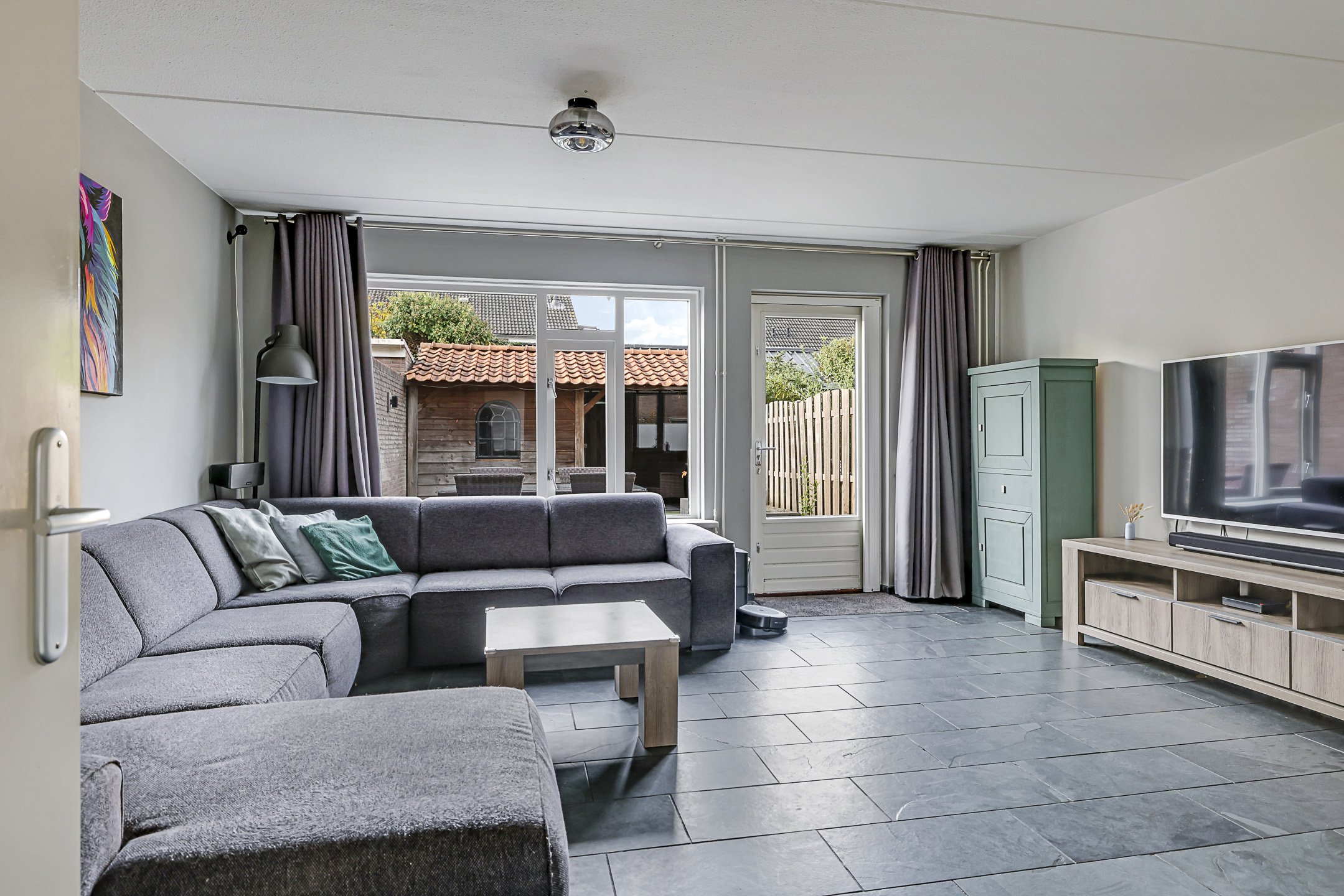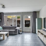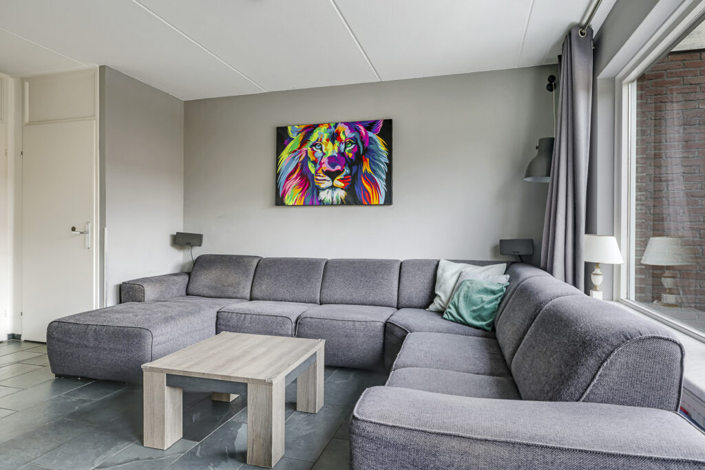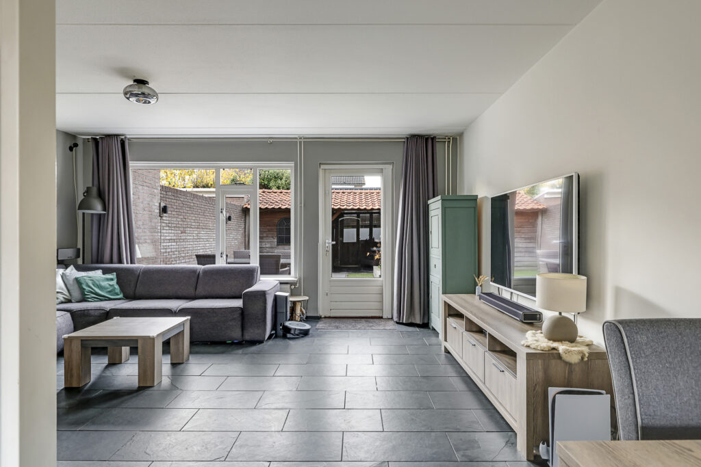 Een tuingerichte woonkamer met de ruimte voor een grote hoekbank en een plasmascherm tegen de muur. Wie wil dat nou niet? Deze woonkamer is tuingericht waarbij het grote raam voor een prettige lichtinval zorgt. Een tuindeur geeft je direct toegang tot het zonnige buitenterras. Deze tuindeur is voorzien van een plissé hordeur waardoor insecten geen kans krijgen. En op een warme zomerdag draai je het zonnescherm uit waardoor de zon kunt weren.