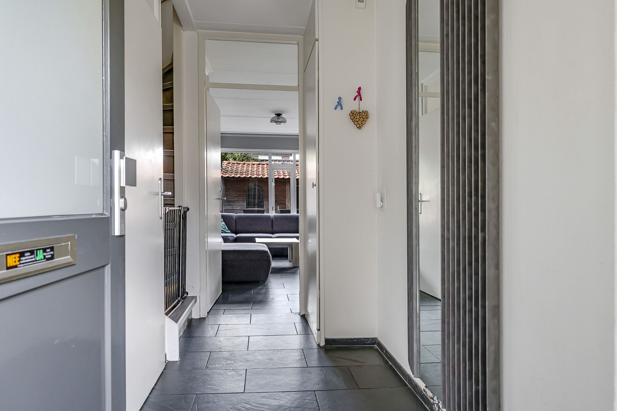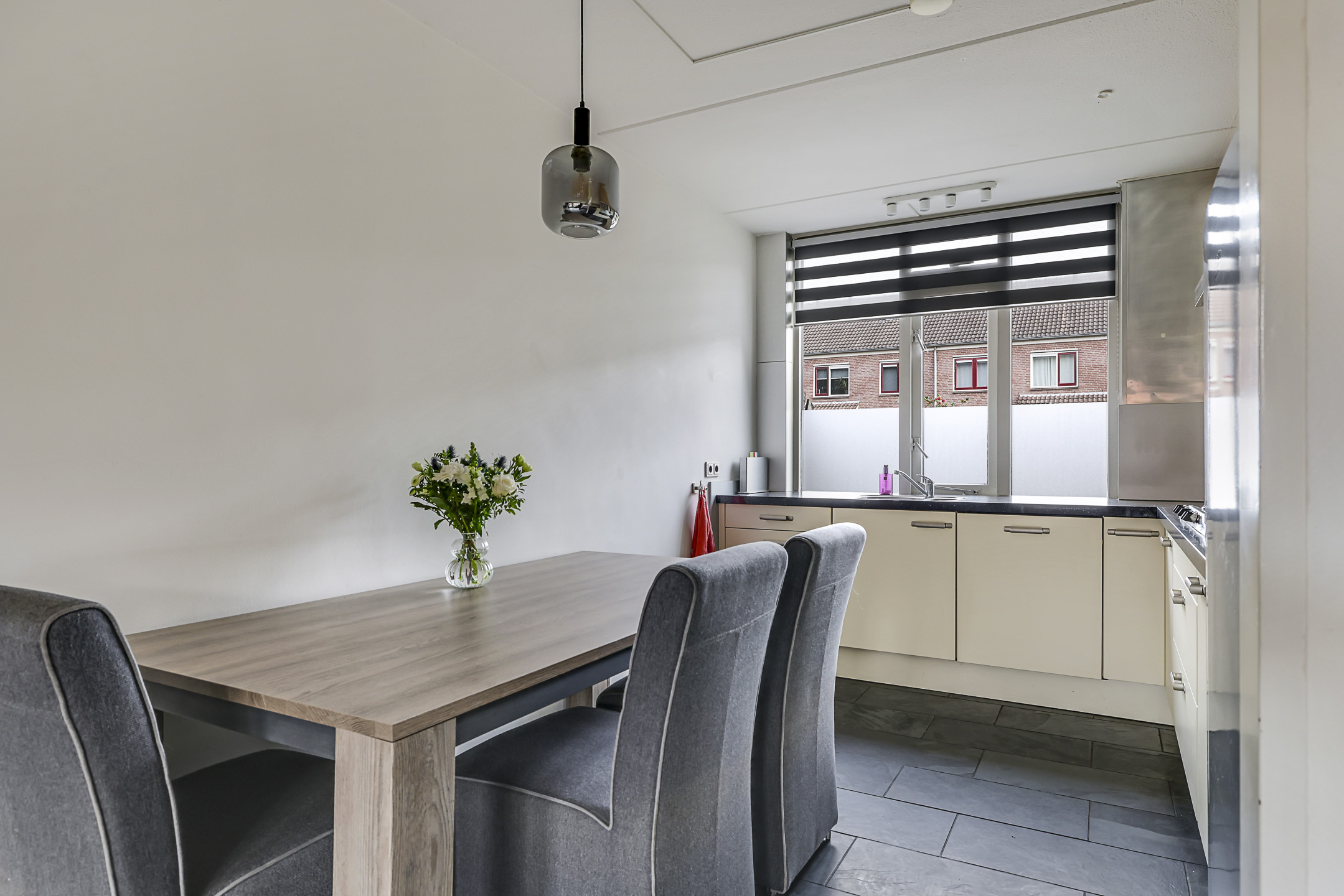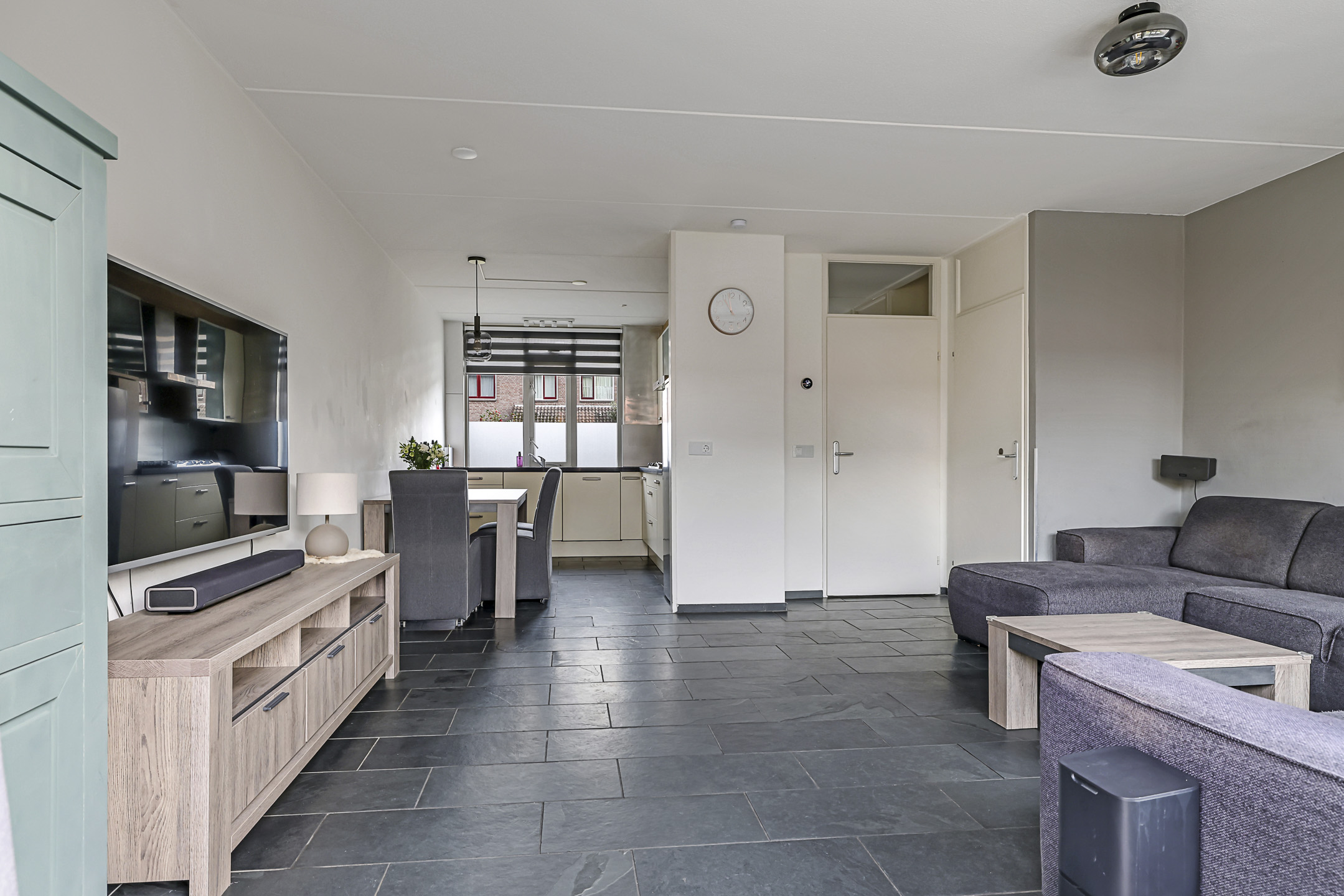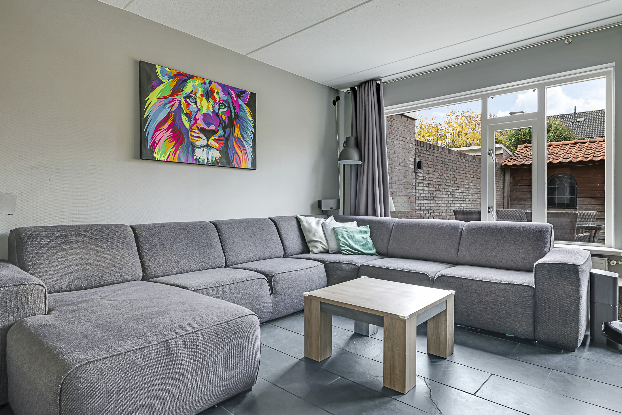 Een tuingerichte woonkamer met de ruimte voor een grote hoekbank en een plasmascherm tegen de muur. Wie wil dat nou niet? Deze woonkamer is tuingericht waarbij het grote raam voor een prettige lichtinval zorgt. Een tuindeur geeft je direct toegang tot het zonnige buitenterras. Deze tuindeur is voorzien van een plissé hordeur waardoor insecten geen kans krijgen. En op een warme zomerdag draai je het zonnescherm uit waardoor de zon kunt weren.