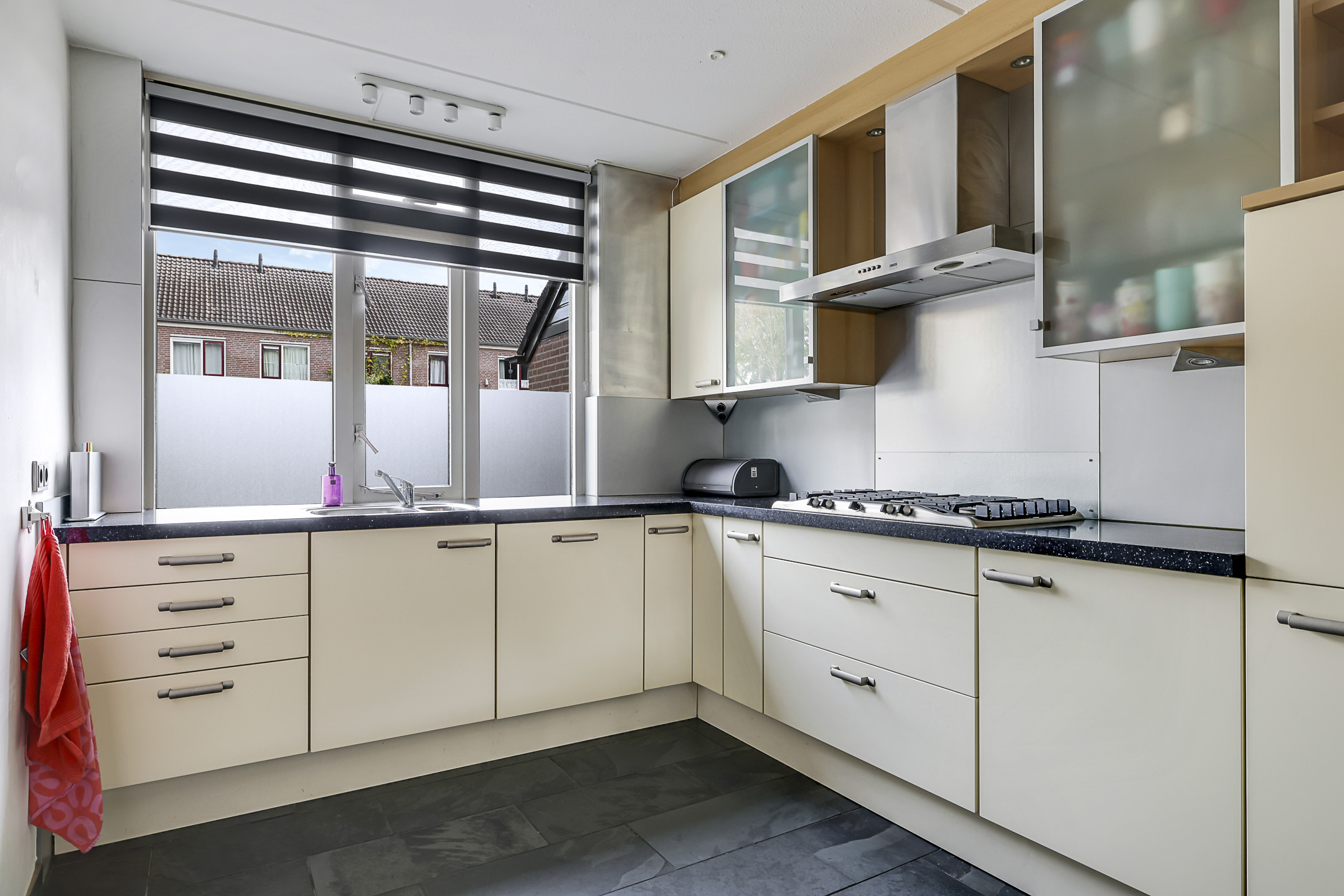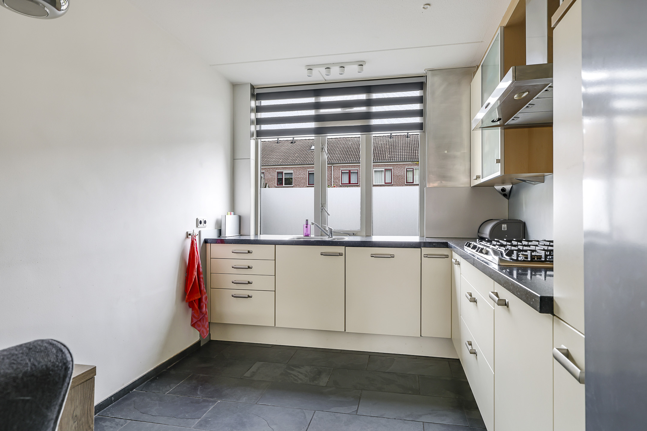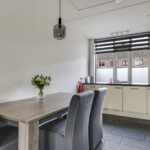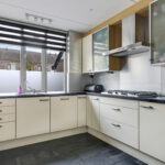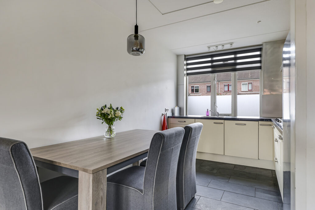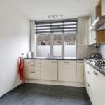De keuken is aan de voorzijde gelegen en heeft een open karakter met de woonkamer. De keuken is in een hoekopstelling geplaatst waarbij het natuurstenen aanrechtblad (terrazzo) direct opvalt. Als je van koken houdt, dan wordt je vast blij van dit mooie werkblad. De inbouwapparatuur bestaat uit een vaatwasser, een 5-pits gaskookplaat en een afzuigschouw. De losse koelkast en magnetron gaan met de verkoper mee. De keuken heeft relatief veel kastruimte, maar mocht je nog ruimte tekort komen, dan heb je nog de vaste kast onder de trap waar je veel voorraad en de stofzuiger kwijt kunt.