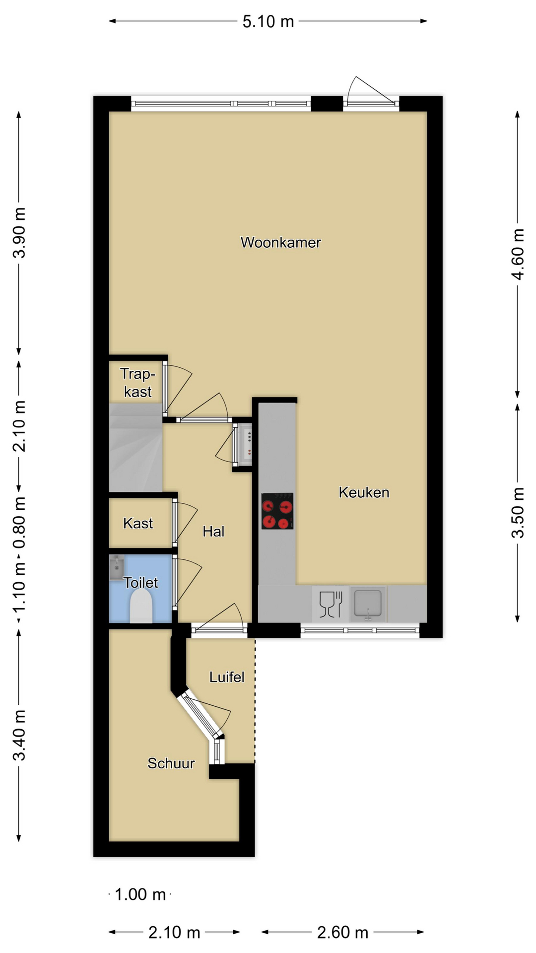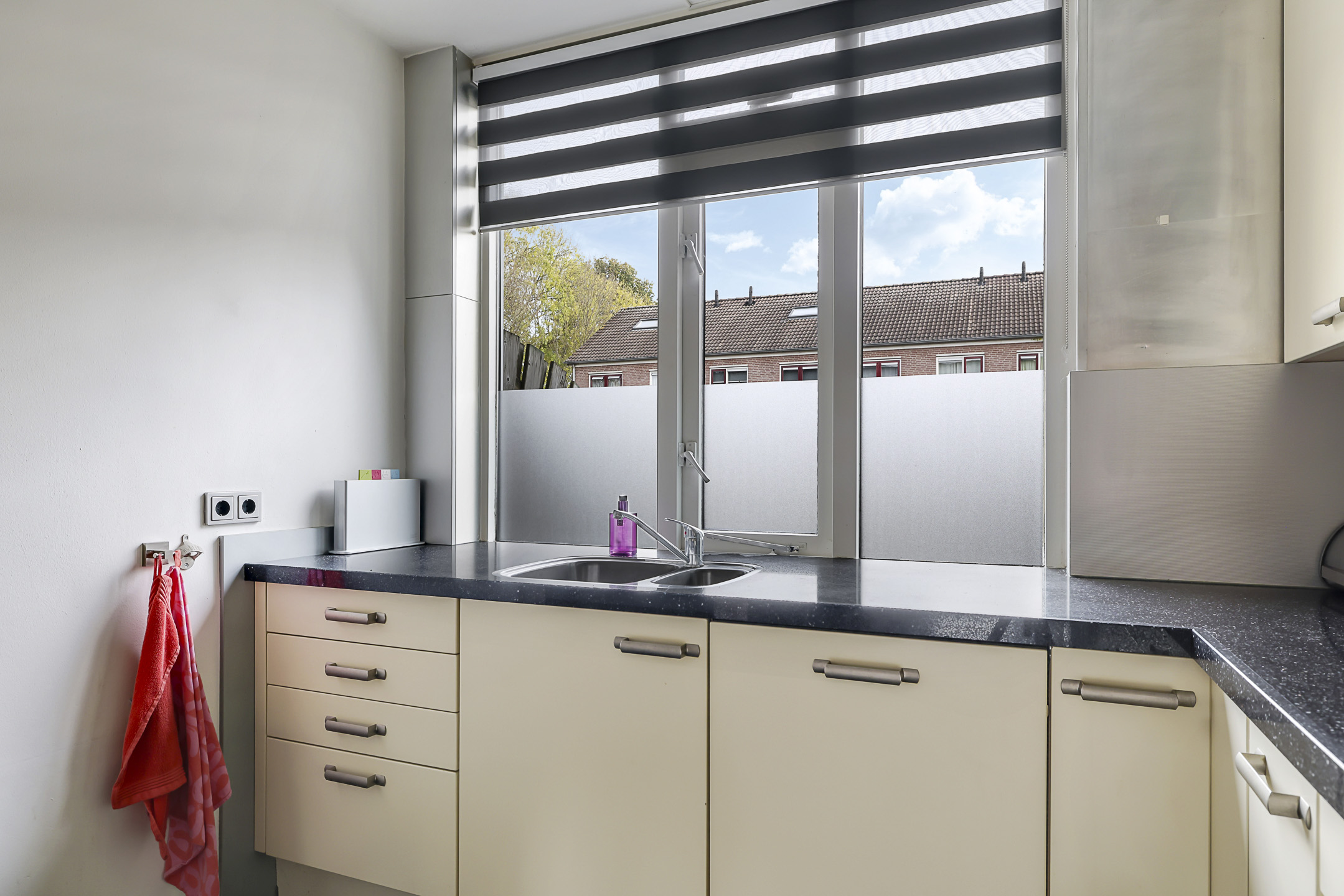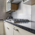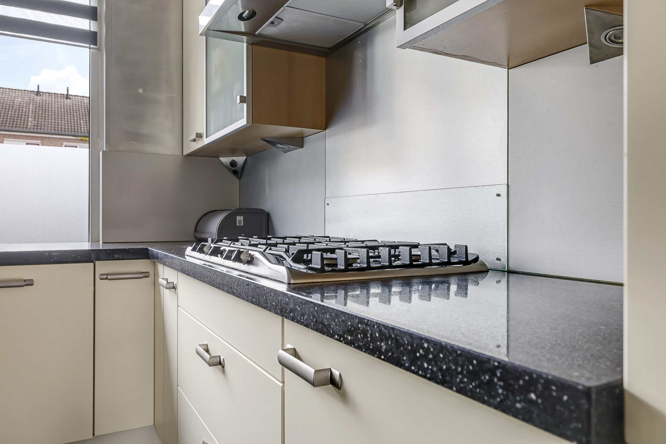 De keuken is aan de voorzijde gelegen en heeft een open karakter met de woonkamer. De keuken is in een hoekopstelling geplaatst waarbij het natuurstenen aanrechtblad (terrazzo) direct opvalt. Als je van koken houdt, dan wordt je vast blij van dit mooie werkblad. De inbouwapparatuur bestaat uit een vaatwasser, een 5-pits gaskookplaat en een afzuigschouw. De losse koelkast en magnetron gaan met de verkoper mee. De keuken heeft relatief veel kastruimte, maar mocht je nog ruimte tekort komen, dan heb je nog de vaste kast onder de trap waar je veel voorraad en de stofzuiger kwijt kunt.