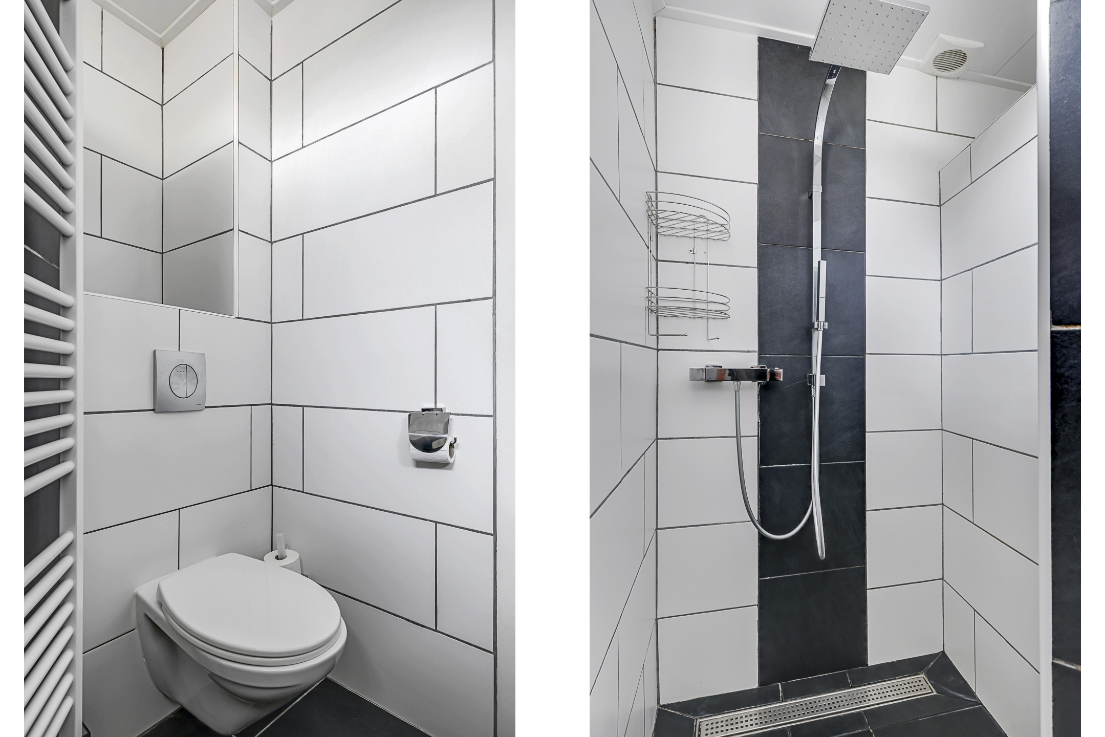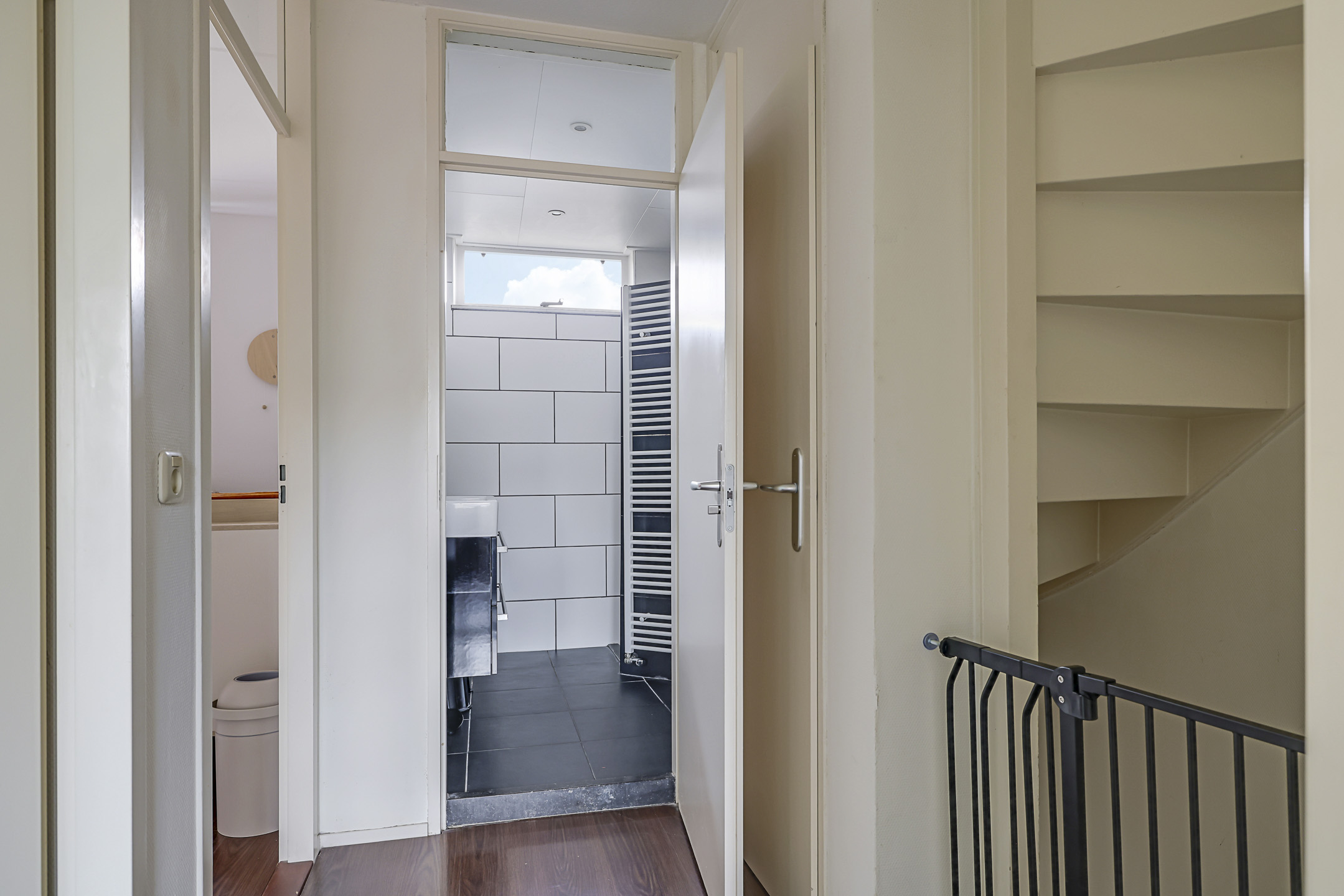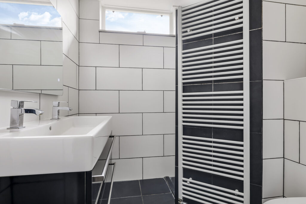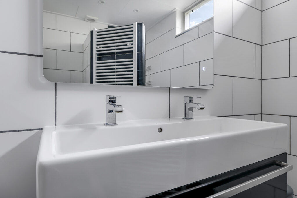 Het kan niet anders dan dat je deze badkamer zult aanspreken. De badkamer is neutraal afgewerkt en heeft een frisse en moderne uitstraling. De ruimte is ingedeeld met een comfortabele inloopdouche, een breed 2-persoons wastafelmeubel en een 2e (zwevend) toilet. De inloopdouche voelt erg comfortabel aan, mede doordat het een rainshower én een handdouche heeft. Het tegelwerk is degelijk met daarbij een ingetegelde drainafvoer. Het wastafelmeubel heeft een brede lade waar je de nodige toiletspullen kunt opbergen. Erboven hangt een evenzo brede spiegel voorzien van verlichting. Een handdoekradiator en inbouwspots maken deze badkamer compleet. Koude voeten hoef je hier niet te krijgen aangezien de vloer is voorzien van vloerverwarming (op de CV). Er is afzuiging aanwezig, maar je kunt ook ventileren door het raam open te zetten. Dit zorgt tevens voor een prettige lichtinval.
