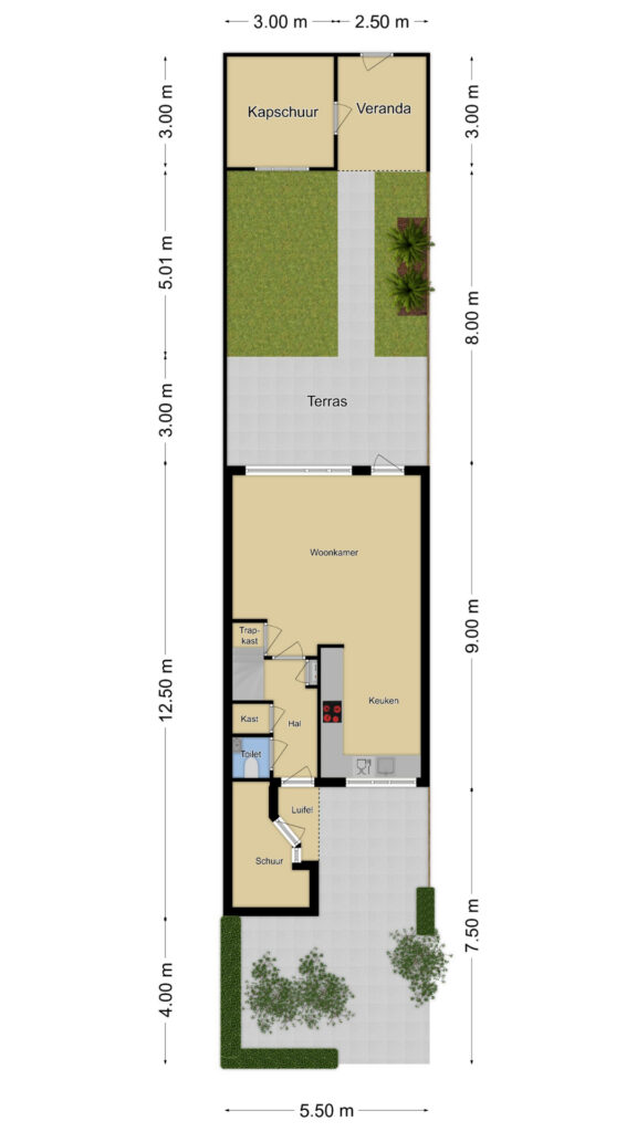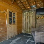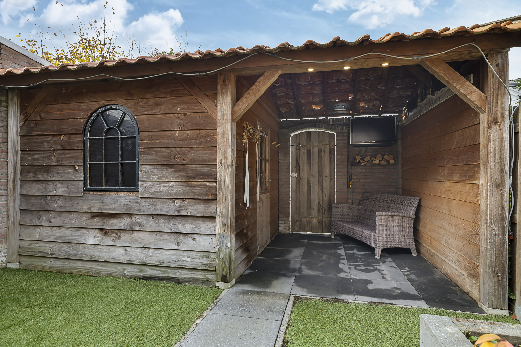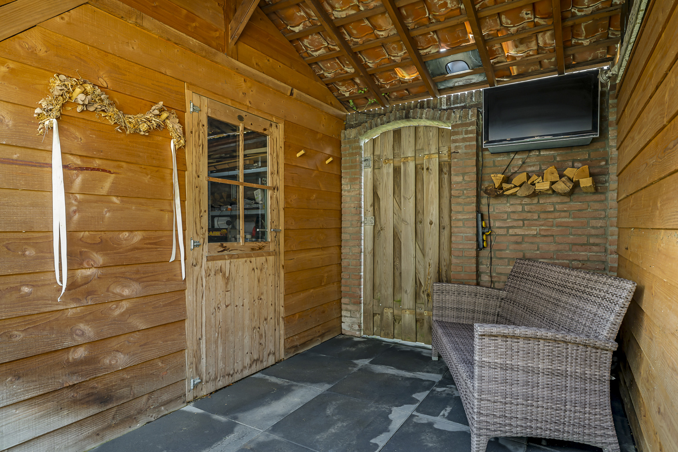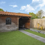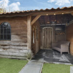 Achterin de tuin staat een stijlvolle kapschuur die met pannen is gedekt. Deze is over de volle breedte van de tuin gebouwd en biedt door de hoge nok extra privacy. De kapschuur is opgedeeld in een berging van 9m2 groot en een overdekte zithoek (veranda). Hier zou je zelfs TV buiten kunnen kijken. Omdat je ook al een schuur aan de voorzijde van de woning tegenkomt, zou je deze schuur kunnen gebruiken als hobby/klusruimte. Of wanneer je een grotere veranda wenst, zou je het schuurgedeelte open kunnen maken zodat je over de volledige breedte van de tuin een veranda creëert.