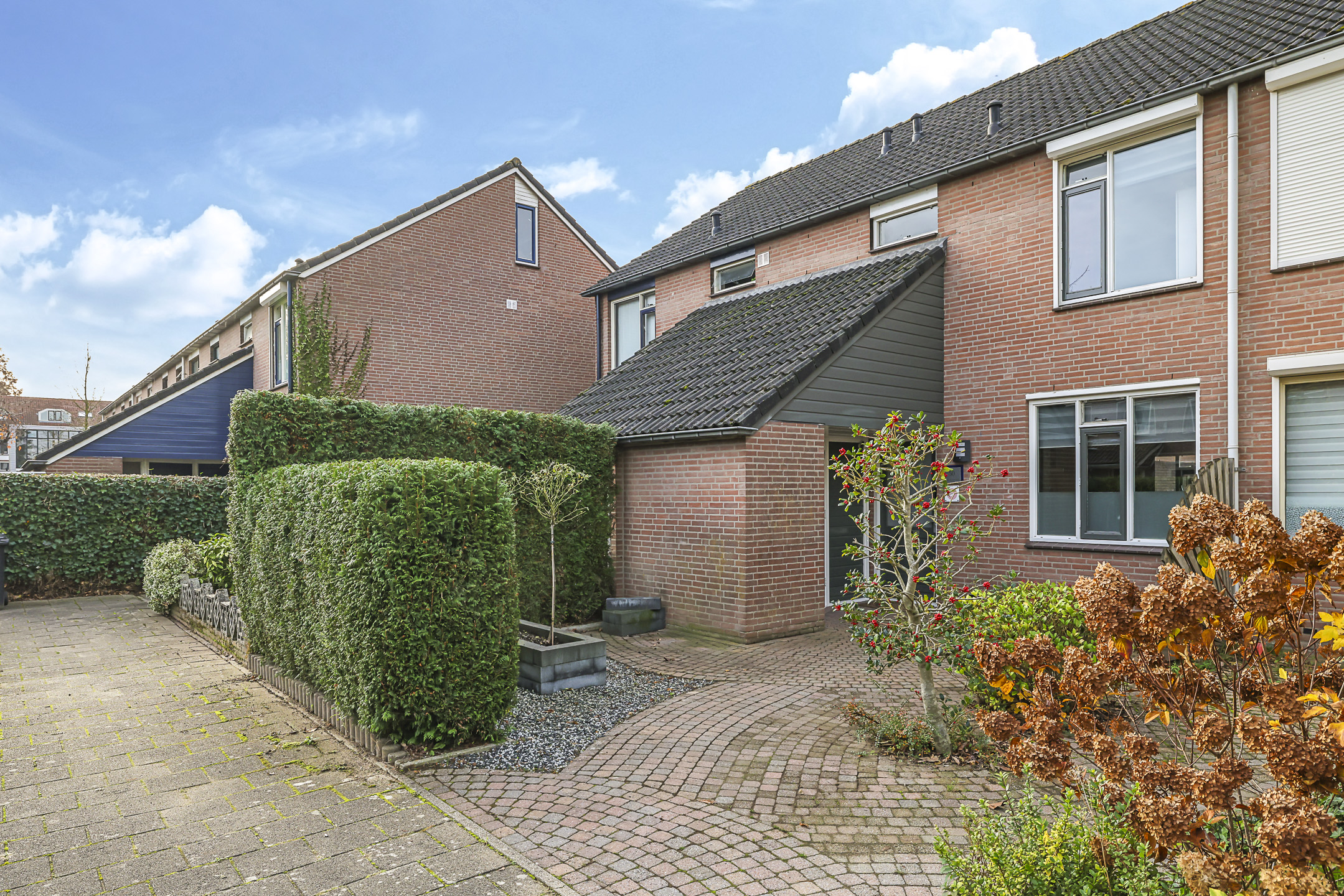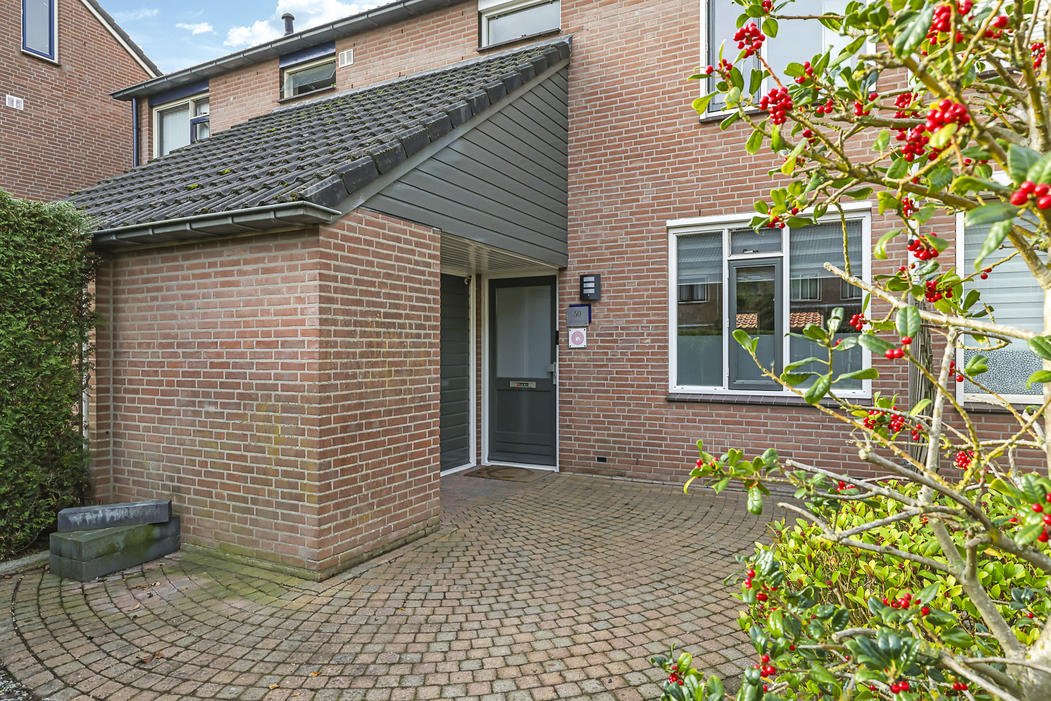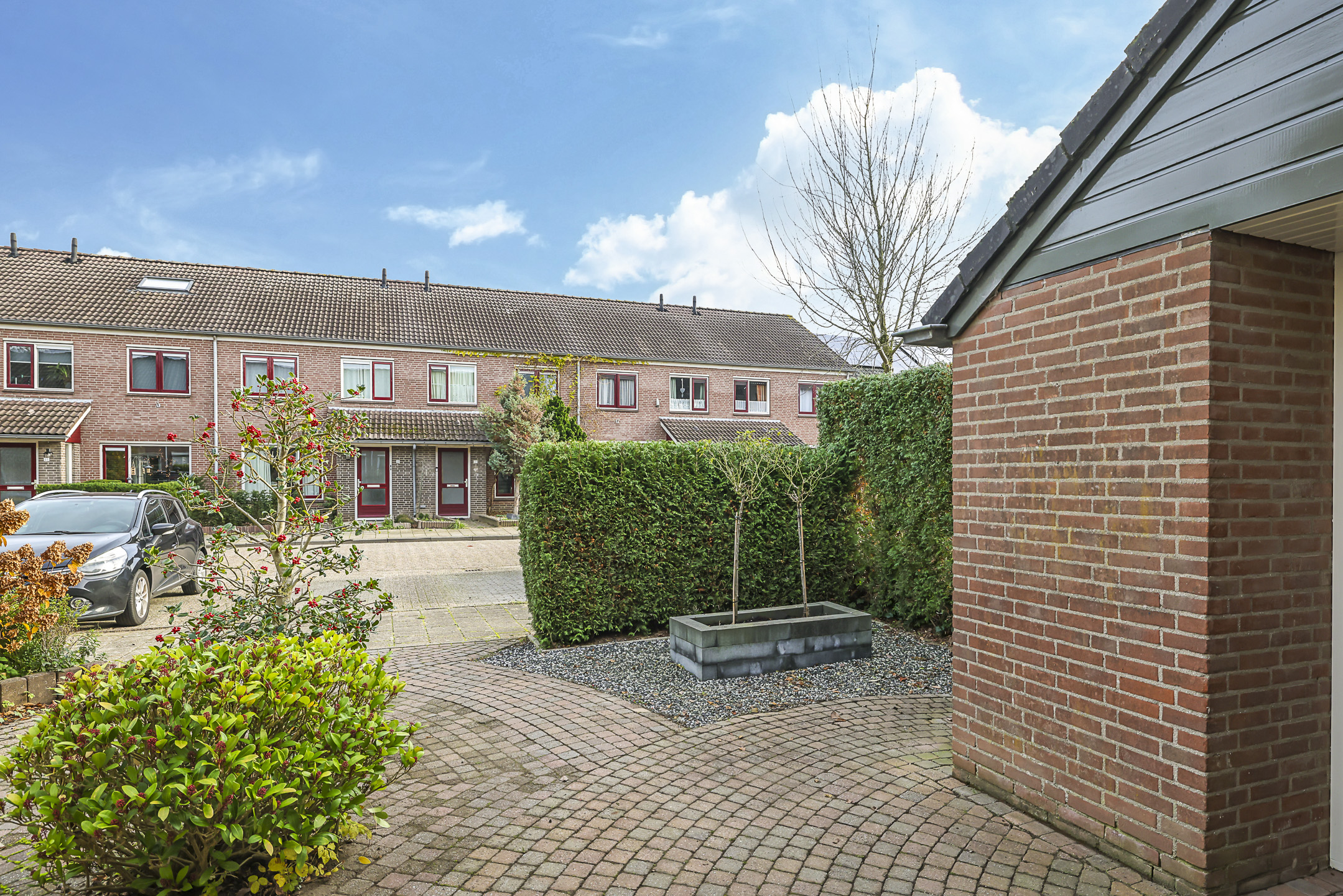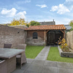 Deze woning heeft een speels en onderscheidend aanzicht doordat er aan de voorzijde een stenen berging met luifel is aangebouwd. Dit maakt deze woning extra bijzonder. De schuur is erg praktisch aangezien je hier veel extra opbergmogelijkheden hebt. Zeker wanneer je de hoogte onder de schuine kap van de schuur benut. Winterbanden, skispullen of fietsen kun je hier met gemak kwijt. Tegelijkertijd biedt deze ‘aanbouw’ ook een luifel bij de voordeur. Hierdoor sta je bij de voordeur altijd droog.
