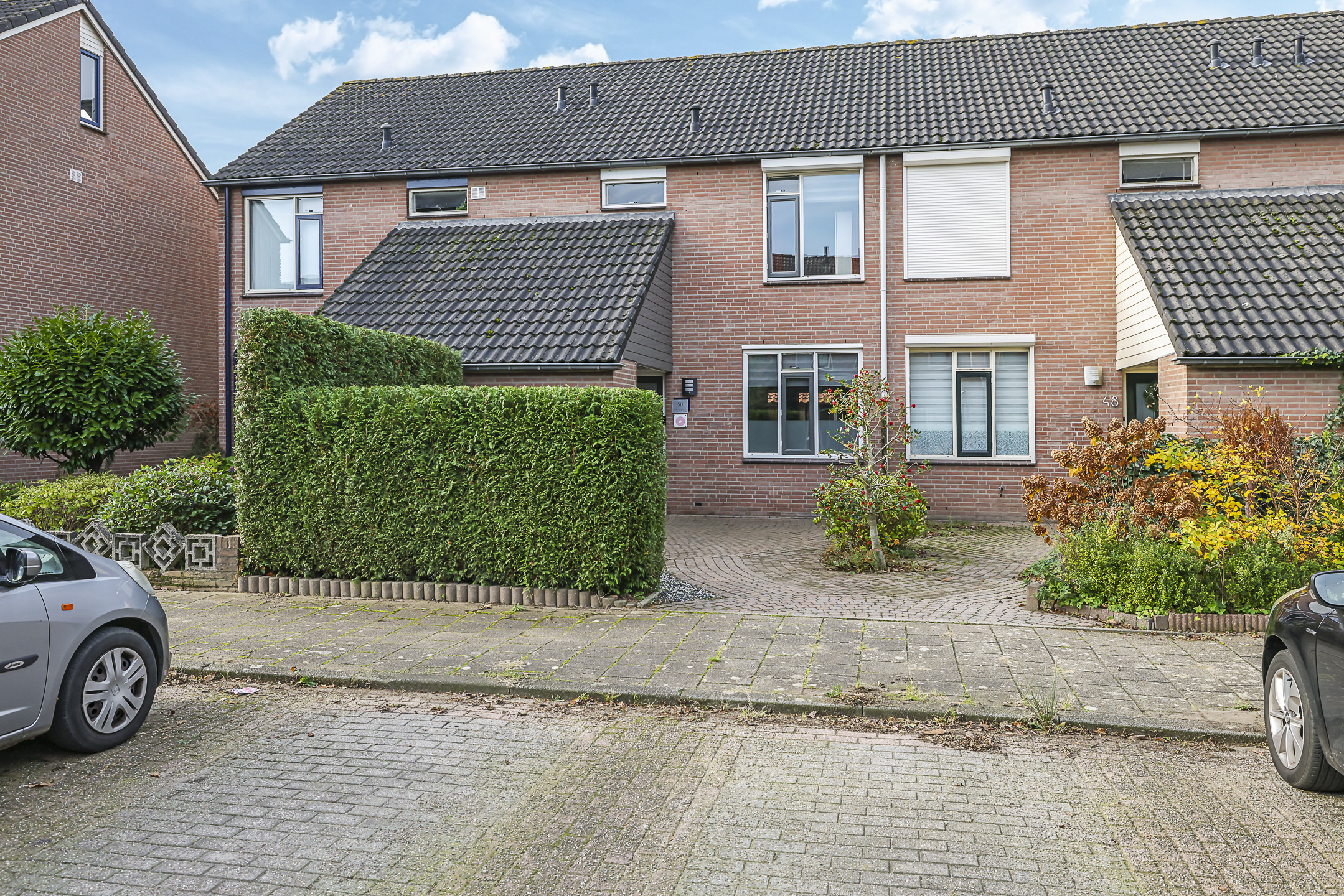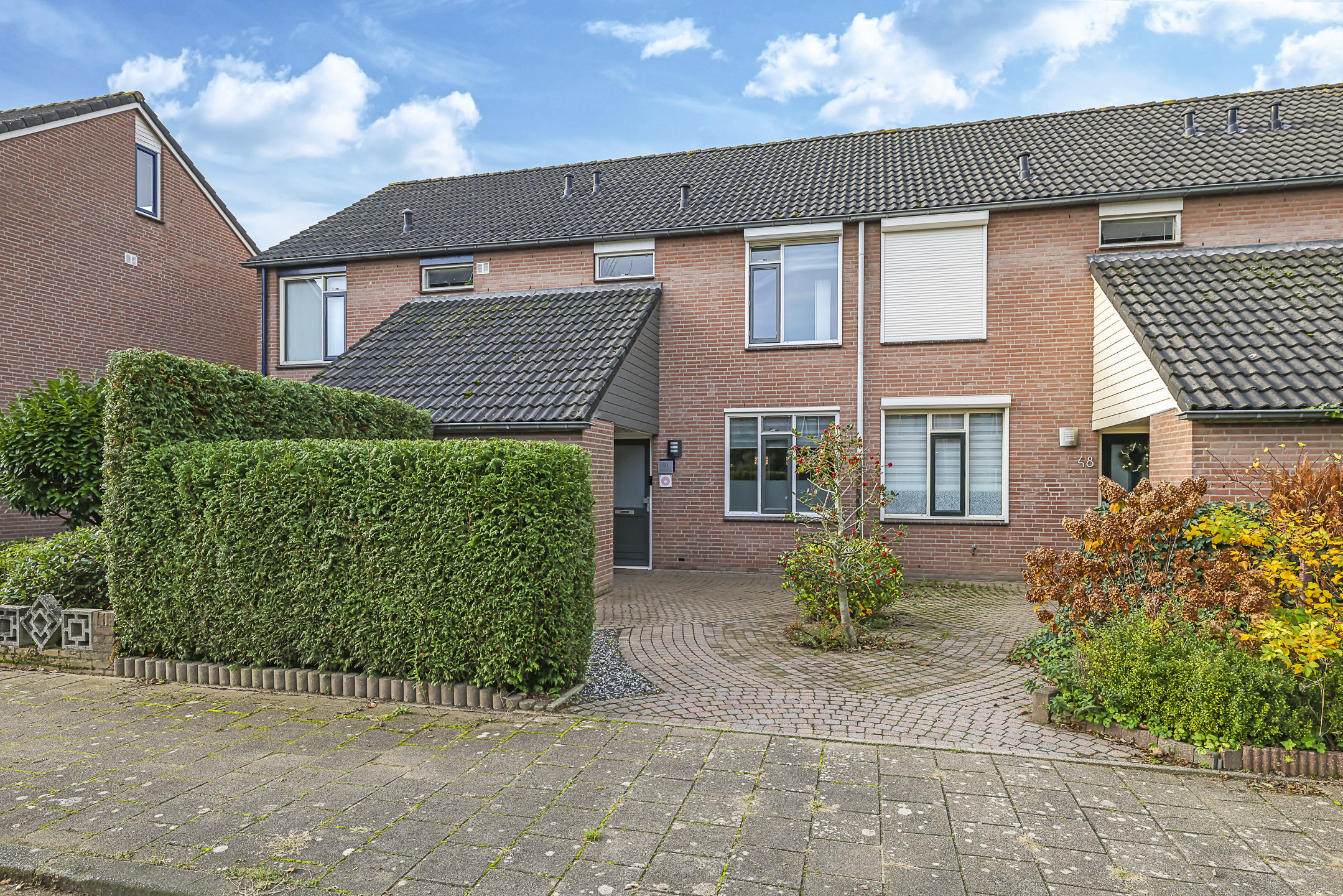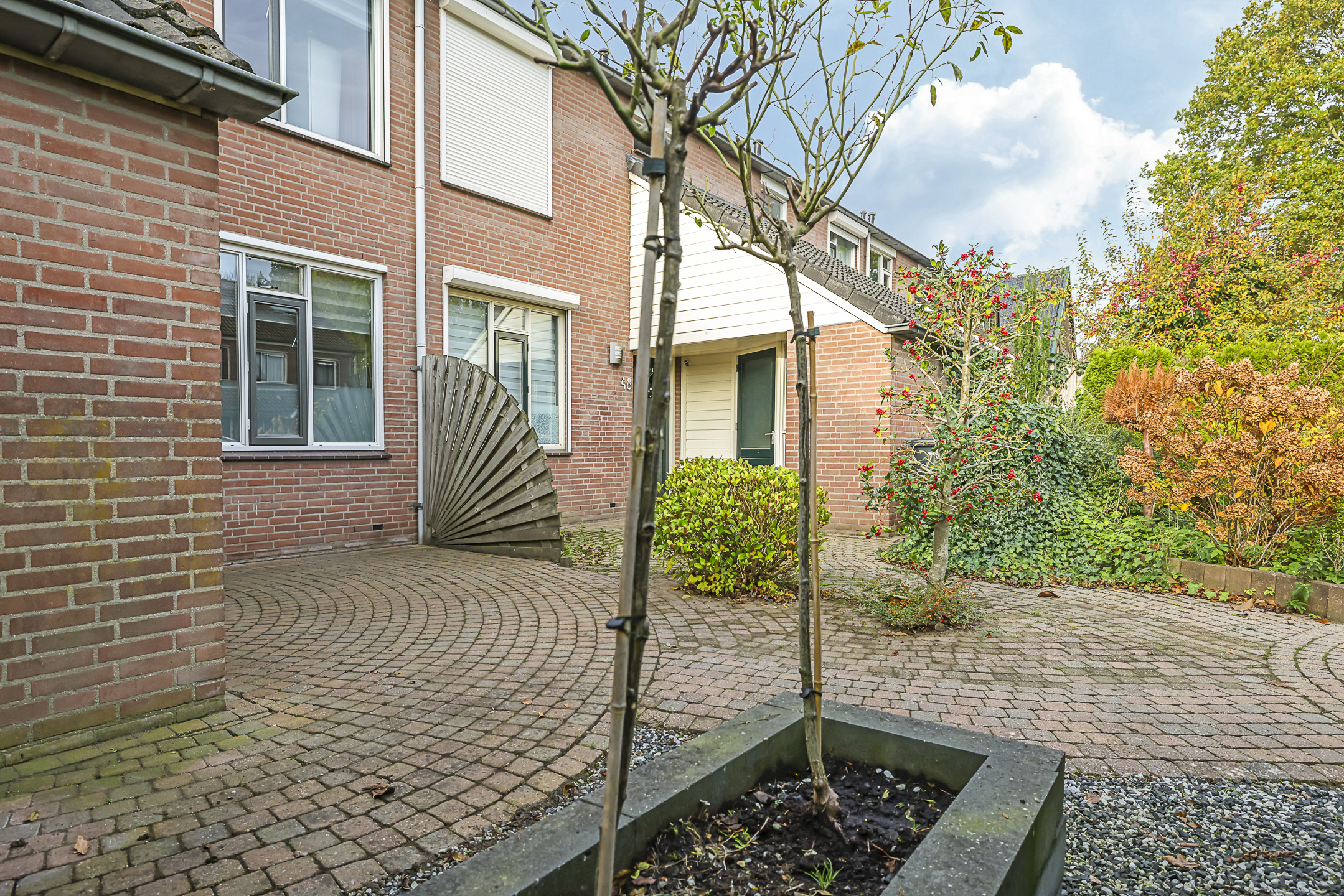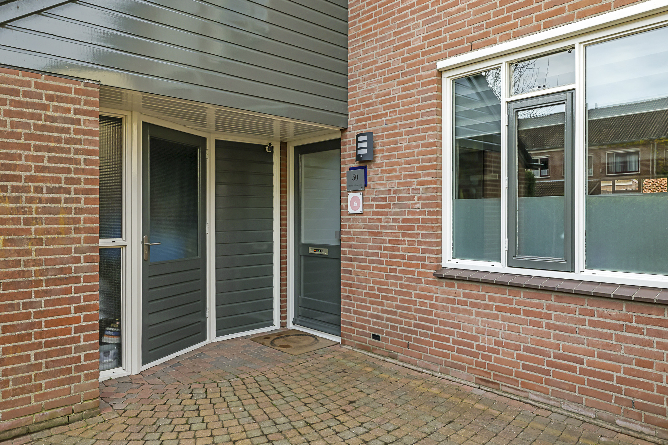 Deze woning heeft een speels en onderscheidend aanzicht doordat er aan de voorzijde een stenen berging met luifel is aangebouwd. Dit maakt deze woning extra bijzonder. De schuur is erg praktisch aangezien je hier veel extra opbergmogelijkheden hebt. Zeker wanneer je de hoogte onder de schuine kap van de schuur benut. Winterbanden, skispullen of fietsen kun je hier met gemak kwijt. Tegelijkertijd biedt deze ‘aanbouw’ ook een luifel bij de voordeur. Hierdoor sta je bij de voordeur altijd droog.