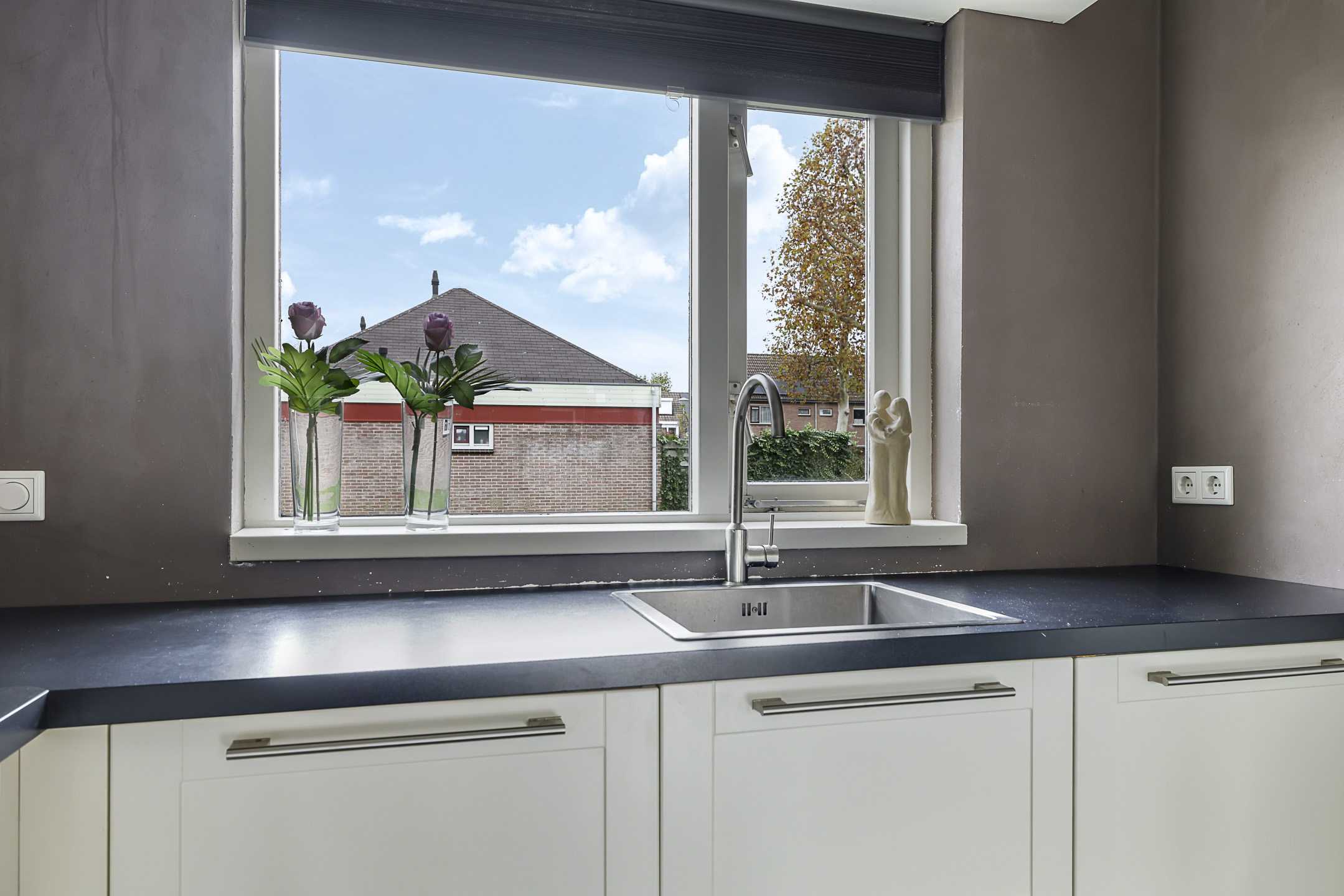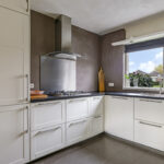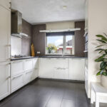 Aan de voorzijde bevindt zich de moderne keuken welke is geplaatst in een hoekopstelling en is voorzien van een neutrale kleurstelling. De keuken is compleet ingericht met diverse inbouwapparatuur, zijnde een 5-pits gaskookplaat, een afzuigschouw, een vaatwasser, een koel/vriescombinatie, een grote hete lucht oven en een combi-oven/magnetron. Brede ladekorven met verdekte besteklades en een draaicarrousel in de hoek kom je hier geen opbergruimte tekort. In de hoek van de keuken tref je nog een koffiecorner. In de keuken liggen plavuizen welke zijn voorzien van aangename vloerverwarming. Aan de voorzijde van de woning kijk je uit op een groenstrook waardoor je tijdens het koken prettig van je afkijkt.