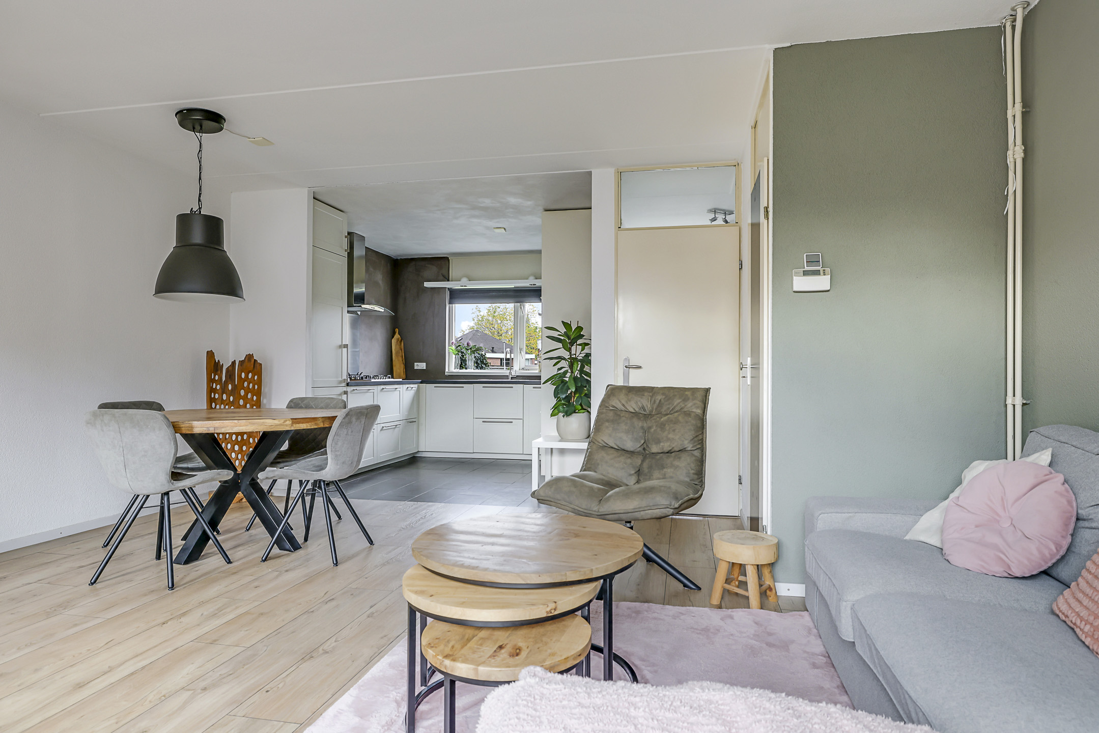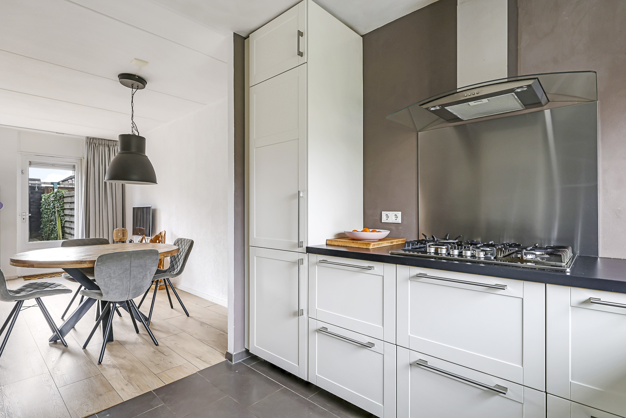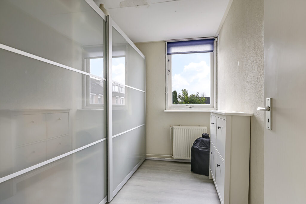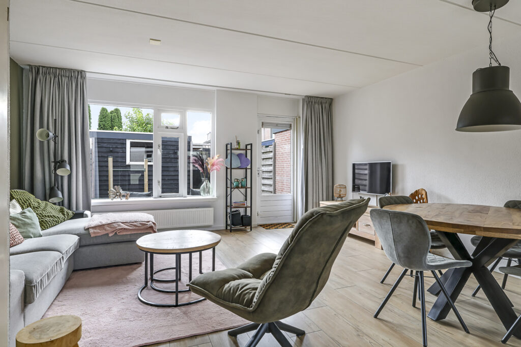 De woonkamer is aan de achterzijde gelegen en over de volle breedte van de woning gesitueerd. De grote raampartij met tuindeur zorgt voor veel lichtinval en een directe verbinding met de zonnige tuin. Door de vierkante indeling laat de ruimte zich eenvoudig inrichten met een gezellige zithoek en eethoek. De laminaatvloer geeft een warme uitstraling en de trapkast met ingebouwde schappen biedt praktische bergruimte.