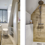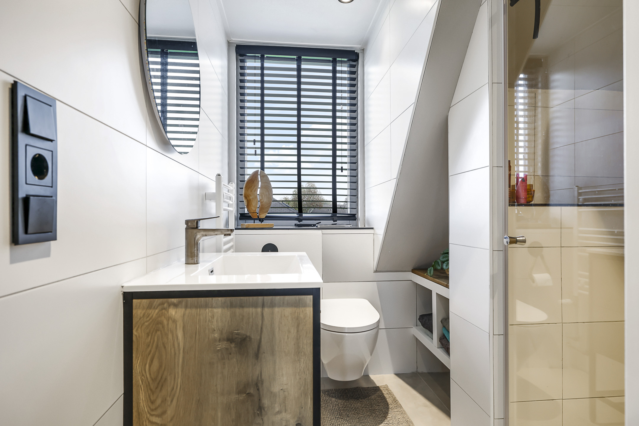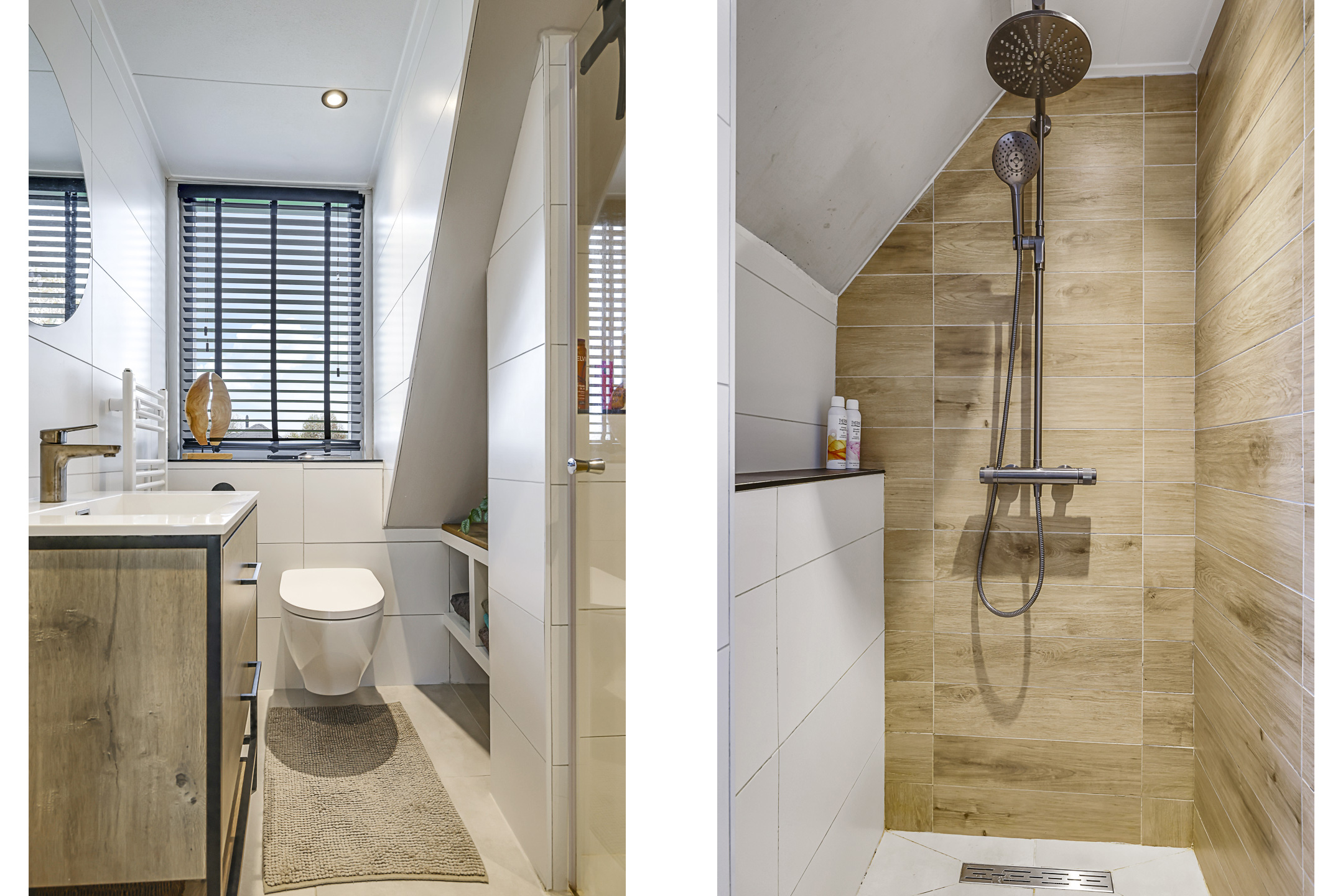 De badkamer is in 2024 vernieuwd en daarbij dus nog zo goed als nieuw. De ruimte is ingericht met een inloopdouche, een 2e toilet (zwevend geplaatst) en een wastafelmeubel. De douche is voorzien van een drainafvoer, een regendouche en een handdouche. Een ingetegelde planchet zorgt voor ruimte voor de doucheproducten. De spiegel boven het wastafelmeubel is voorzien van verlichting en verwarming. Naast lades in het meubel is er ook onder het schuine dakvlak een nis aanwezig voor de nodige opbergruimte. Doordat de dakkapel ook hier doorloopt heb je een groot raam en tevens een fijne ventilatiemogelijkheid. Er is ook afzuiging aanwezig.