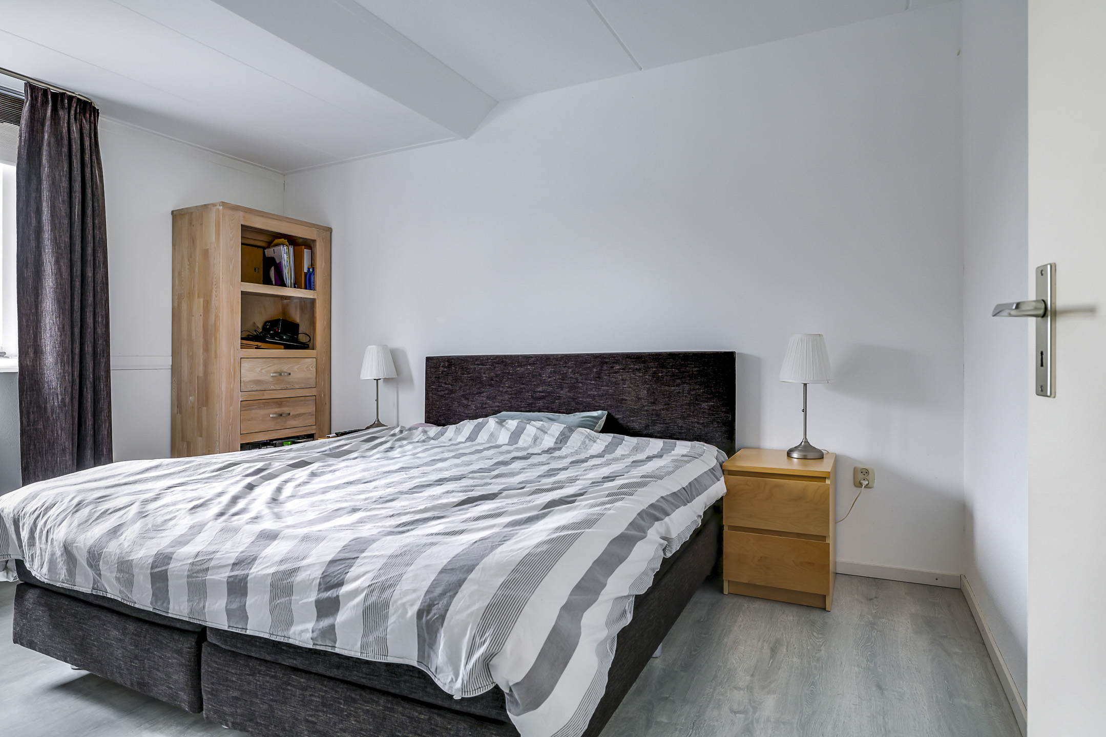 De eerste verdieping is verrassend ruim ingedeeld met drie slaapkamers en de badkamer. Opvallend is dat de dakkapel aan de achterzijde over de maximale breedte is geplaatst, hierdoor zijn de schuine dakvlakken op achtergelegen slaapkamers helemaal verdwenen. Ook aan de voorzijde is een dakkapel geplaatst waardoor ook de hoofdslaapkamer en de badkamer zijn vergroot en eenvoudiger zijn in te richten. De kamers zijn respectievelijk 12m², 9m² en 7m² groot. De laminaatvloer is drempelloos doorgelegd wat zorgt voor een eenduidig geheel.
