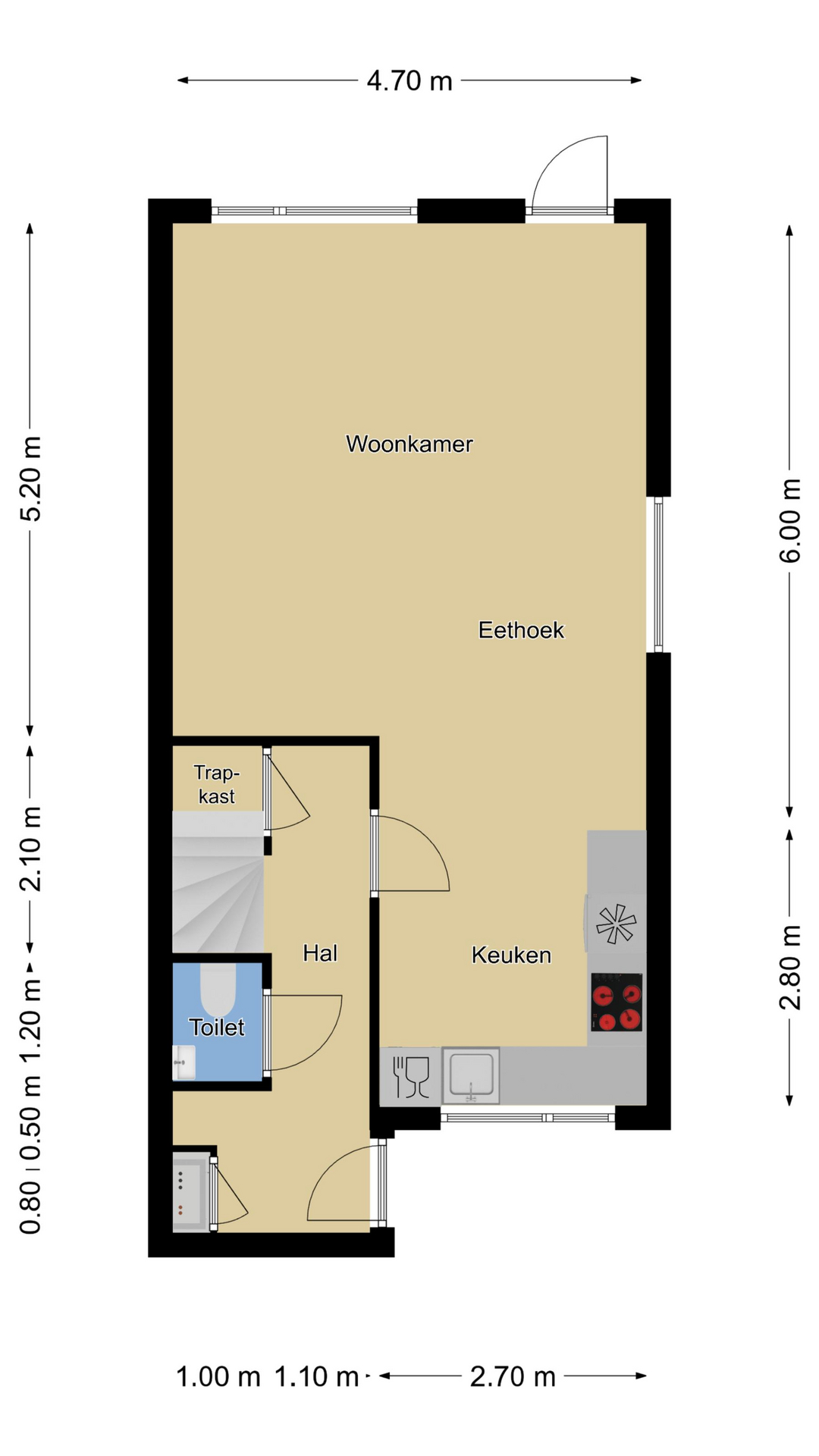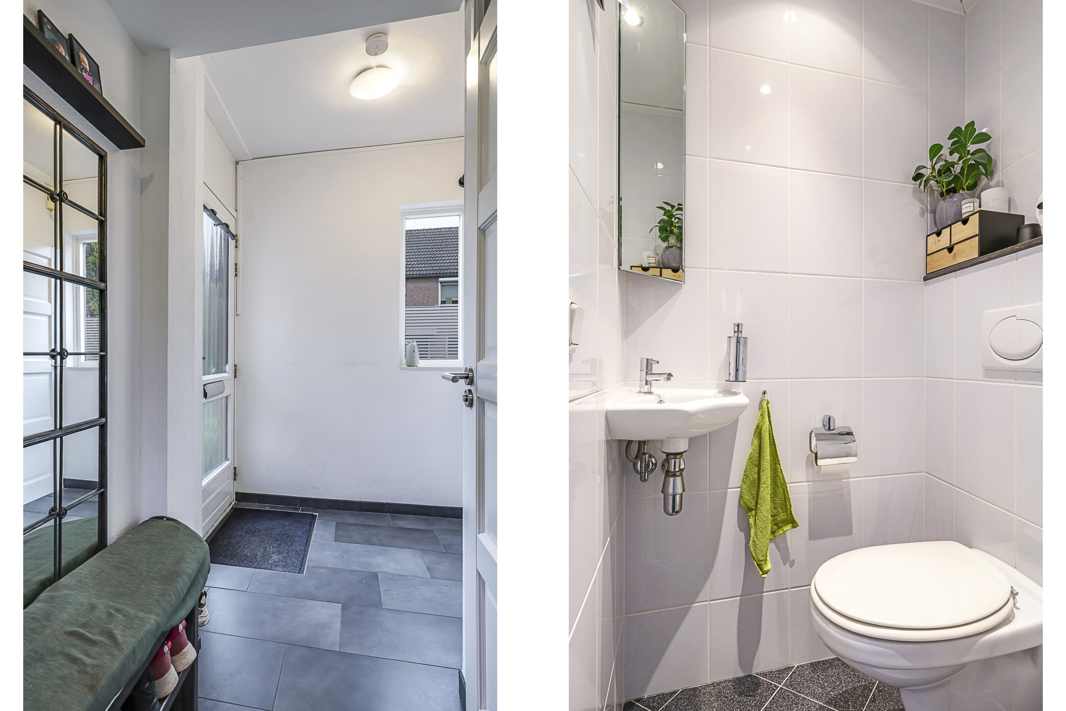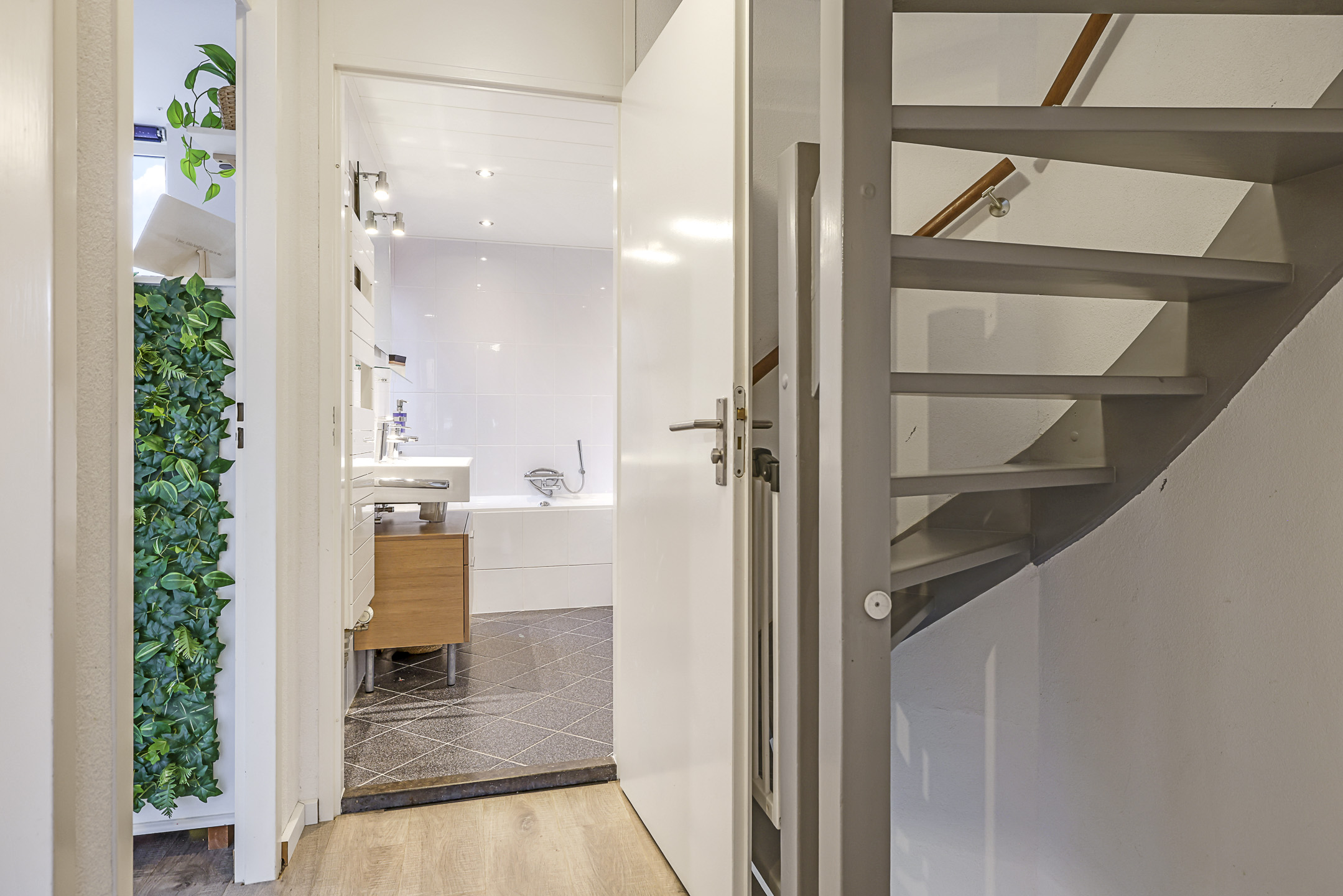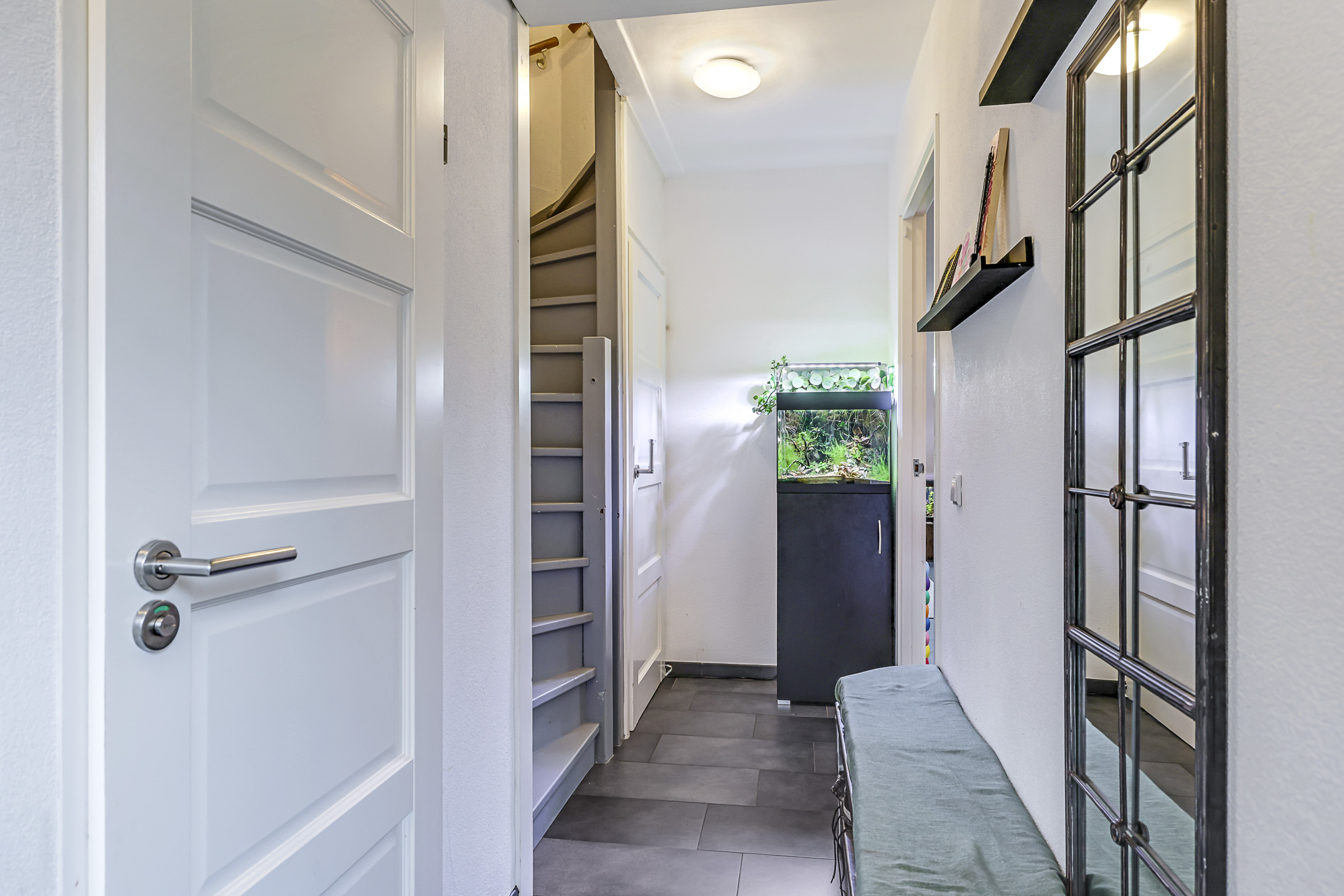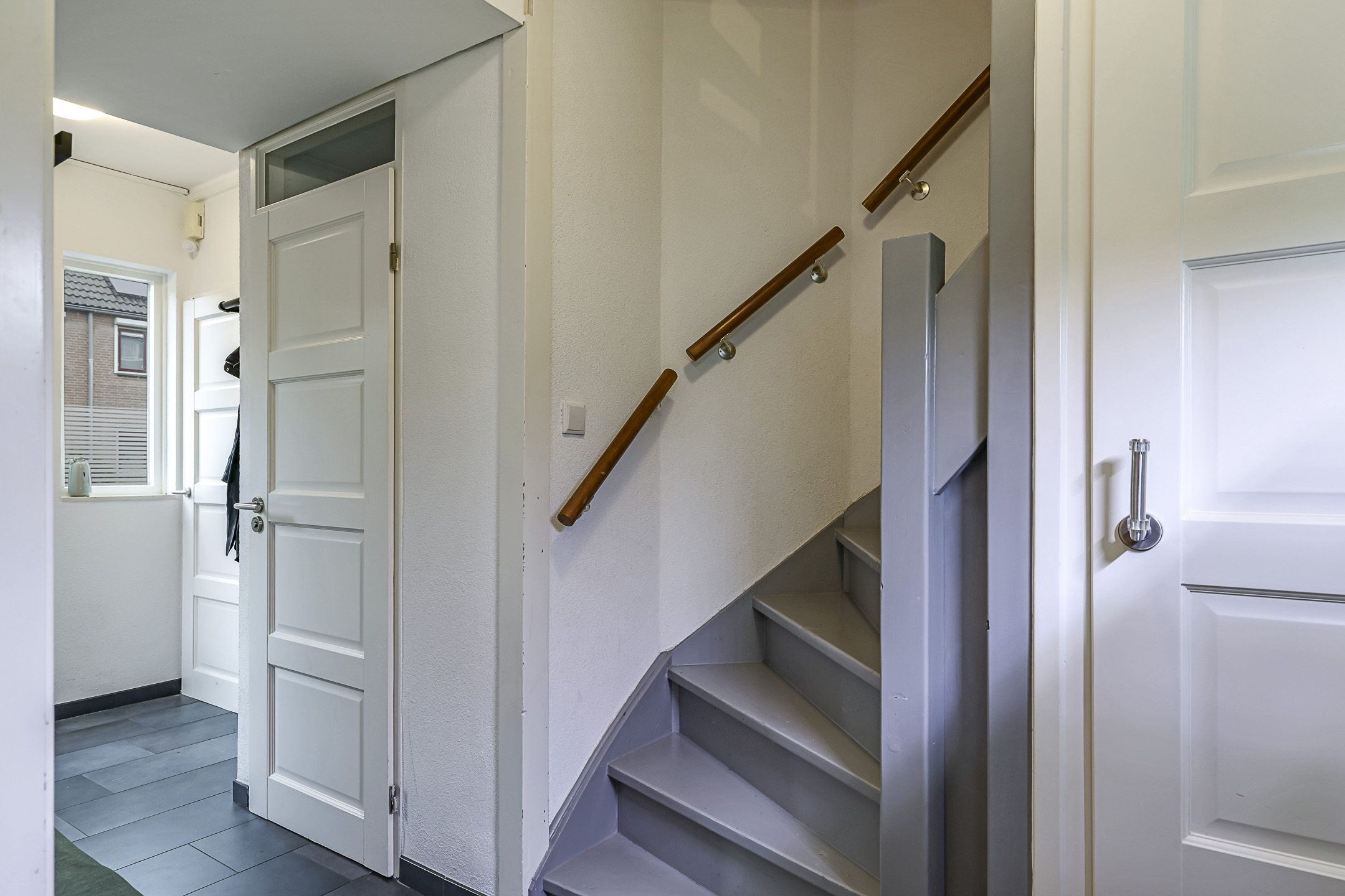 De hal is aan de voorzijde van de woning als een soort van ‘uitbouw’ buiten de voorgevel gebouwd. Dit geeft niet alleen een speels karakter maar zorgt ook voor meer ruimte. In de hal tref je de (vernieuwde) meterkast, een garderobenis voor de jassen, het moderne toilet en de trapopgang. Onder de trap vind je nog een proviandkast met schappen waar je de voorraad en de stofzuiger kunt opbergen. Noemenswaardig zijn de luxere paneeldeuren met rvs-deurbeslag die net even wat sfeervoller zijn dan de originele deuren die er ooit in hebben gezeten.