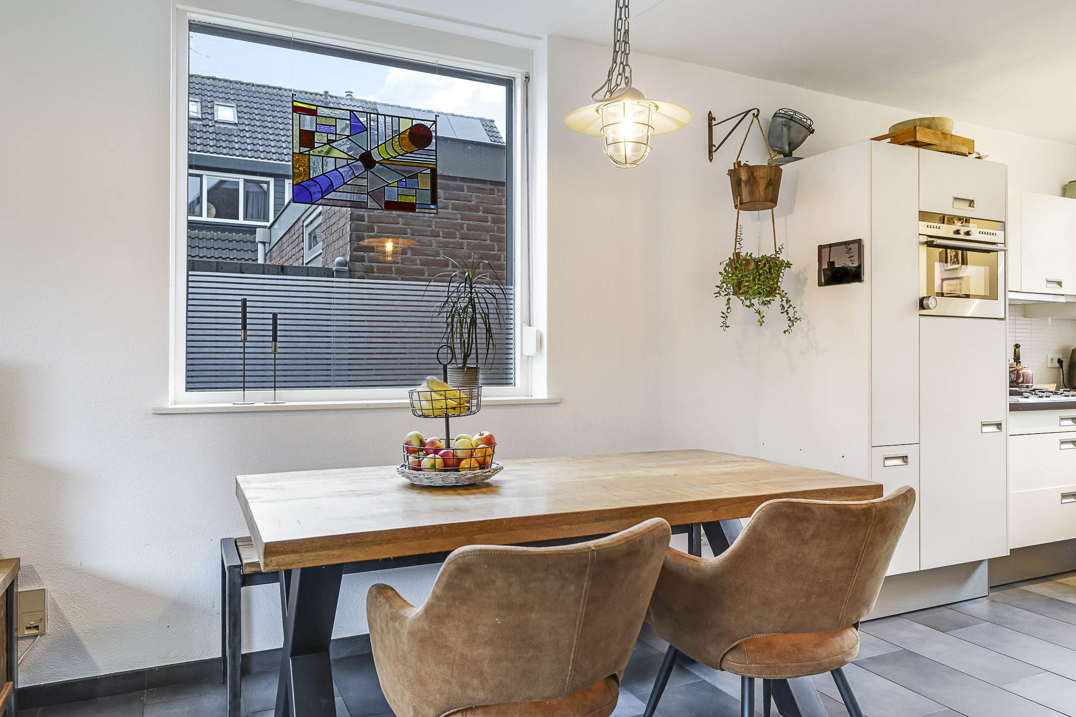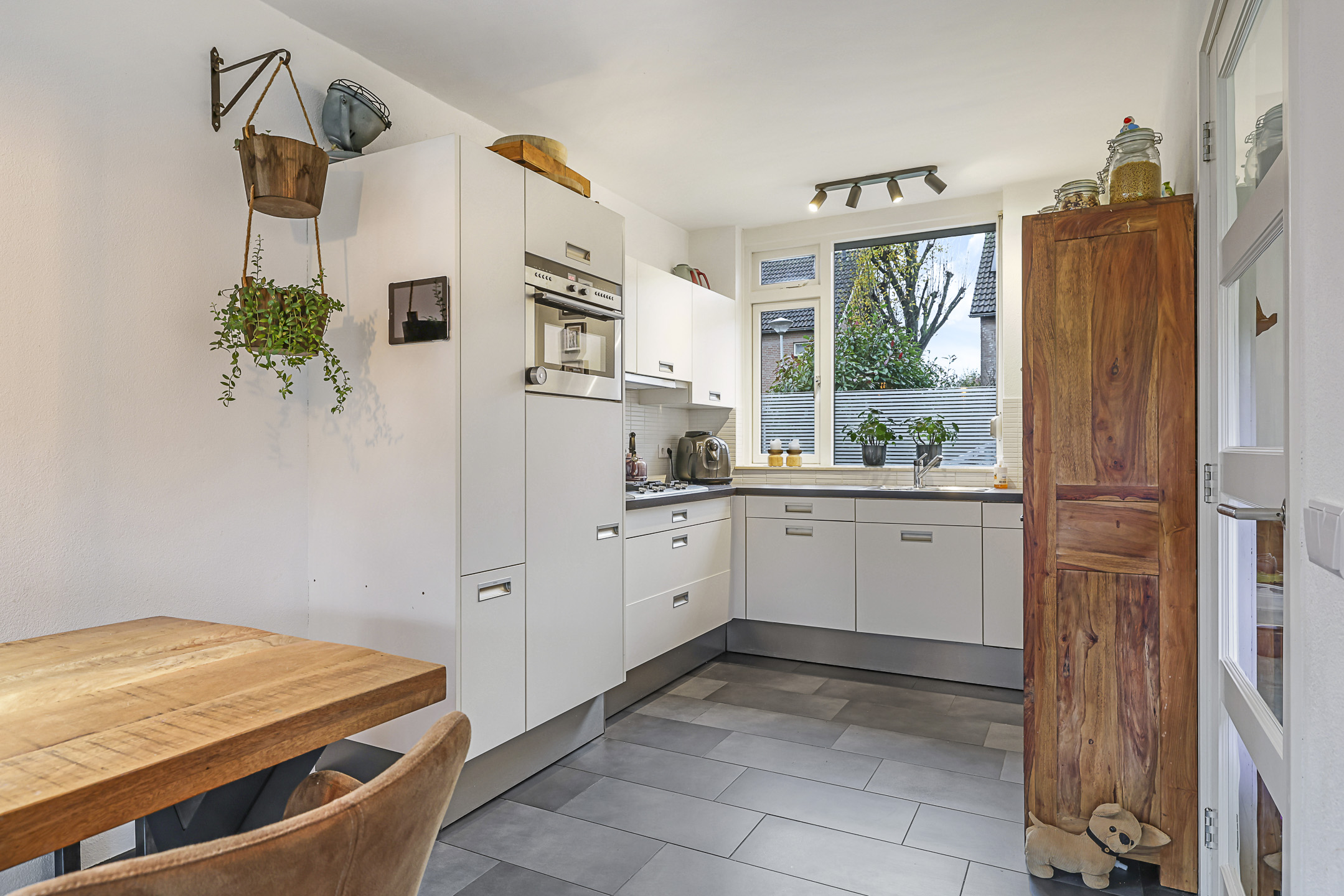De woonkamer is aan de achterzijde gelegen en daarmee tuingericht. Het grote raam zorgt niet alleen voor veel lichtinval maar je kijkt ook lekker weg in de diepe achtertuin. En doordat de woonkamer over de volle breedte van de woning is gelegen, is er ook plaats voor een grote hoekbank. De tuindeur biedt direct toegang tot het zonnige buitenterras. Comfortabel is de plavuizen vloer die voorzien is van vloerverwarming. En mocht je altijd al een houtkachel willen hebben, die mogelijkheid is er aangezien er een rookkanaal aanwezig is.