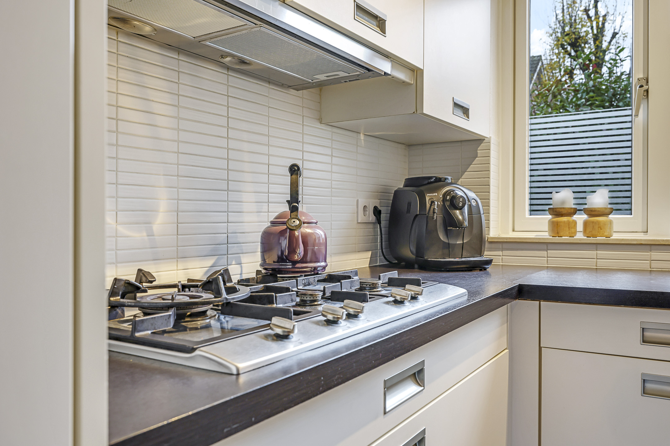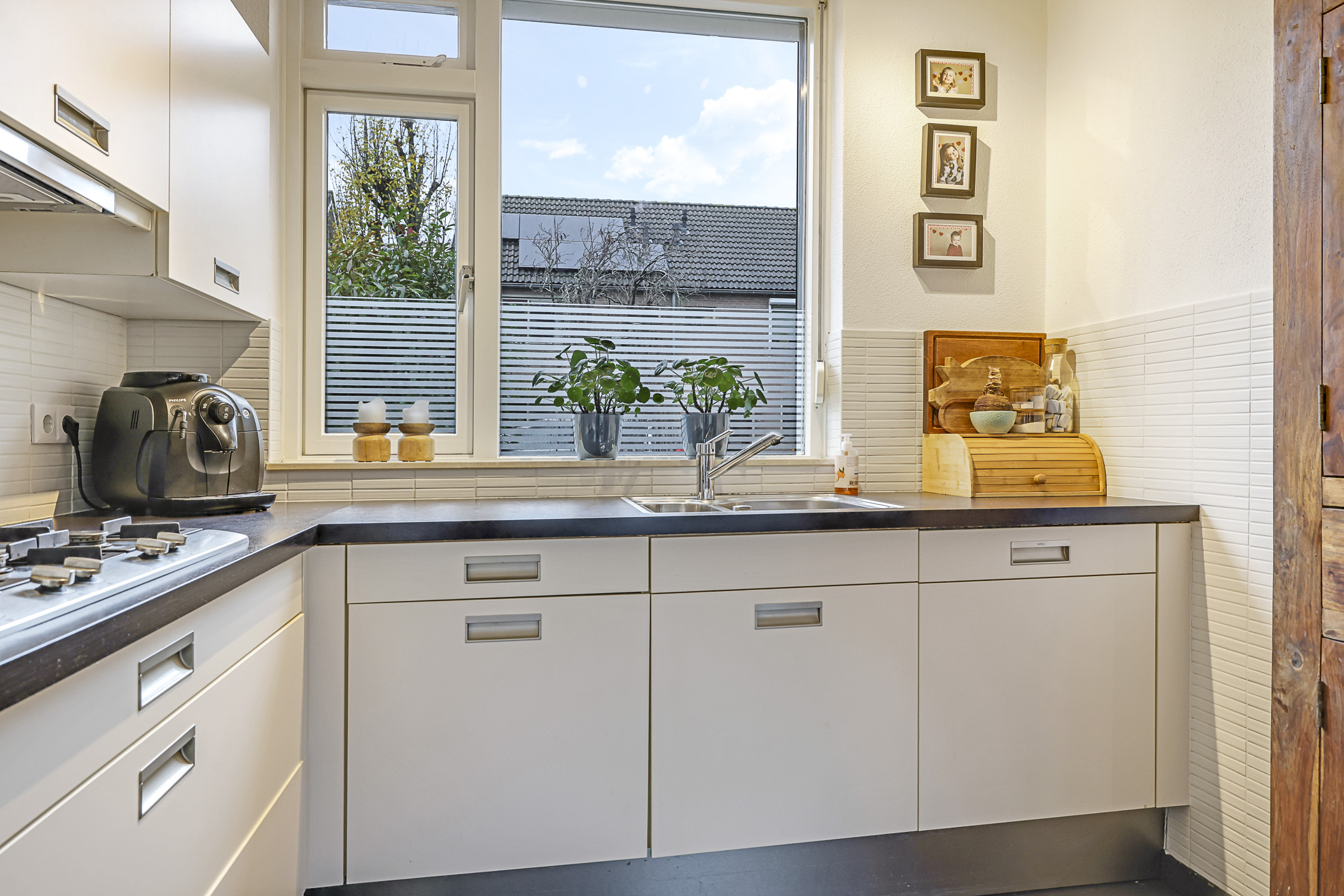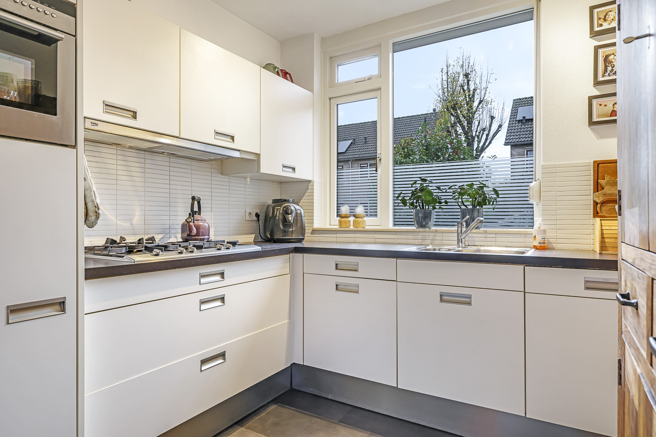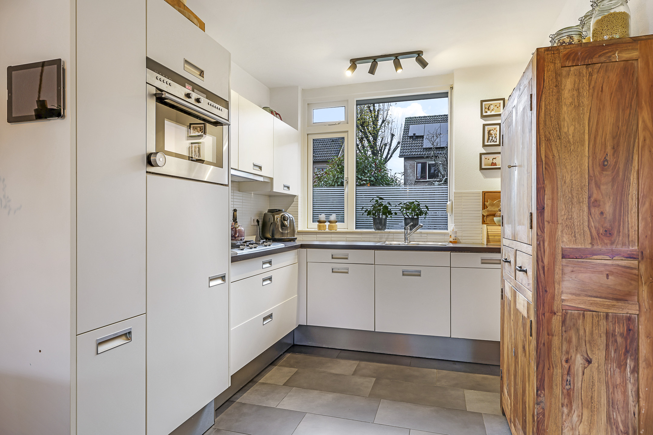 De praktische hoekkeuken heeft een neutrale uitstraling en heeft alle gebruikelijke inbouwapparatuur. Denk daarbij aan een vaatwasser, een koelkast, een combi-oven/magnetron en een 5-pits gaskookplaat met afzuiger (2024) erboven. Een close-in-boiler zorgt voor direct warm water en hoef je niet te wachten totdat het warme water uit de cv-ketel de kraan heeft bereikt. Verder zijn zowel het voorraam als het zijgevelraam af te sluiten middels een rolluik.