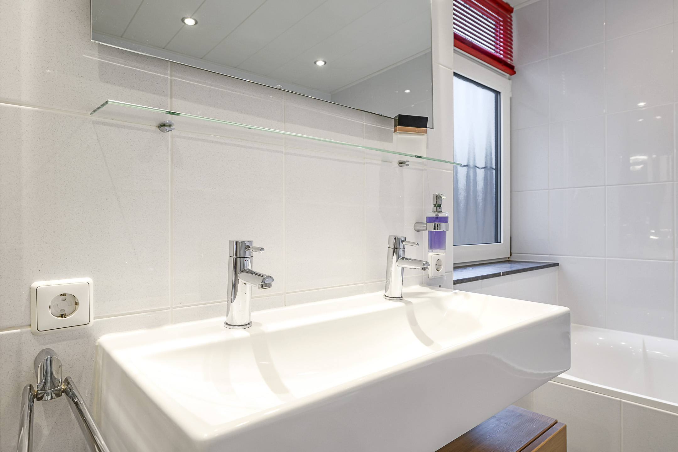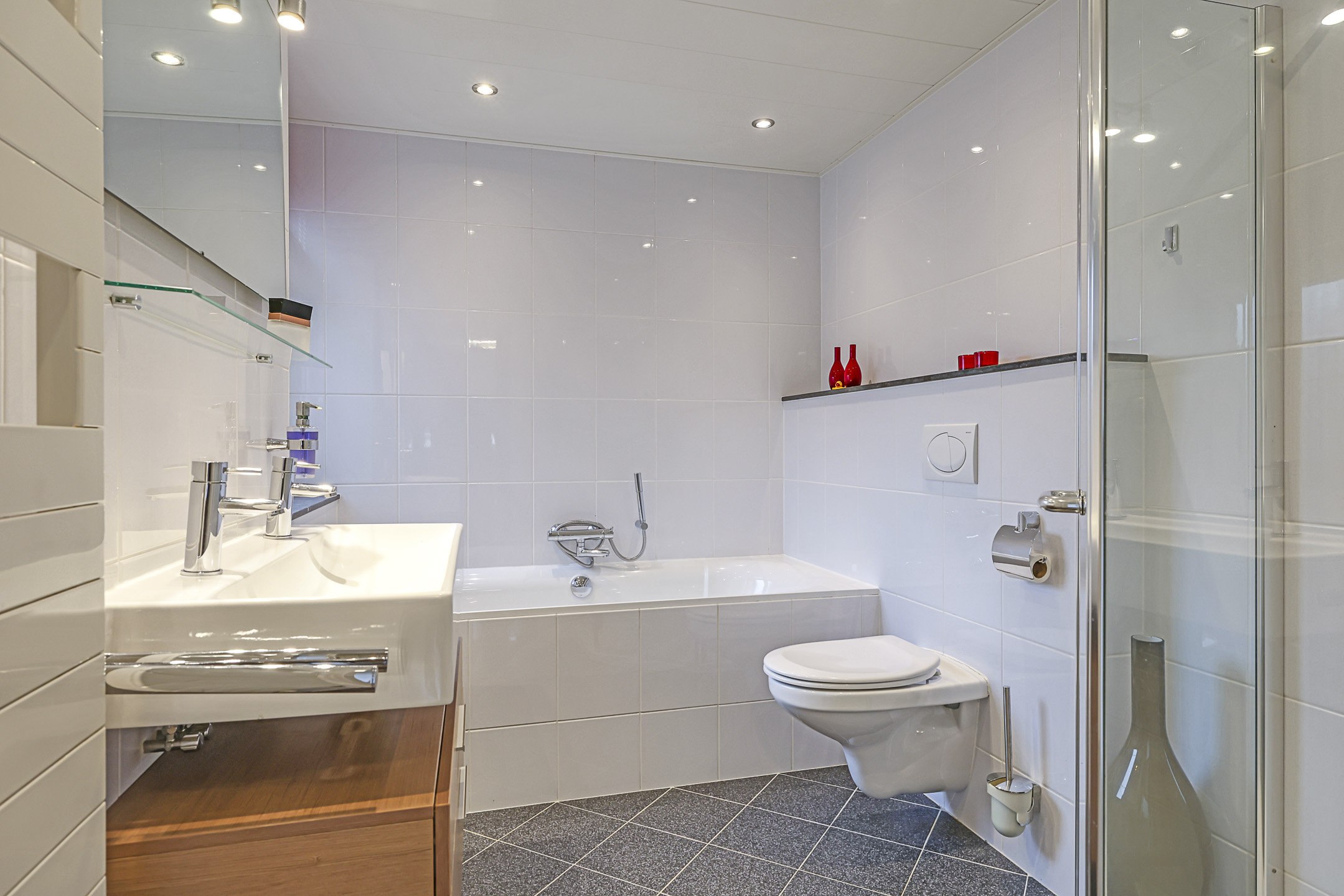 Ook de badkamer is een groot pluspunt van dit huis. Doordat deze ruim bemeten is, is er ook dankbaar gebruik gemaakt van de ruimte door deze compleet in te delen. Er is gekozen voor een ligbad én een aparte douchegelegenheid. Het brede 2-persoons wastafelmeubel biedt ook wat opbergmogelijkheden voor toiletspullen, evenals het planchet erboven. De spiegel is verwarmd en wordt vergezeld door spotverlichting. Uiteraard ontbreekt het 2e zwevend toilet niet. Er is gekozen voor hetzelfde tegelwerk en sanitair als in het toilet beneden in de hal. De aanwezige vloerverwarming zal als erg comfortabel voelen. Een handdoekradiator en inbouwspots maakt deze badkamer compleet. En niet te vergeten het nieuwe kunststof raam met draai/kiepfunctie die voor de ideale ventilatiemogelijkheid zorgt.