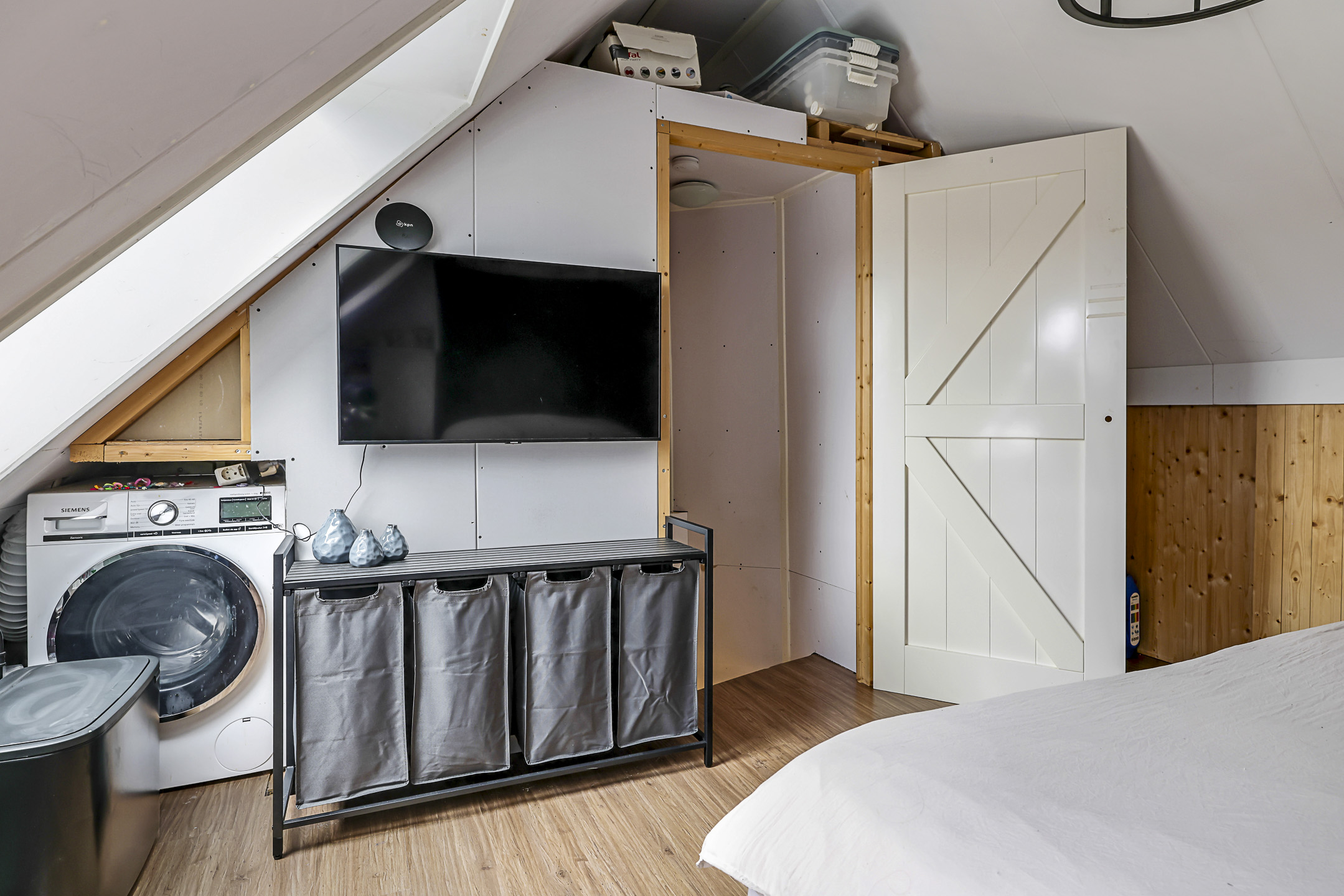 Via de vaste trapopgang bereiken we de 2e verdieping. Deze woonlaag is in gebruik als ouderslaapkamer die bij de trap middels een deur afsluitbaar is. Hier zul je nog wat afwerkpunten tegenkomen, maar er is al wel geïnvesteerd in extra dakisolatie die met gipsplaten is afgewerkt. Twee dakvensters zorgen voor de nodige lichtinval waarbij er al één dakvenster is vervangen door een nieuwe. Voor het 2e raam is het nieuwe dakvenster al aanwezig, maar dient er door de koper alleen nog ingezet te worden. Door de hoge nok (3m) voelt de kamer ruimtelijk aan. Onder de schuine dakvlakken zijn knieschotten aangebracht waar je nog de nodige (seizoen)spullen kunt opbergen. Tevens vinden we hier de wasmachine-aansluiting alsmede de cv-ketelopstelling en MV-unit (ventilatie).
