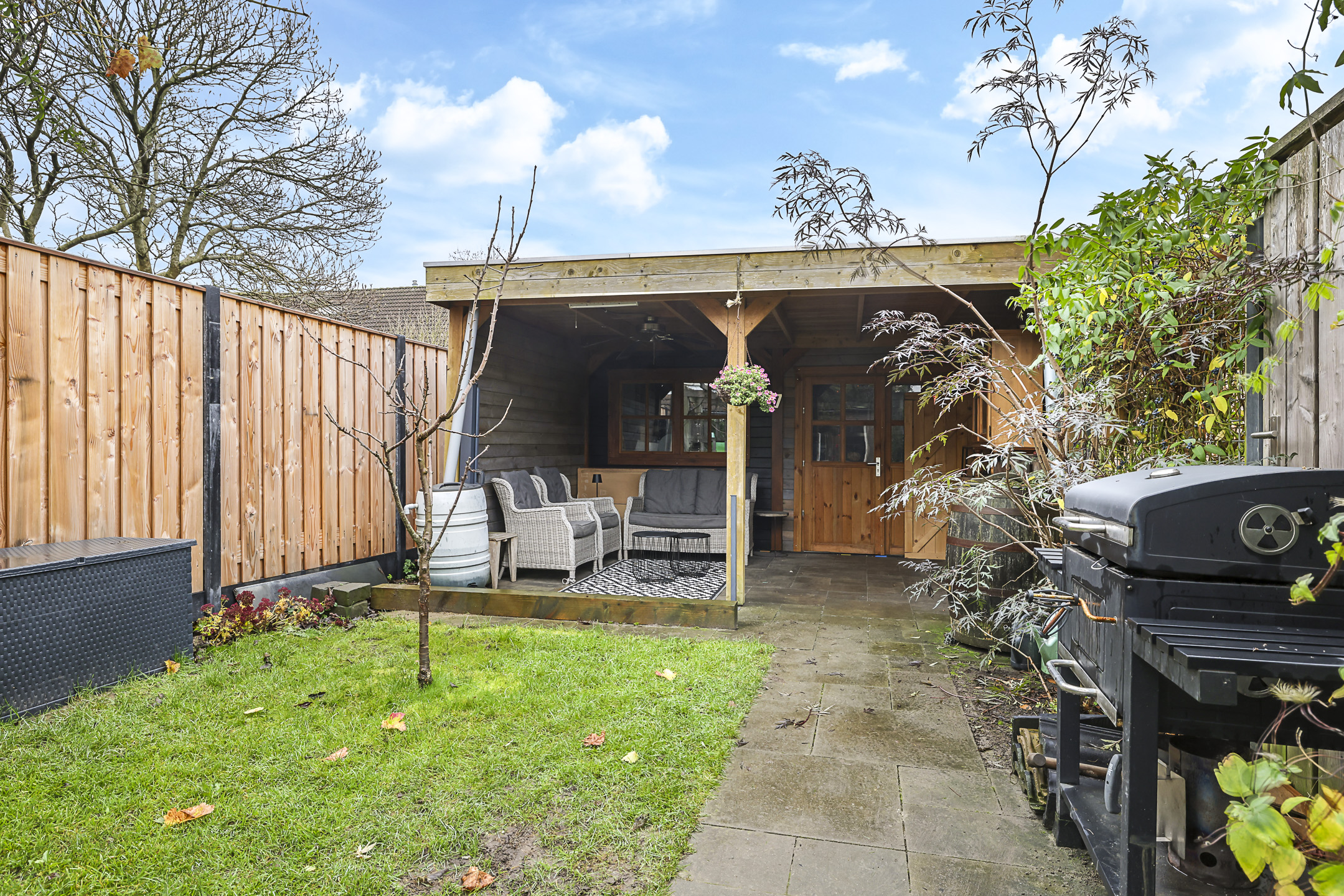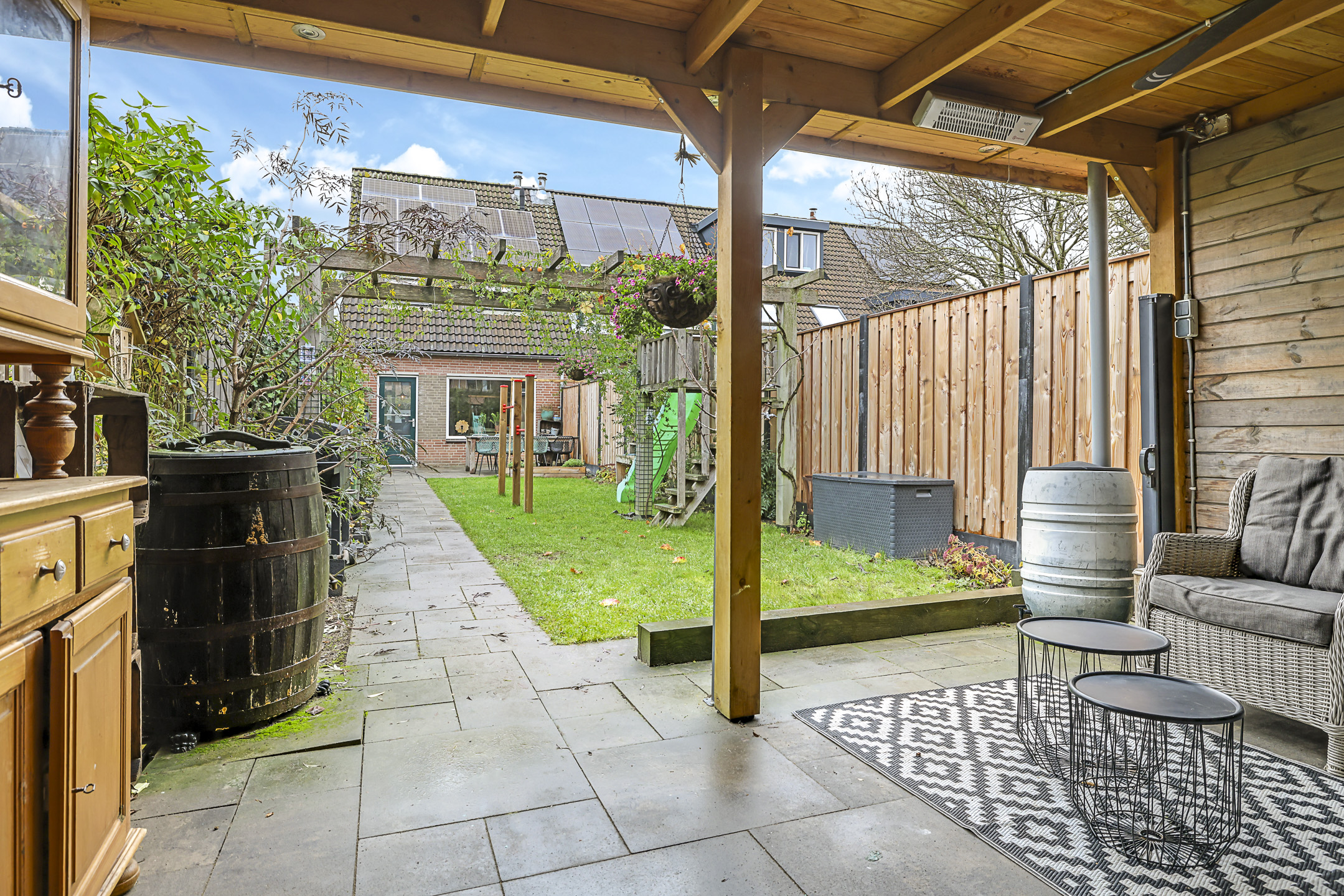 Vóór de schuur is een fraaie veranda gemaakt. Deze is net zo breed als de schuur en biedt een heerlijk, beschut terras op de warme zomerdag. De tuin ligt pal op het zuiden waardoor het ook veel zonuren heeft. Een fraaie pergola zorgt voor een groen karakter in de tuin. En mocht je nog enkele speeltoestellen voor kinderen zoals een trampoline en/of schommel willen plaatsen, dan is hier nog ruimte genoeg voor.