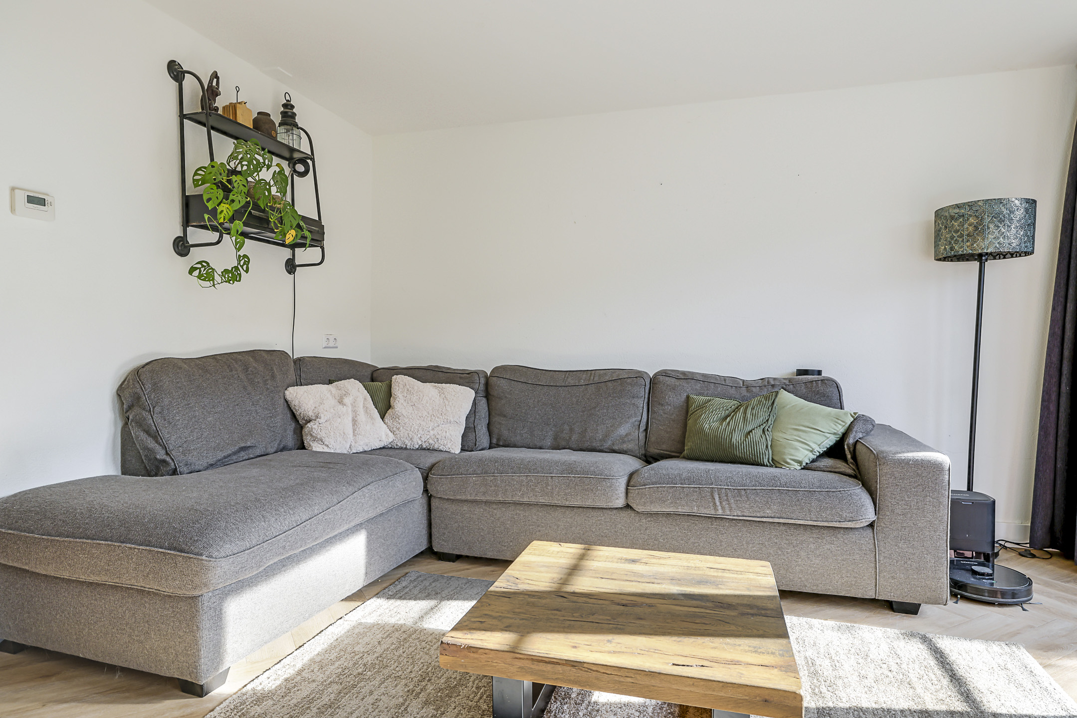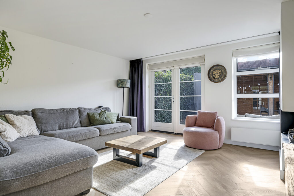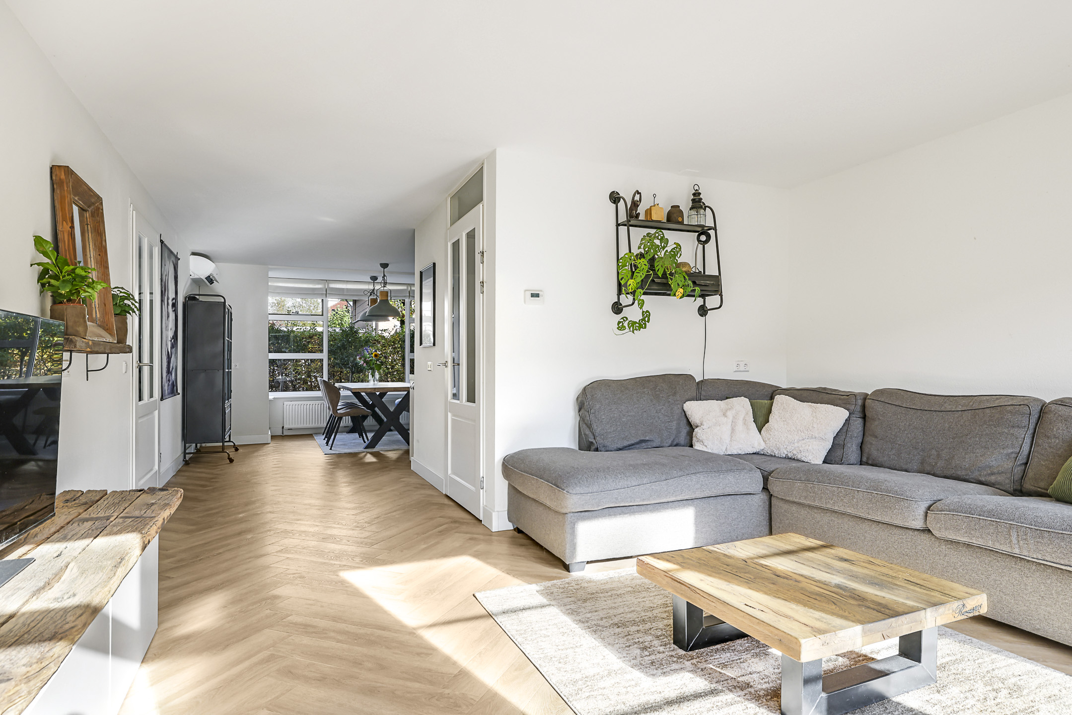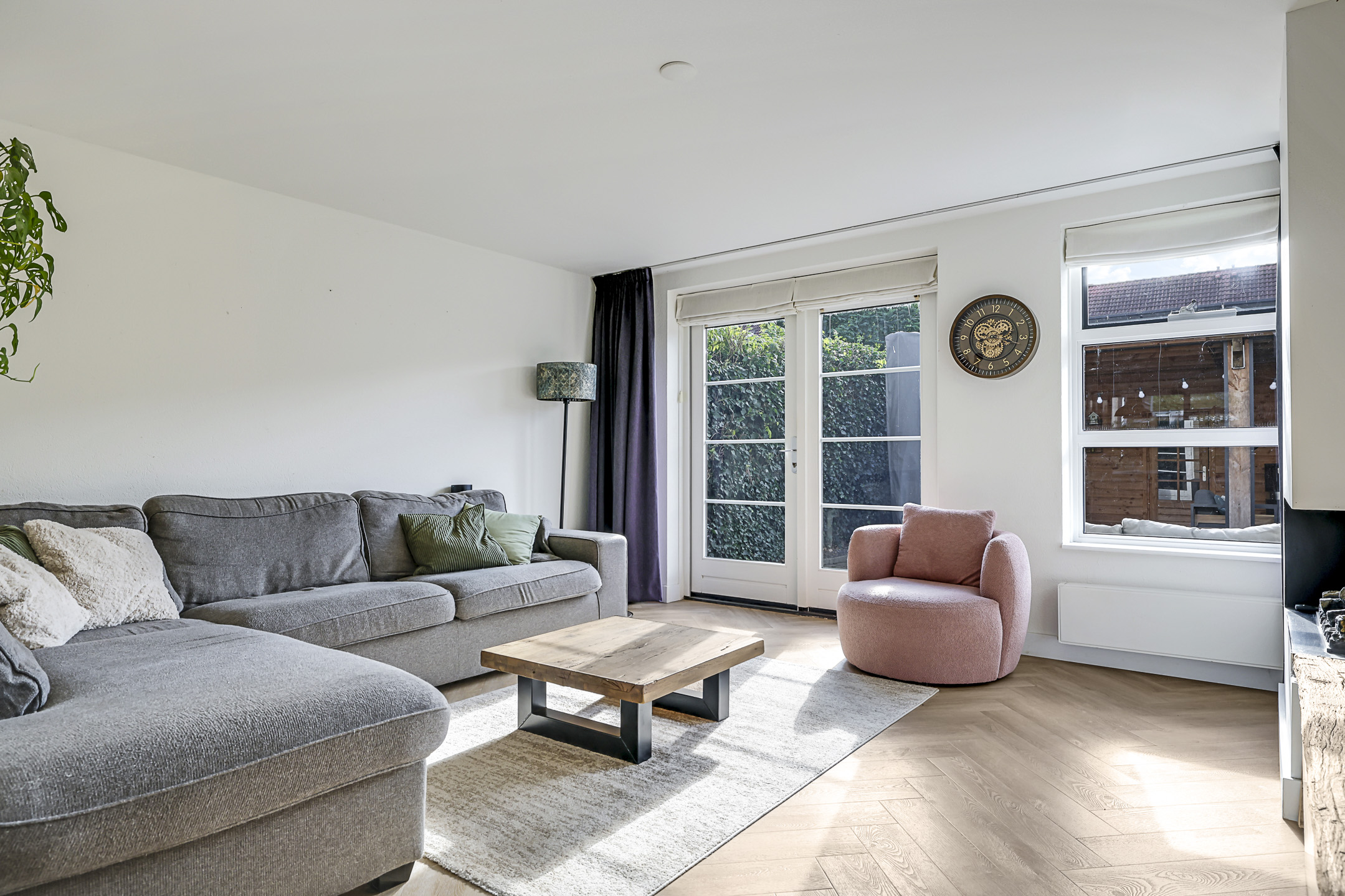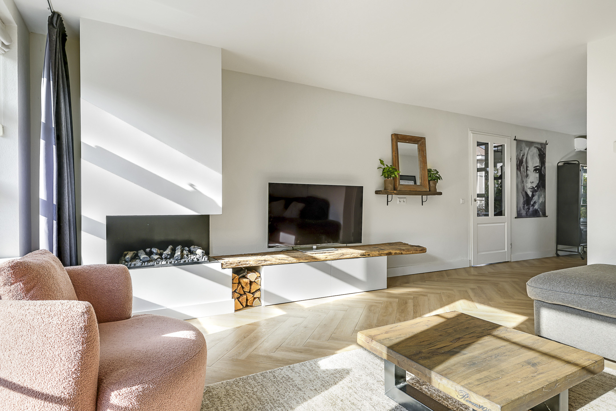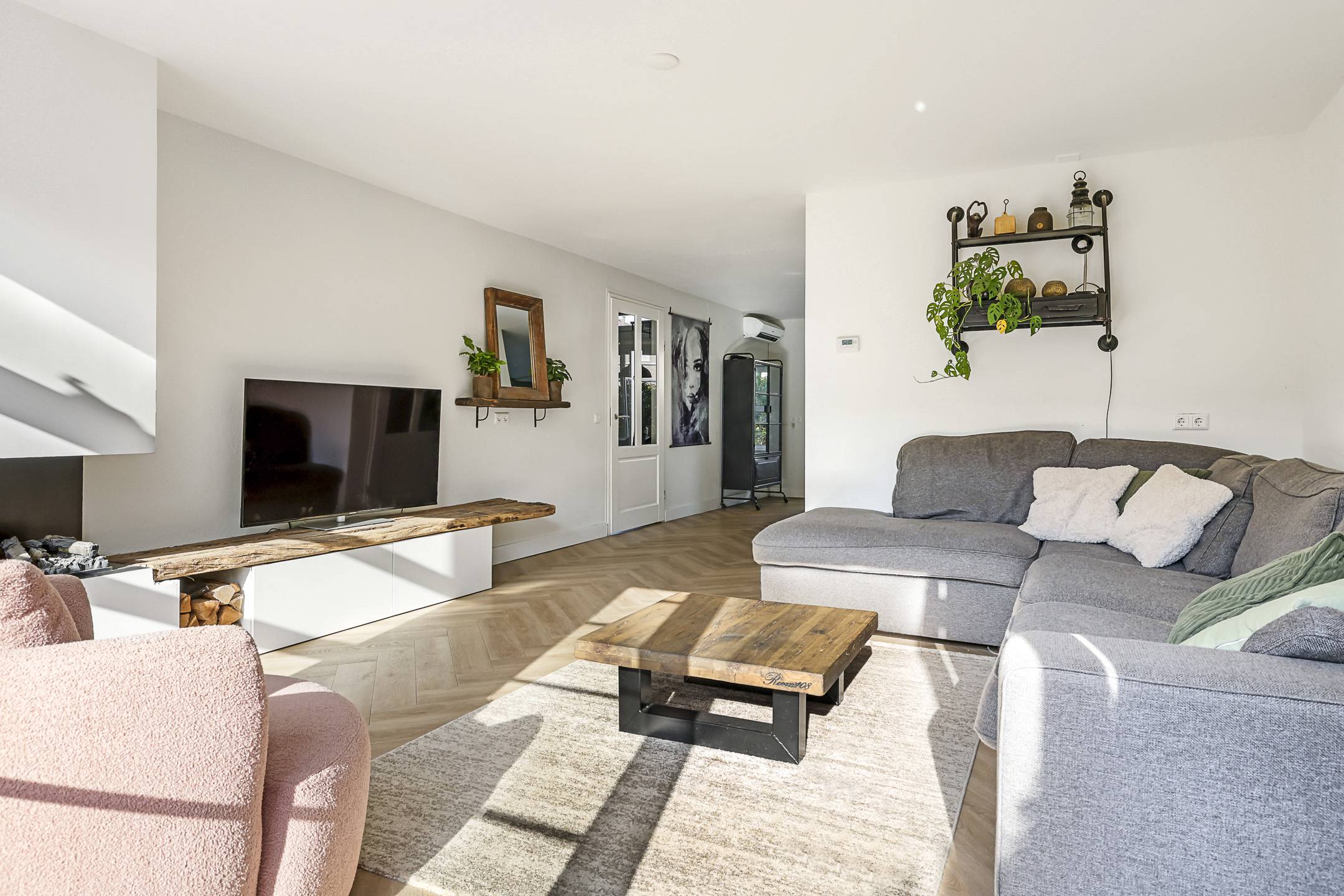 Wanneer je via de ruime hal de woonkamer binnenkomt voelt de ruimte gelijk aangenaam aan. In de achtergevel zijn grote raampartijen aanwezig met dubbele tuindeuren waardoor je hier in de zomerdag alles bij elkaar kan betrekken. De visgraat pvc-vloer met vloerverwarming staat bij menigeen op het wensenlijstje. De ruimte is goed bemeten waardoor je hier een grote hoekbank kan plaatsen. In de hoek van de kamer is een sierhaard (waterdamp) geplaatst wat zorgt voor veel sfeer. Door de aanwezige airco behoud je hier het hele jaar door een fijne temperatuur.