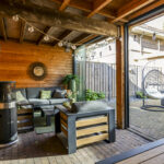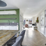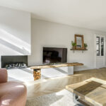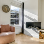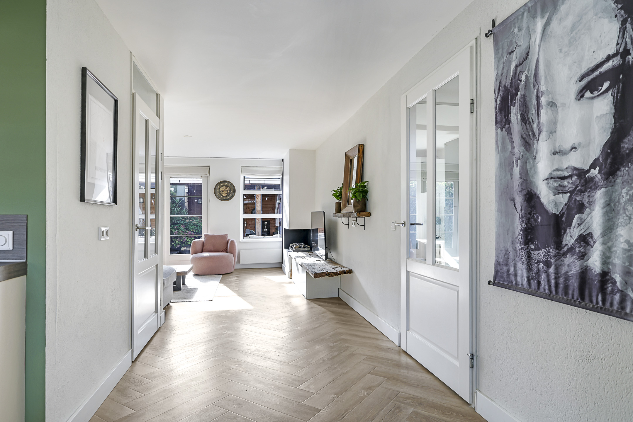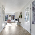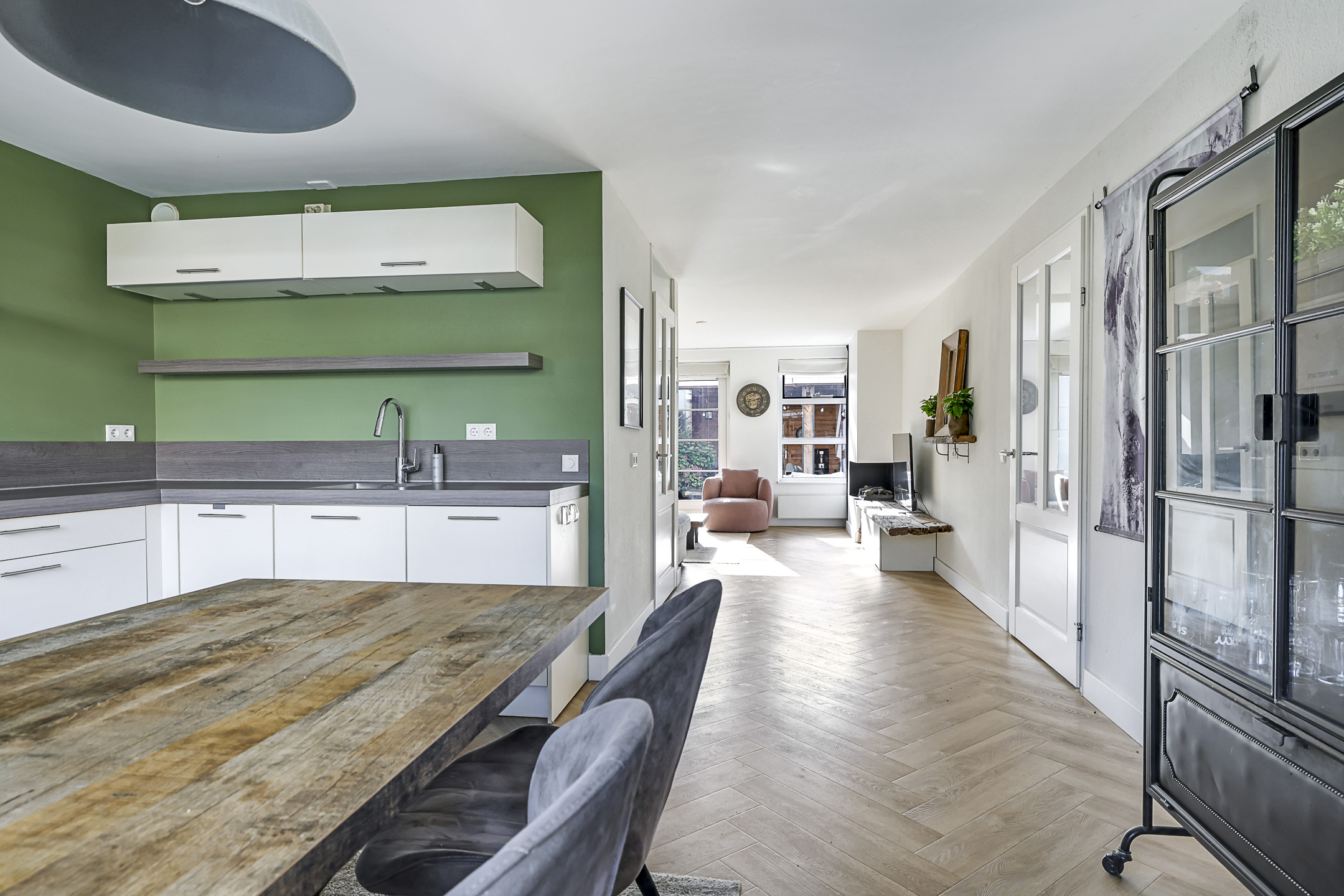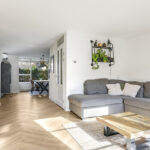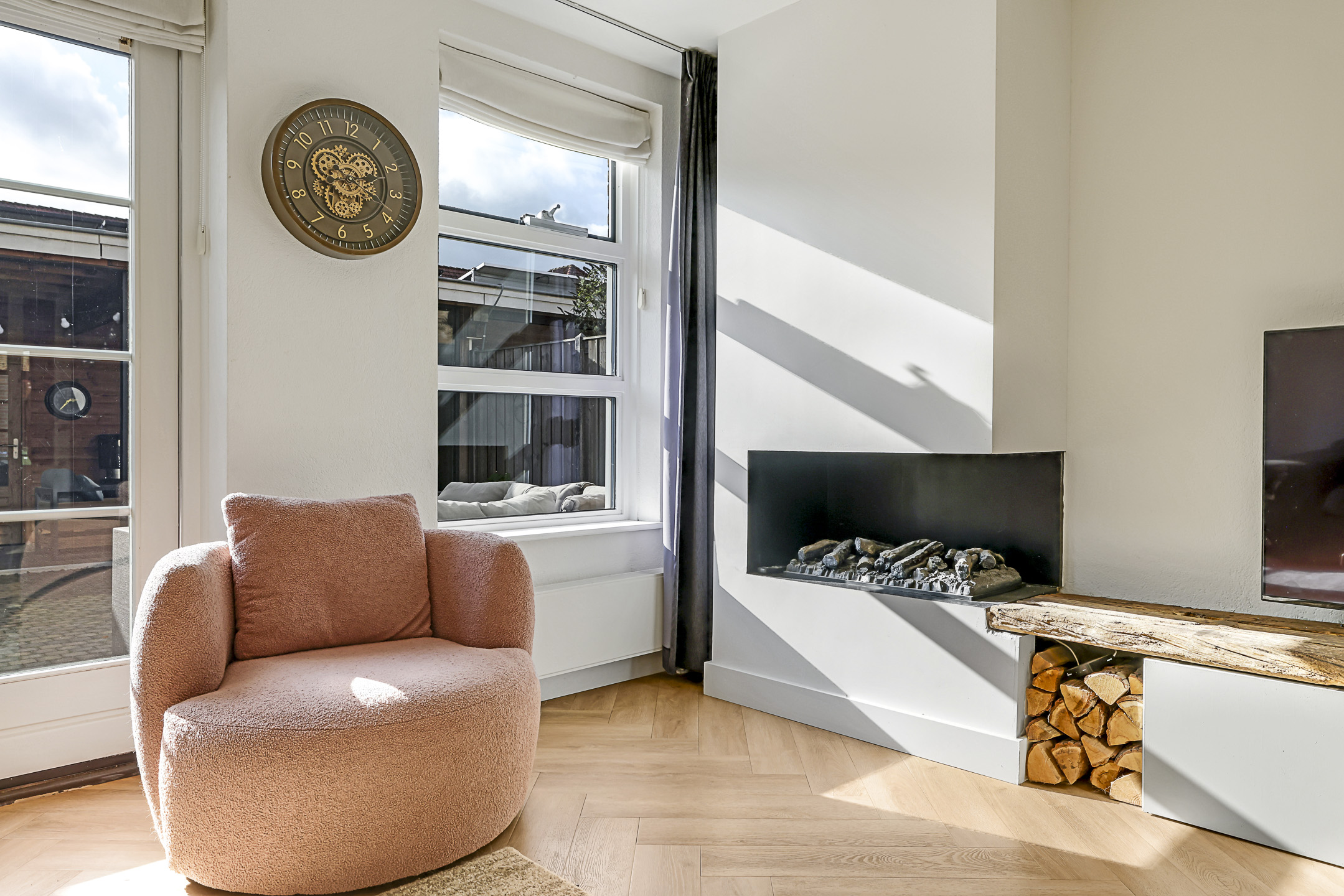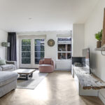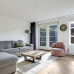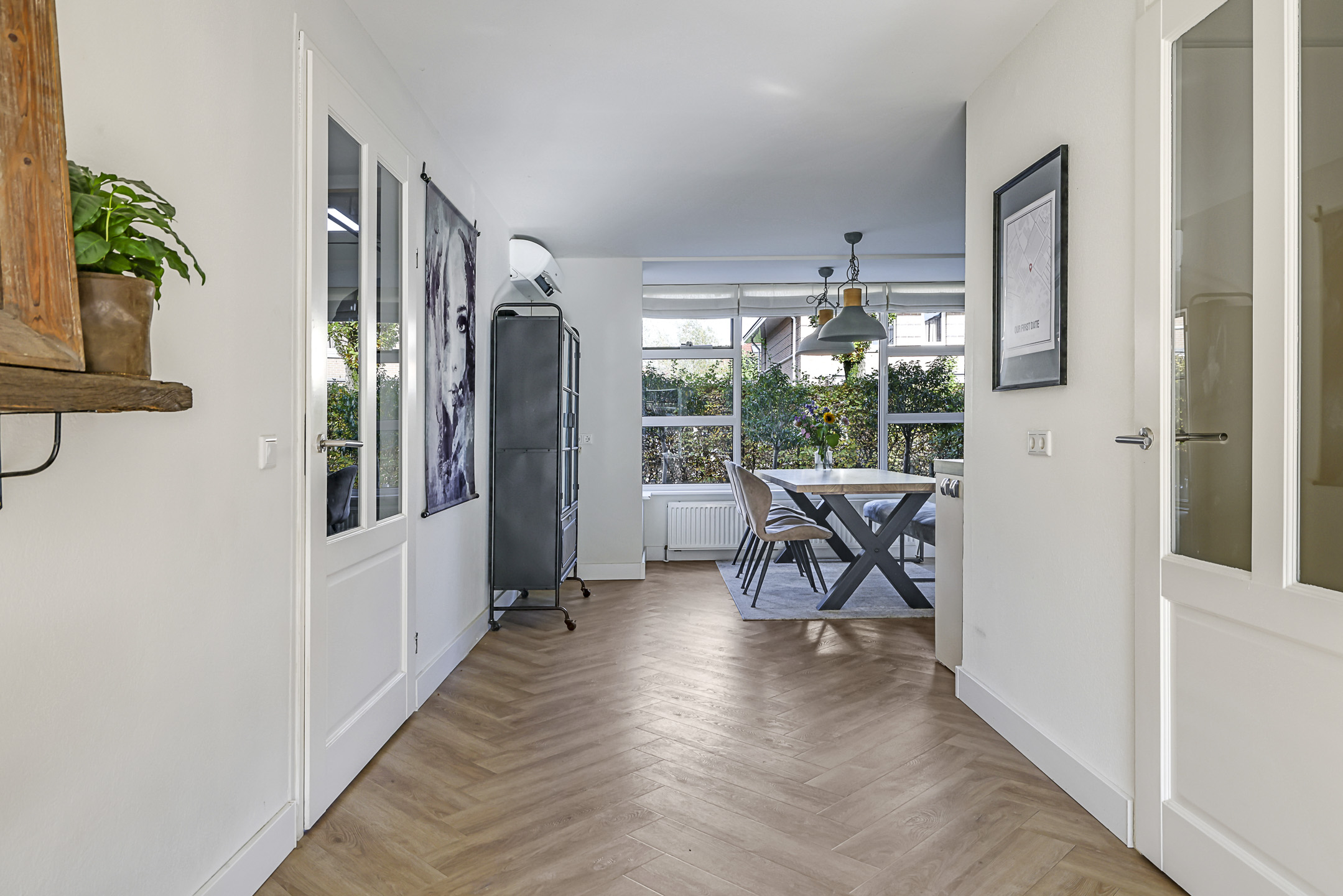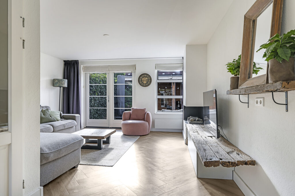 Wanneer je via de ruime hal de woonkamer binnenkomt voelt de ruimte gelijk aangenaam aan. In de achtergevel zijn grote raampartijen aanwezig met dubbele tuindeuren waardoor je hier in de zomerdag alles bij elkaar kan betrekken. De visgraat pvc-vloer met vloerverwarming staat bij menigeen op het wensenlijstje. De ruimte is goed bemeten waardoor je hier een grote hoekbank kan plaatsen. In de hoek van de kamer is een sierhaard (waterdamp) geplaatst wat zorgt voor veel sfeer. Door de aanwezige airco behoud je hier het hele jaar door een fijne temperatuur.
