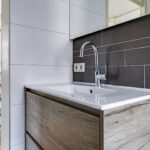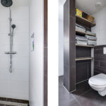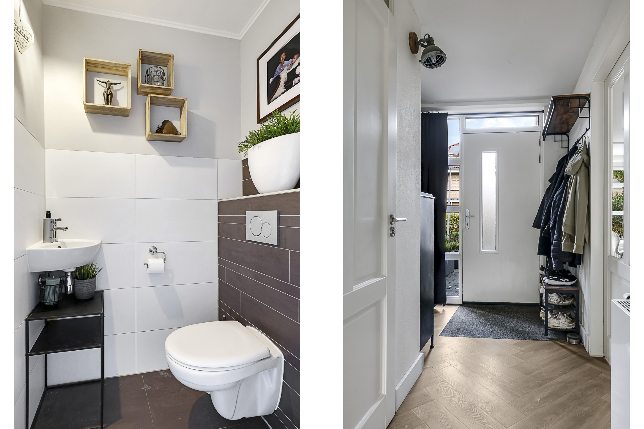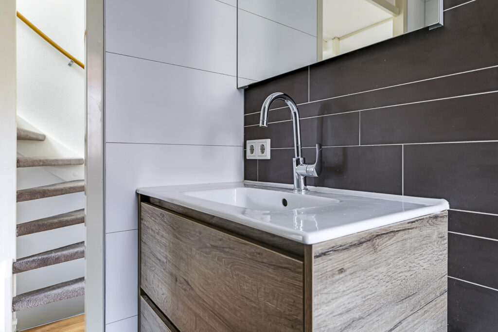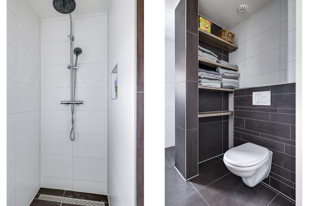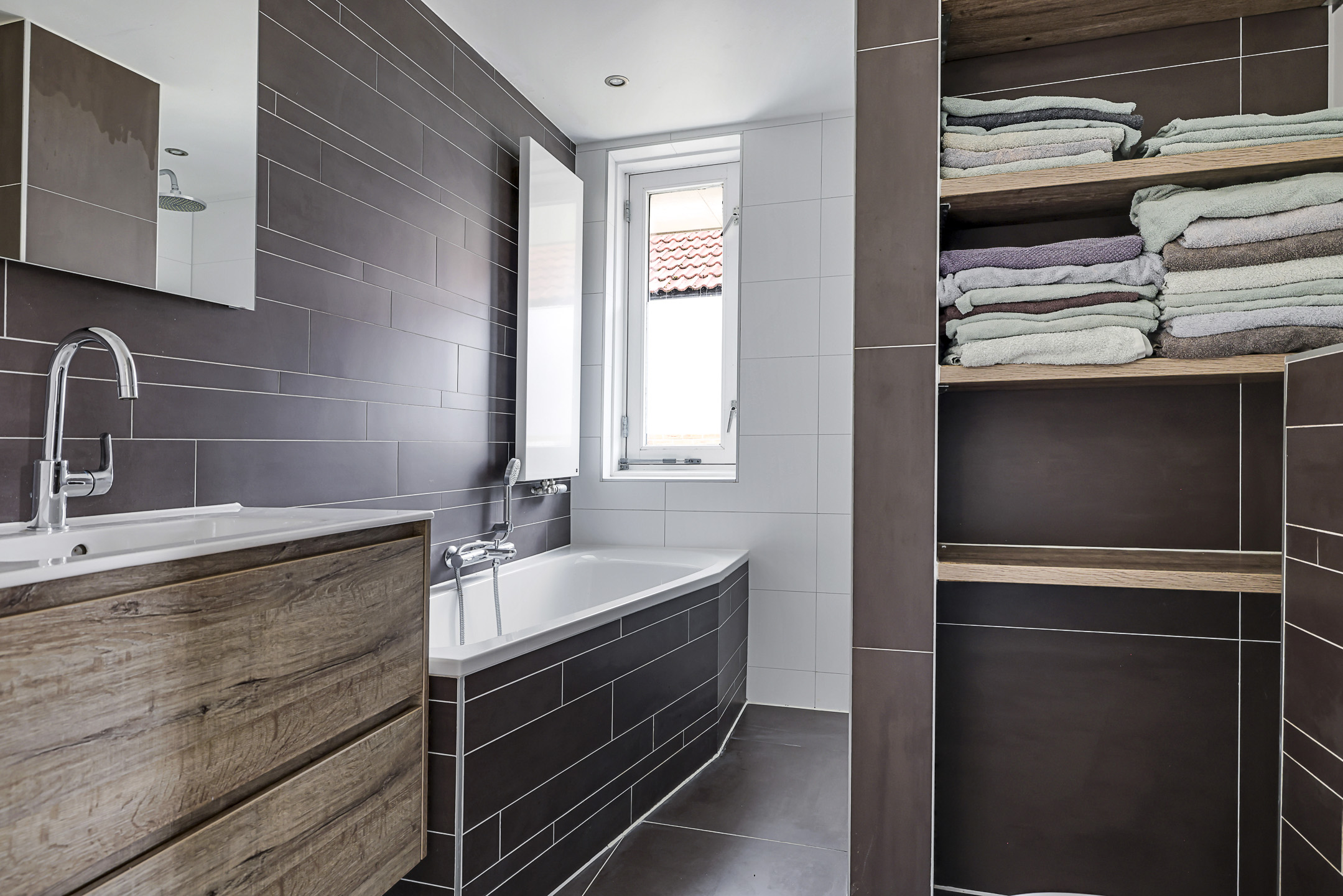 De badkamer is slechts een paar jaar oud en dat zie je in de ruimte terug. Er is gekozen voor een inloopdouche, een ligbad, een wastafelmeubel en een toilet waardoor al het wenselijke sanitair aanwezig is. De handdoeken kan je kwijt op de schapjes welke zijn verwerkt in de scheidingswand van de douche. Meer opbergruimte tref je in de lades van het wastafelmeubel. Een groot raam zorgt voor een fijne ventilatiemogelijkheid, al is er ook mechanische ventilatie aanwezig.