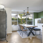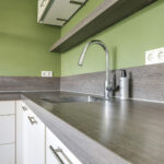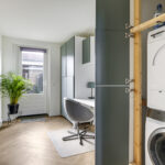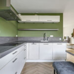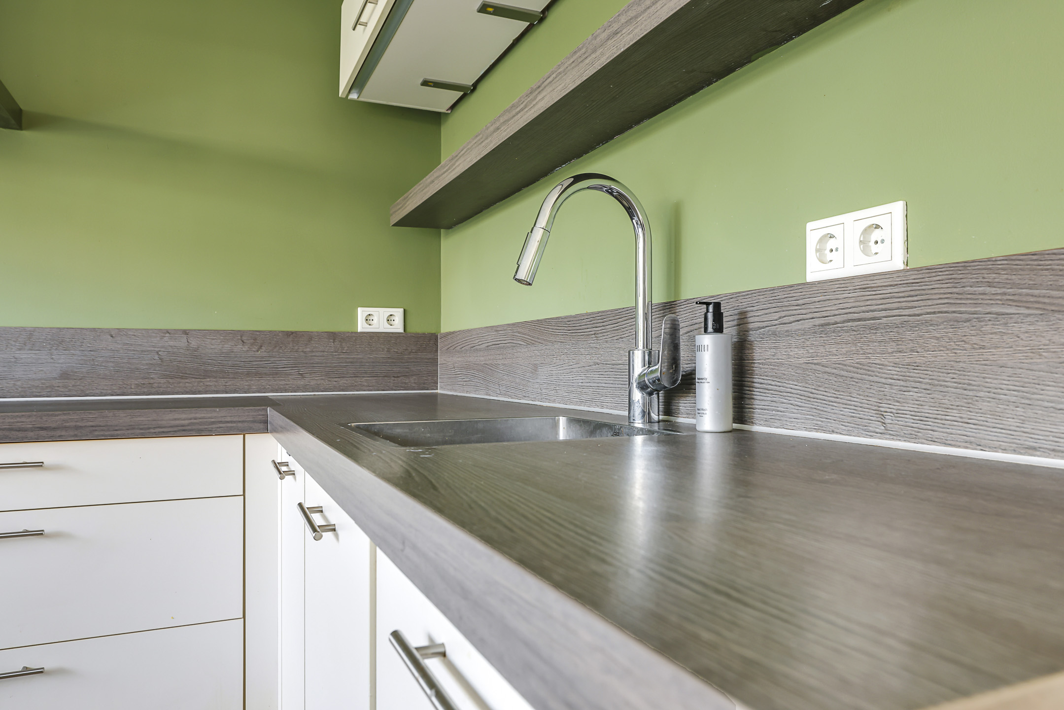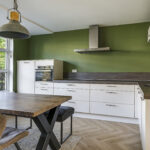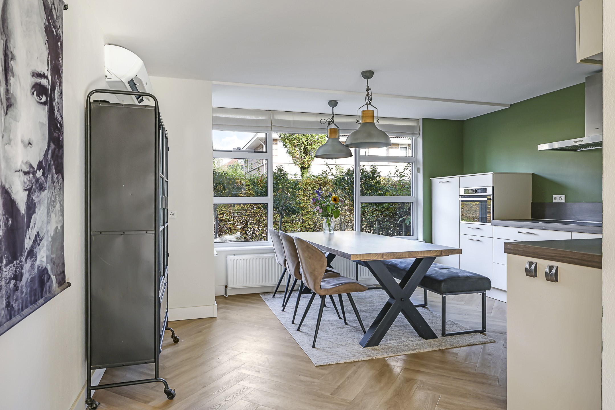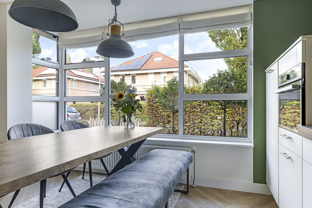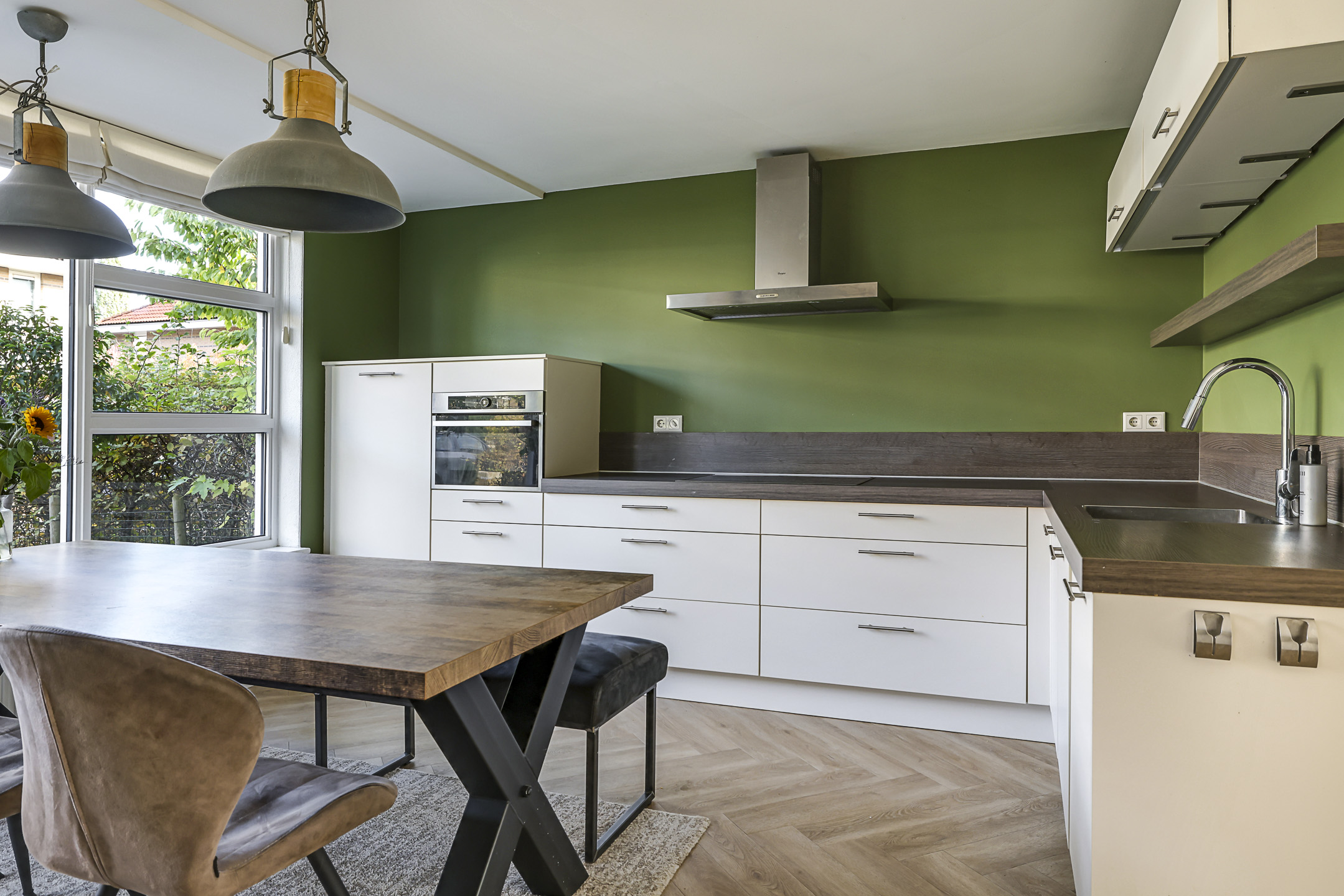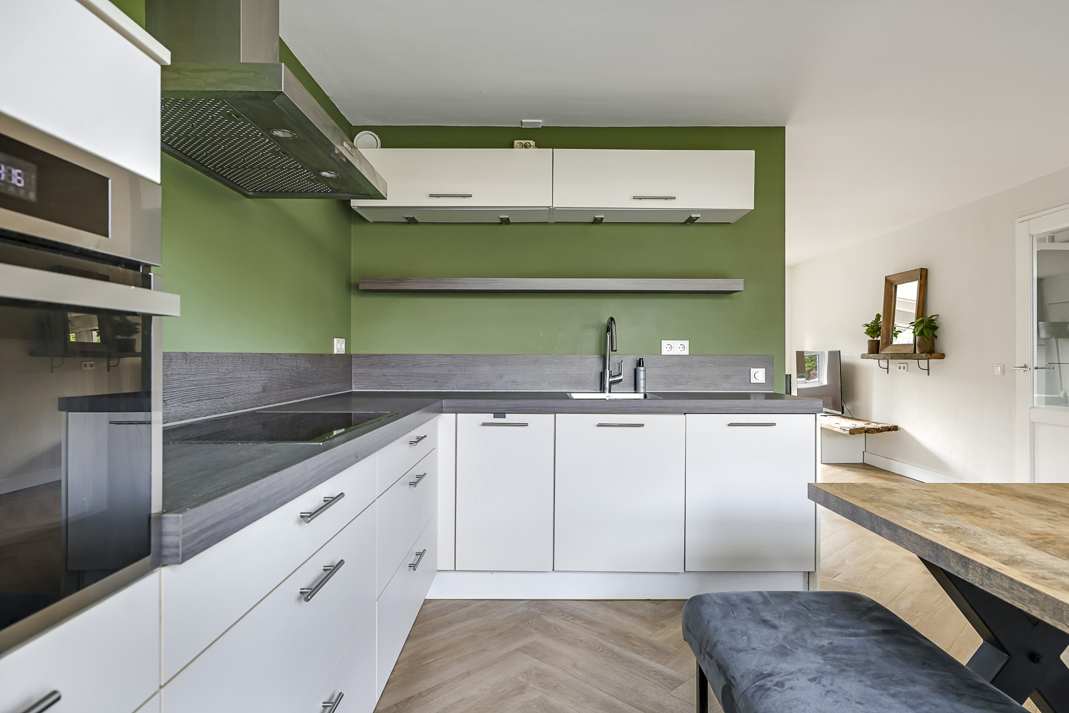 Aan de voorzijde van de woning is een erker geplaatst wat zorgt voor een speels effect en veel lichtinval in de keuken. Deze keuken betreft een ware leefkeuken aangezien je hier met gemak een 6-persoons eettafel kan plaatsen. Het keukenblok is in een hoekopstelling geplaatst met slechts enkele bovenkast wat zorgt voor een ruimtelijk effect. Brede ladekorven zorgen voor de nodige opbergruimte. De aanwezige inbouwapparatuur bestaat uit een 4-pits inductiekookplaat, een afzuigkap, een combi-oven/magnetron en een koelkast.