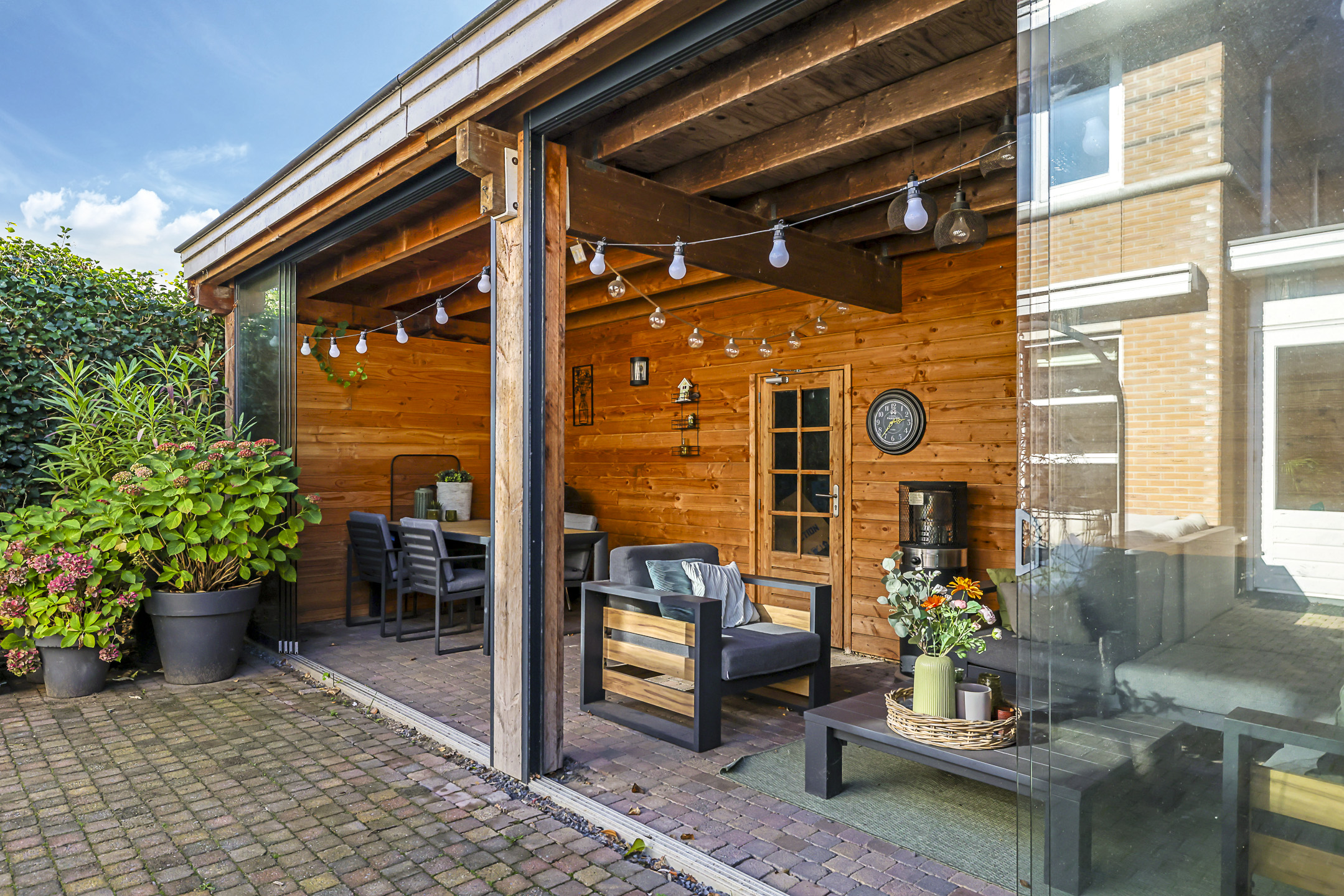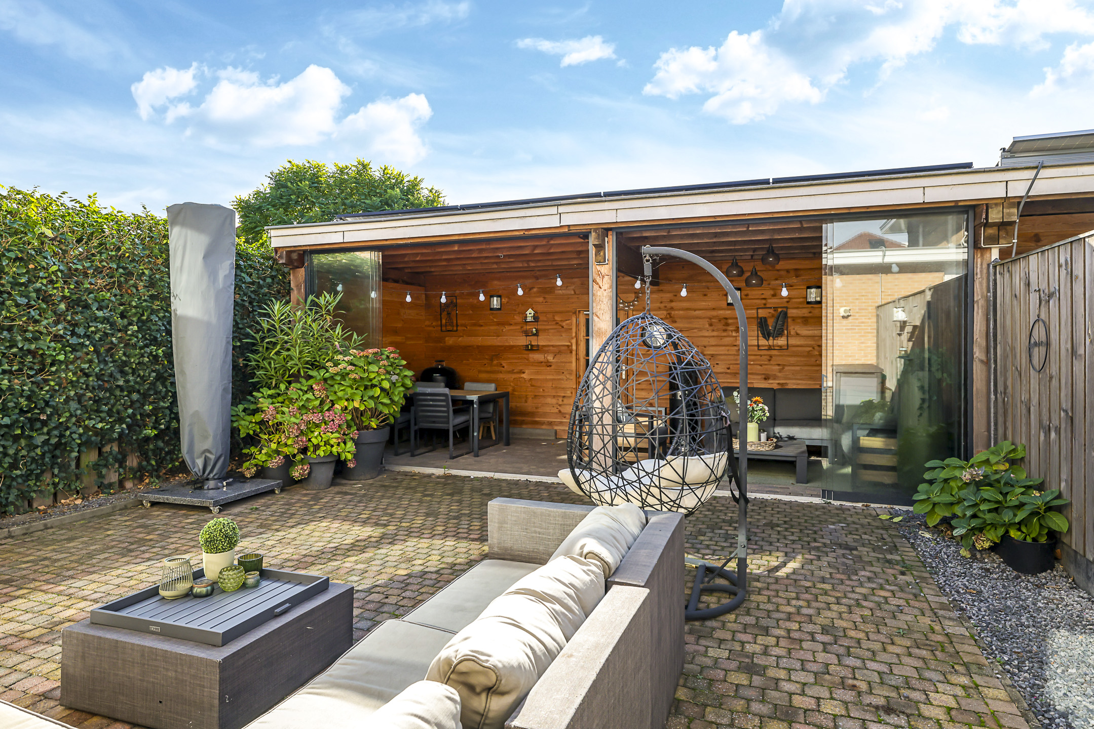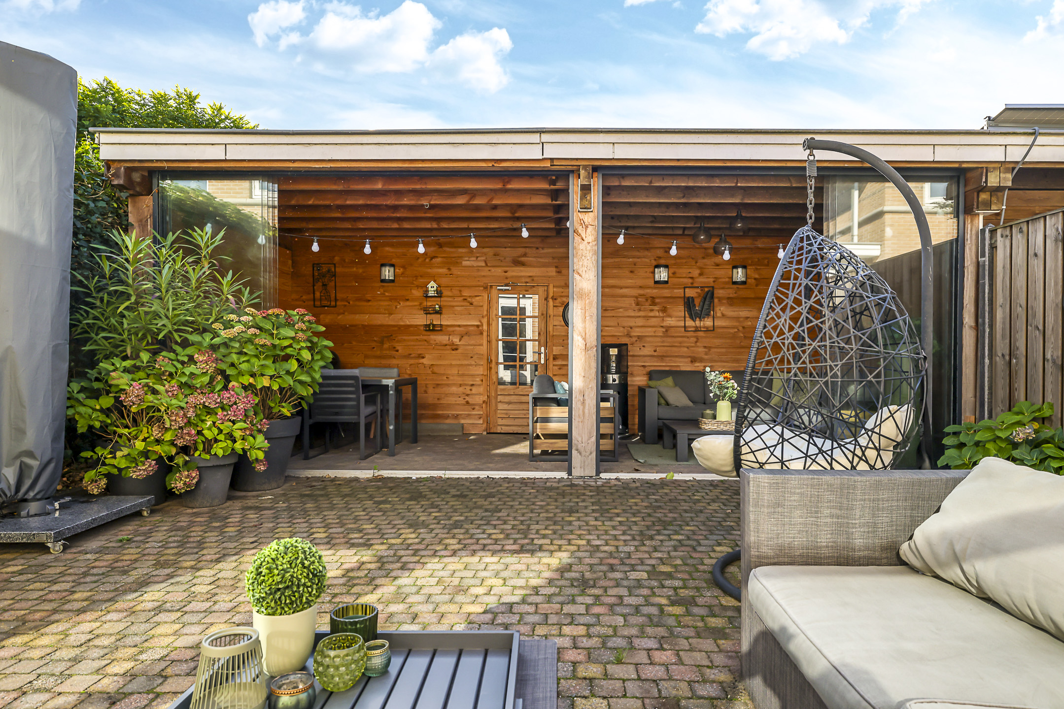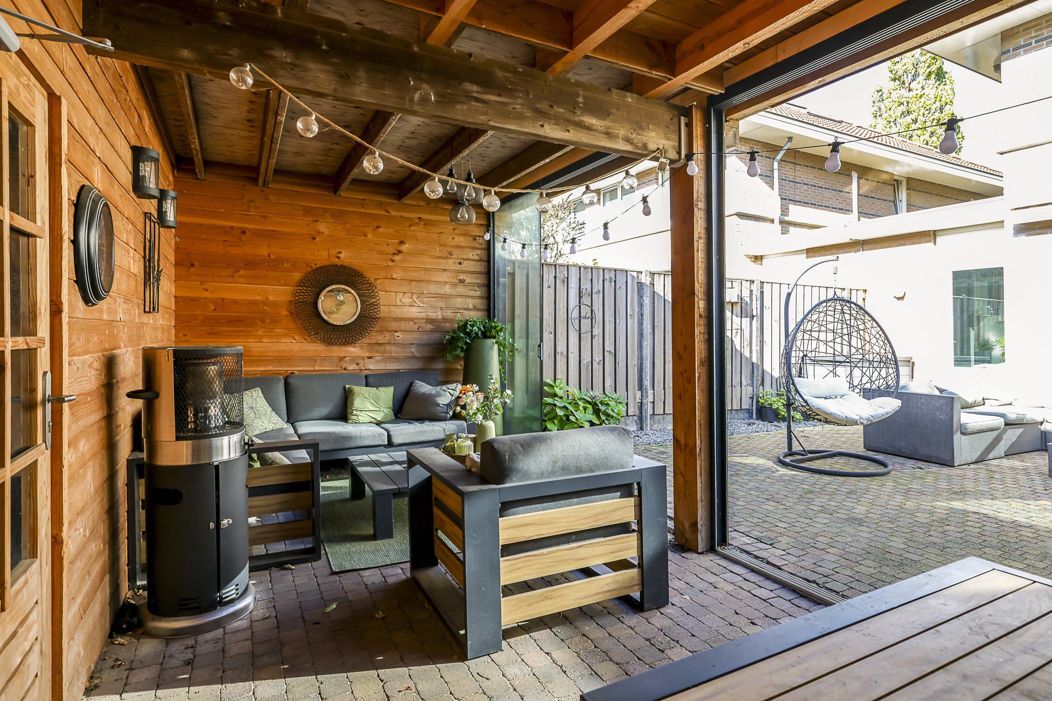 Bij de woning hoort een comfortabele, onderhoudsvriendelijke achtertuin. De tuin is voorzien van een groot terras waarbij een elektrische bedienbare zonwering voor de nodige schaduw kan zorgen. In de zomerdag zal je hier dankbaar gebruik van maken gezien de tuin op het zuidwesten is gelegen. Er is een tuinkamer geplaatst over de volle breedte tuin. Glazen schuifwanden zorgen dat je deze ruimte geheel kan afsluiten waardoor je hier ook bij lagere temperaturen nog heerlijk kan zitten. Via deze tuinkamer heb je toegang tot de achtergelegen schuur. Doordat deze eveneens over de volle breedte is geplaatst heb je hier met 18m² meer dan genoeg opbergruimte. Via de schuur heb je toegang tot de achtergelegen weg.