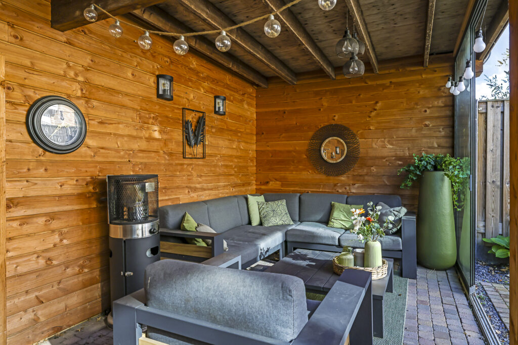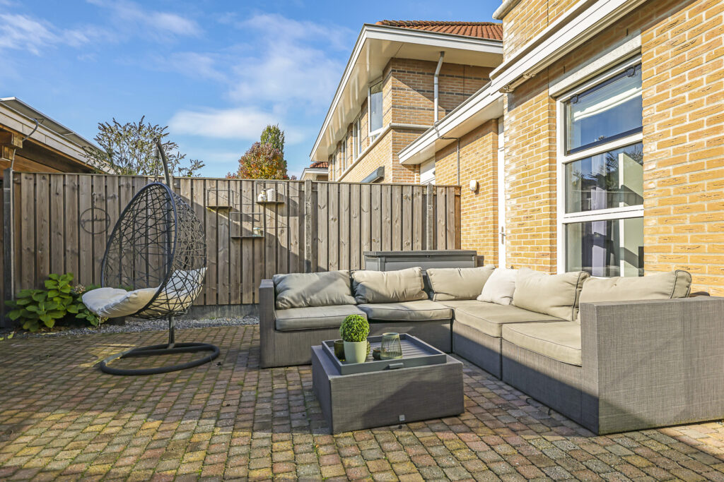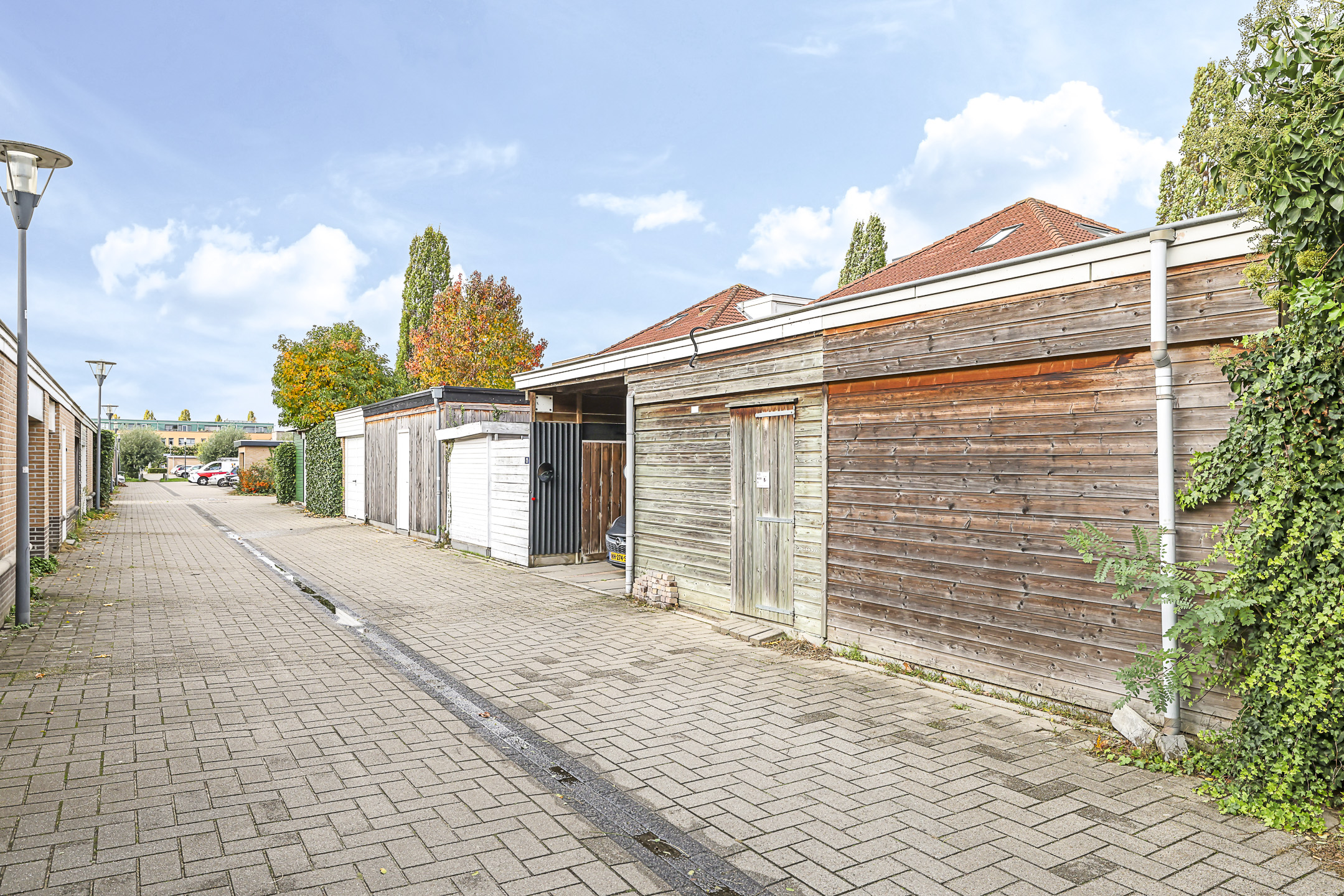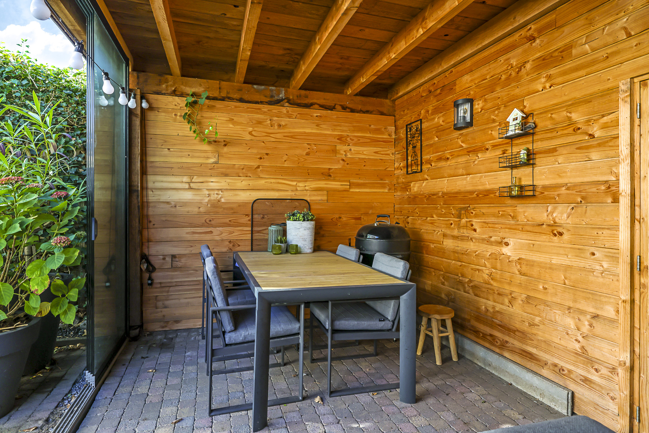Bij de woning hoort een comfortabele, onderhoudsvriendelijke achtertuin. De tuin is voorzien van een groot terras waarbij een elektrische bedienbare zonwering voor de nodige schaduw kan zorgen. In de zomerdag zal je hier dankbaar gebruik van maken gezien de tuin op het zuidwesten is gelegen. Er is een tuinkamer geplaatst over de volle breedte tuin. Glazen schuifwanden zorgen dat je deze ruimte geheel kan afsluiten waardoor je hier ook bij lagere temperaturen nog heerlijk kan zitten. Via deze tuinkamer heb je toegang tot de achtergelegen schuur. Doordat deze eveneens over de volle breedte is geplaatst heb je hier met 18m² meer dan genoeg opbergruimte. Via de schuur heb je toegang tot de achtergelegen weg.